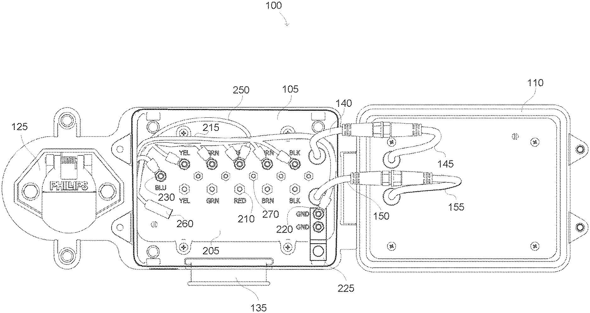 receiving a plurality of lamp power signals at a first plurality of posts; conducting each lamp power signal from a corresponding post in the first plurality of posts through a respective monitoring circuit to a corresponding post in a second plurality of posts to measure a voltage and a current of each lamp power signal to determine a status of a plurality of lamps in a towable asset; receiving an auxiliary power signal at an auxiliary power post and distributing the auxiliary power signal from the auxiliary power post to an auxiliary circuit in the towable asset; performing a power line communication with the auxiliary circuit using the auxiliary power signal to obtain a status of the auxiliary circuit; and transmitting the status of the plurality of lamps and the status of the auxiliary circuit through a telematics transceiver to a user. 13. The method of 14. The method of determining a location of the towable asset; and transmitting the locating of the towable asset through the telematics transceiver to the user. 15. The method of powering the telematics transceiver using a battery responsive to an absence of the auxiliary power signal. 16. A nose box for a towable asset, comprising: