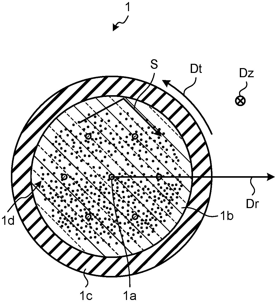 [0043]In an identical manner, it is desirable that the air bubbles 1d have a substantially uniform distribution in the radial direction Dr. Moreover, it is desirable that the air bubbles 1d have a substantially uniform distribution in the radial direction of the core portions 1a. Furthermore, it is desirable that the air bubbles 1d have a substantially uniform distribution in the axial-rotation direction Dt. In that case, in the axial-rotation direction Dt, the positions of the air bubbles 1d within the range between 0° to 60° from the reference angle position may be different than the positions of the air bubbles 1d within the range between 60° to 120° from the reference angle position. Moreover, it is also desirable that the air bubbles 1d have a substantially uniform distribution in the axial-rotation direction of the core portions 1a.
