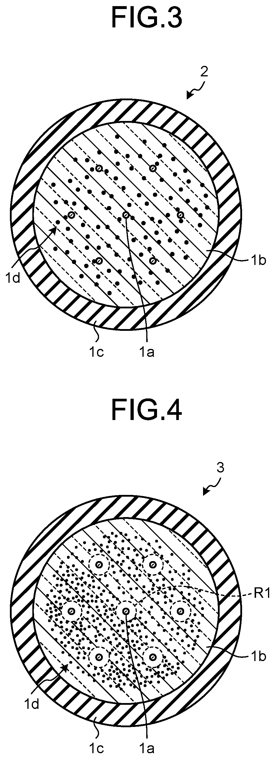 [0049]Each region R1 is formed in a concentric manner with respect to the corresponding core portion 1a; has the diameter, for example, equal to or greater than triple the core diameter of the corresponding core portion 1a; and has a circular tube shape extending in the axial direction Dz along the corresponding core portion 1a. Moreover, the regions R1 do not include the air bubbles 1d.