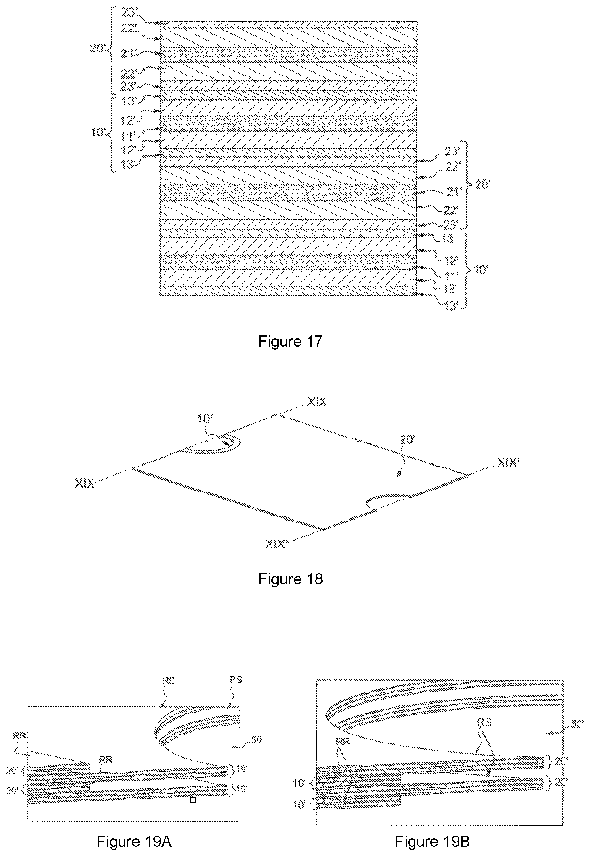The encapsulation is then carried out as described above according to the arrows (F) present in FIGS. 12 and 13. These arrows indicate the zones covered by the encapsulation system according to the invention (set-back regions). The encapsulation system according to the invention fills the space present in the cutouts in the shape of a U positioned top to tail and offset as presented in FIGS. 12 and 13.