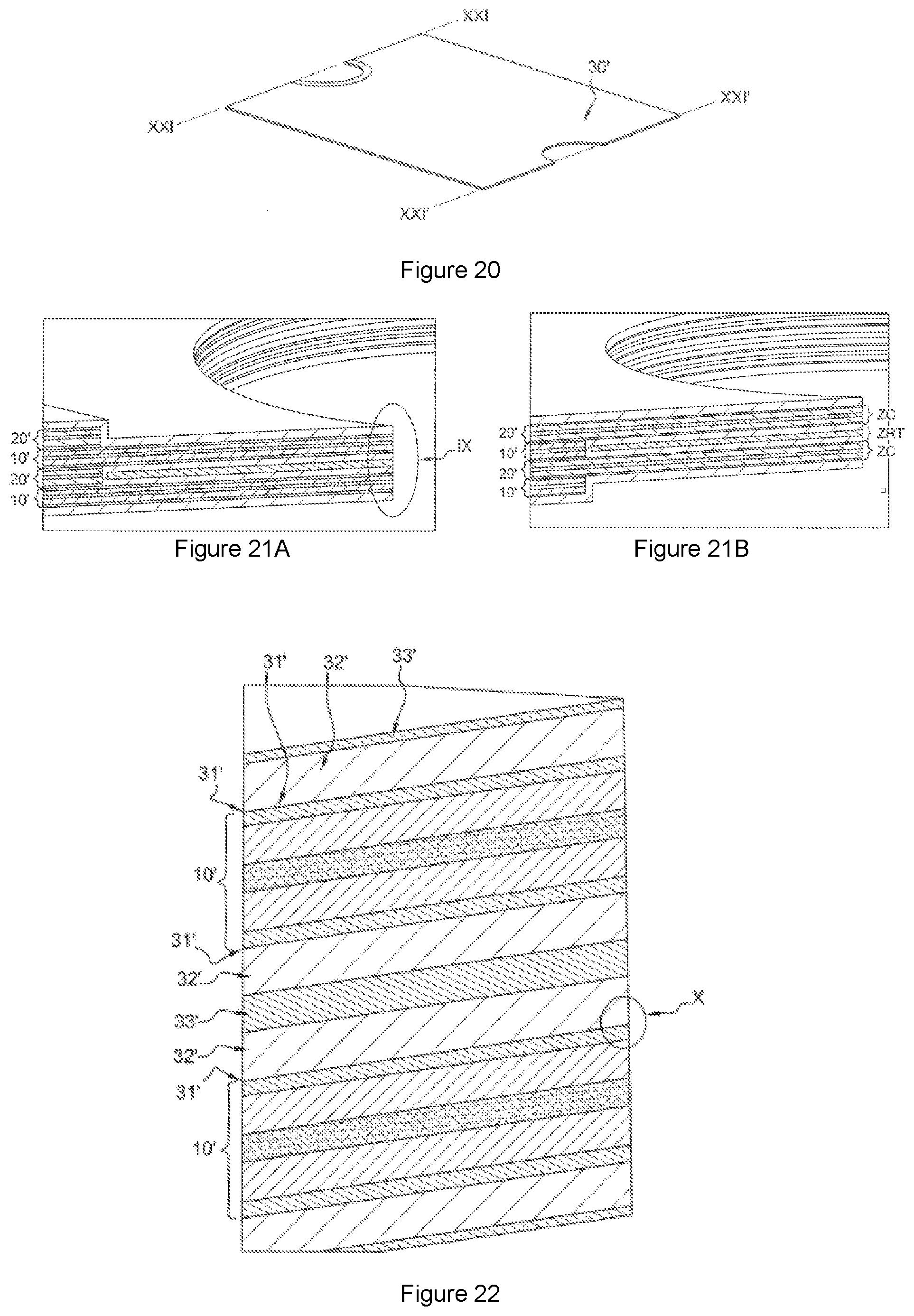 In another embodiment, the simultaneous manufacturing of a plurality of batteries, preferably of a plurality of all-solid batteries can be carried out using an alternating primary superposition of sheets comprising between several tens of and several hundred anodes 10′ having notches 50, 50′ and of sheets comprising between several tens of and several hundred cathodes 20′ having notches 50″, 50′″. All these sheets have notches, preferably concentric orifices or holes in such a way that when these perforations are superimposed, all the cathodes and all the anodes of these sheets define at least one protruding region RS, intended to form an accessible connection zone, as well as at least one set-back region RR, intended to form a covering zone, i.e. a zone covered by the encapsulation system (cf. FIGS. 16, 17, 18 and 19). In FIG. 16, each anode sheet comprises an alternating succession of holes having diameters D1 and D2 where D2 is a diameter smaller than D1 and each cathode sheet comprises an alternating succession of holes having diameters D2 and D1 where D2 is a diameter smaller than D1, in such a way that the holes present on the sheets of anode having a diameter D1 (respectively D2) and of cathode having a diameter D2 (respectively D1) are concentric. FIG. 19 shows a perspective view analogous to FIG. 16 illustrating on a greater scale the primary superposition of sheets of anode and of sheets of cathode, and namely the superposition of the concentric holes having different diameters D1 and D2 present on these sheets highlighting the protruding regions and the set-back regions.