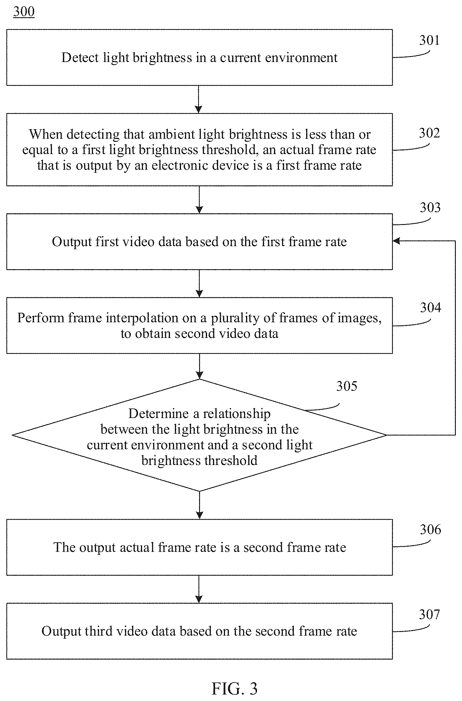 This application claims priority to Chinese Patent Application No. 202010225392.7, filed with the China National Intellectual Property Administration on Mar. 26, 2020 and entitled “IMAGE PROCESSING METHOD AND ELECTRONIC DEVICE”, which is incorporated herein by reference in its entirety. This application relates to the field of terminals, and more specifically, to an image processing method and an electronic device. When light is sufficient, most photographing devices can shoot videos with good picture quality. However, in a dark situation, due to limitation of ambient brightness and photosensitivity of a device, fluency of a shot image is usually poor. This application provides an image processing method and an electronic device, to help improve fluency of an image shot by an electronic device in a dark scenario. According to a first aspect, an image processing method is provided. The method is applied to an electronic device having a camera, and the method includes: A sensor of the electronic device outputs a first frame rate when the electronic device detects that ambient light brightness in a current environment is less than or equal to a first preset light brightness threshold; the electronic device collects first video data based on the first frame rate by using the camera, where the first video data includes a plurality of frames of images; and the electronic device performs frame interpolation on the plurality of frames of images, to obtain and store second video data, where a frame rate of the second video data is greater than the first frame rate. According to the image processing method in this embodiment of this application, when the electronic device currently detects that light brightness is relatively low, the electronic device may perform frame interpolation on collected video data, so that a frame rate of a finally obtained video is greater than a frame rate at which the sensor of the electronic device outputs frames. This can improve video fluency. With reference to the first aspect, in some implementations of the first aspect, the method further includes: The sensor of the electronic device outputs a second frame rate when the electronic device detects that the ambient light brightness in the current environment is greater than or equal to a second preset light brightness threshold, where the second frame rate is greater than the first frame rate; the electronic device collects third video data based on the second frame rate by using the camera, where a frame rate of the third video data is equal to the second frame rate; and the electronic device stores the third video data. In this embodiment of this application, when the electronic device detects that light brightness is greater than the second preset light brightness threshold, a frame rate may be improved, to ensure fluency of collected video data. With reference to the first aspect, in some implementations of the first aspect, the second preset light brightness threshold is greater than the first preset light brightness threshold. In this embodiment of this application, two thresholds are set, to reduce various sudden changes caused when ambient light brightness changes at a critical point, for example, sudden changes of image brightness and noise caused by a sudden decrease of exposure duration. Frame dropping is performed when the light brightness is less than or equal to the first light brightness threshold, and frame dropping is stopped when the light brightness is greater than or equal to the second light brightness threshold. This ensures flapping between frame dropping and no frame dropping. With reference to the first aspect, in some implementations of the first aspect, the plurality of frames of images include an athframe of image data and an (a+1)thframe of image data, the athframe of image data and the (a+1)thframe of image data each are a W×Z matrix, and a, W, and Z are positive integers. That the electronic device performs frame interpolation on the plurality of frames of images includes: The electronic device determines L sum of absolute differences SAD values based on a sum of pixel values in each row in an Mthrow to an Nthrow in the (a+1)thframe of image data and a sum of pixel values in each row in a kthrow to a (k+N−M)throw in the a frame of image data, where M and N are positive integers, 1≤M<N≤W, k=1, . . . , or L, and L is a maximum row offset; the electronic device determines Y SAD values based on a sum of pixel values in each column in a Pthcolumn to a Qthcolumn in the (a+1)thframe of image data and a sum of pixel values in each column in an xthcolumn to an (x+Q−p)thcolumn in the athframe of image data, where P and Q are positive integers, 1≤P<Q≤Z, x=1, . . . , or Y, and Y is a maximum column offset; the electronic device determines a row offset and a column offset based on the L SAD values and the Y SAD values; the electronic device processes the athframe of image data or the (a+1)thframe of image data based on the row offset and the column offset, to obtain processed image data; and the electronic device interpolates the processed image data between the athframe of image data and the (a+1)thframe of image data. In this embodiment of this application, the row offset and the column offset are determined by calculating SAD values of some rows and columns in the athframe of image data and the (a+1)thframe of image data, the athframe of image data or the (a+1)thframe of image data is processed based on the row offset and the column offset, and the processed image data is interpolated between the athframe of image data and the (a+1)thframe of image data, so that a frame rate of the processed image data can be improved, and fluency of a video can be improved. With reference to the first aspect, in some implementations of the first aspect, that the electronic device determines a row offset and a column offset based on the L SAD values and the Y SAD values includes: The electronic 