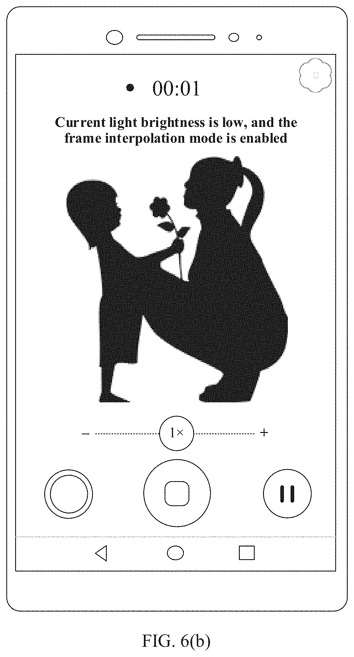 detect ambient light brightness in a current environment; output a first frame rate when the ambient light brightness is less than or equal to a first preset light brightness threshold; collect, based on the first frame rate, first video data comprising a plurality of frames of images; perform frame interpolation on the frames of images to obtain second video data, wherein a second frame rate of the second video data is greater than the first frame rate; and store the second video data. 18. The computer program product of determine L sum of absolute differences (SAD) values based on a first sum of first pixel values in each row in an Mthrow to an Nthrow in the (a+1)thframe of image data and a second sum of second pixel values in each row in a kthrow to a (k+N−M)throw in the athframe of image data, wherein M and N are positive integers, wherein 1≤M<N≤W, wherein k=1, . . . , or L, and wherein L is a maximum row offset; determine Y SAD values based on a third sum of third pixel values in each column in a Pthcolumn to a Qthcolumn in the (a+1)thframe of image data and a fourth sum of fourth pixel values in each column in an xthcolumn to an (x+Q−P)thcolumn in the athframe of image data, wherein P and Q are positive integers, wherein 1≤P<Q≤Z, wherein x=1, . . . , or Y, and wherein Y is a maximum column offset; determine a first row offset and a first column offset based on the L SAD values and the Y SAD values; process the athframe of image data or the (a+1)thframe of image data based on the first row offset and the first column offset to obtain processed image data; and interpolate the processed image data between the athframe of image data and the (a+1)thframe of image data. 19. The computer program product of determine a second row offset corresponding to a first smallest value in the L SAD values as the first row offset; and determine a second column offset corresponding to a second smallest value in the Y SAD values as the first column offset. 20. The computer program product of 21. The computer program product of output a third frame rate when the ambient light brightness is greater than or equal to a second preset light brightness threshold, wherein the third frame rate is greater than the first frame rate; collect third video data using a camera based on the third frame rate, wherein a fourth frame rate of the third video data is equal to the third frame rate; and store the third video data. 22. The computer program product of