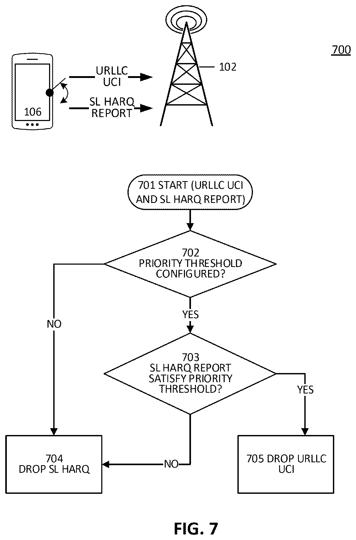 At block 702, if a priority threshold (e.g., “sl-PriorityThresholdULURLLC”) is configured, then an LTE V2X prioritization rule is applied with the priority threshold and the method proceeds to block 703. At block 703, if the SL HARQ satisfies the configured priority threshold (e.g., the priority value corresponding to SL HARQ is smaller than the configured priority threshold), this indicates that SL HARQ report has a higher priority. In this case, the method proceeds to block 705 where then URLLC UCI is dropped. Otherwise, the method proceeds to block 704 where SL HARQ report is dropped (not included in the uplink transmission).
