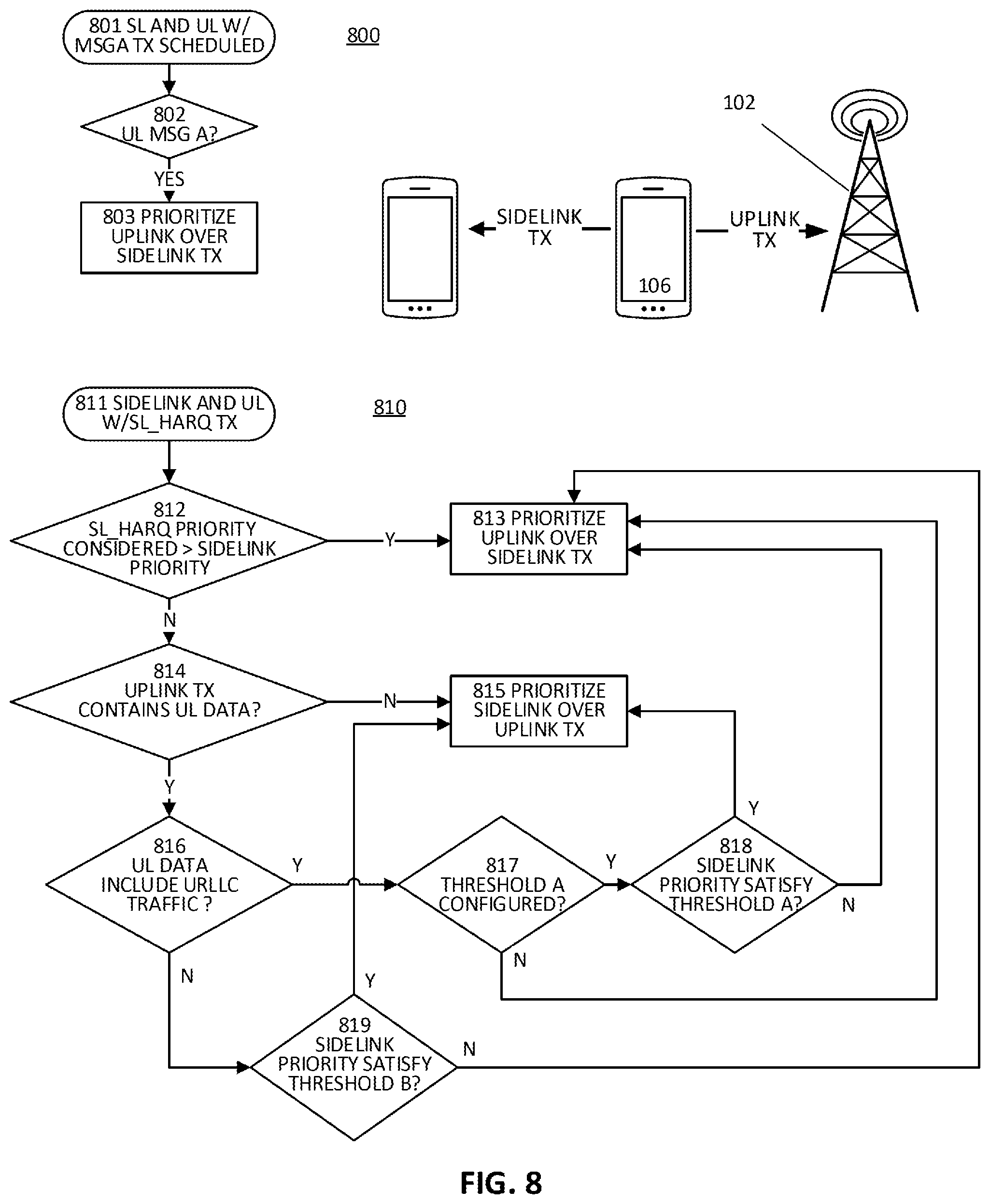 The method begins at block 811 if a sidelink transmission and an uplink transmission that is carrying a sidelink hybrid automatic repeat request (HARQ) are both competing for TX resources, e.g., they are scheduled for transmission in a shared time window. The method proceeds to block 812 where a condition is checked—if a priority associated with the sidelink HARQ is considered to be higher than a priority associated with the sidelink transmission, then the method proceeds to block 813 where it will assign a higher priority to the uplink transmission. The priorities associated with the sidelink HARQ, and the sidelink transmission can be provided in sidelink control information (SCI), and/or they can be specified through other means, for example, in configurable memory, settings, hardcoded, or provided in messages by the network or other UE, or a combination of those.