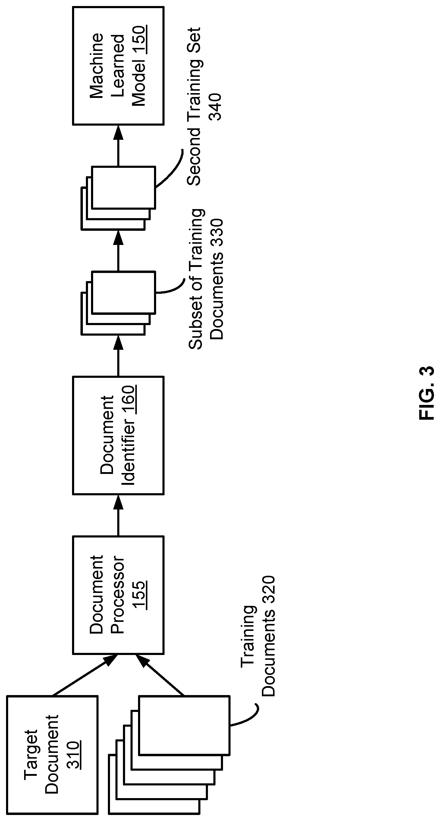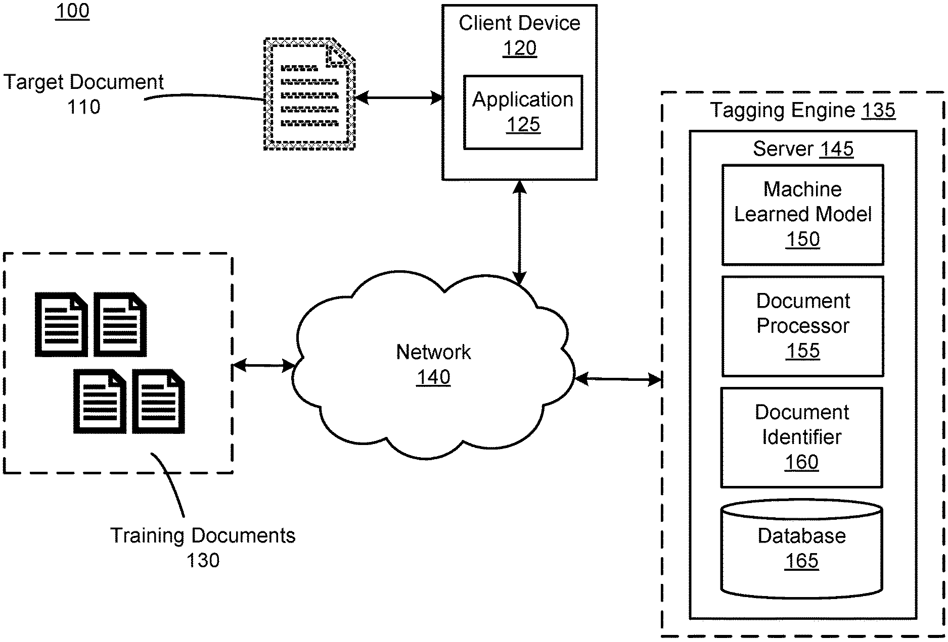 The disclosure generally relates to the training of a machine-learned model, and specifically to model retraining based on anonymized data. Current systems, such as online document management systems, allow users to provide and create a document for tagging by the systems. Conventional systems may implement tagging models to identify components of the document to tag. However, tagging models often tag documents inaccurately and are not adapted to cope with user feedback. Further, model generation often involves the use of users' private information because tagging models are frequently trained with documents provided by system users, which may contain personal or otherwise sensitive information. While systems may secure private information, private information is often used by current systems without the user's permission and is still vulnerable to data leaks. The methods described herein are directed to retraining machine-learned models used to tag portions of documents with anonymized data in a document management environment. In some embodiments, a document management system of a document management environment trains a machine-learned model with a first training set of tagged documents. In these embodiments, the machine-learned model, when applied to a document, is configured to tag one or more portions of the document. The document management system applies the machine-learned model to a target document. The document management system identifies one or more portions of the target document that are incorrectly tagged by the machine-learned model. In some embodiments, the document management system may automatically detect incorrectly tagged portions. Alternatively, or additionally, the document management system may receive an indication from a user that one or more portions of the target document were incorrectly tagged. In some embodiments, to effectively retrain the model using the target document but without including private information from the target document, a “skeleton” or feature vector representation of the target document is generated. The feature vector may include certain characteristics of the customer document, such as entries that identify the presence and/or absence of a feature, a feature type (e.g., a type of grammar used, a clause used, a document type, etc.), a presence and/or absence of text, a location of features within the target document, and/or any other characteristics of the target document (e.g., font size, font type, creation date, other metadata). The document management system queries a corpus of documents using the feature vector to identify a set of documents corresponding to the feature vector. In some embodiments, the set of documents are identified based on a comparison between a plurality of feature vectors that correspond to additional documents, such as publicly available documents, with the feature vector of the target document. A second training set of tagged documents is generated using the identified set of documents. The identified set of documents may be manually tagged, tagged by a machine-learned model before, during and/or after retraining, or a combination thereof, to generate the second training set of tagged documents. The document management system retrains the machine-learned model using the second training set of tagged documents. By generating the second training set of tagged document based on the original target document that was incorrectly tagged, the machine-learned model is retrained more effectively. In addition, by retraining the model without using private information associated with the target document and/or entities that provided or received the document, the privacy of the target document and the corresponding entities is preserved. The disclosed embodiments have other advantages and features which will be more readily apparent from the detailed description, the appended claims, and the accompanying figures (or drawings). A brief introduction of the figures is below. Figure ( The Figures (FIGS.) and the following description relate to preferred embodiments by way of illustration only. It should be noted that from the following discussion, alternative embodiments of the structures and methods disclosed herein will be readily recognized as viable alternatives that may be employed without departing from the principles of what is claimed. Reference will now be made in detail to several embodiments, examples of which are illustrated in the accompanying figures. It is noted that wherever practicable similar or like reference numbers may be used in the figures and may indicate similar or like functionality. The figures depict embodiments of the disclosed system (or method) for purposes of illustration only. One skilled in the art will readily recognize from the following description that alternative embodiments of the structures and methods illustrated herein may be employed without departing from the principles described herein. The methods described herein are directed to retraining machine-learned models that are configured to tag portions of documents using anonymized data in a document management environment. The document management environment enables a party (e.g., individuals, organizations, etc.) to create and send documents to one or more receiving parties for negotiation, collaborative editing, electronic execution (e.g., electronic signature), automation of contract fulfilment, archival, and analysis. Within the document management environment, parties may review, agree to, and/or reject content and/or terms presented in a digital document. In addition, parties may electronically execute the document. In some embodiments, parties may complete and/or contribute to a portion of the content and/or terms in the document through the use of tags. In some embodiments, tags are places within an electronic document in which a recipient provides input (such as signature, name, address, company, etc.), where a calc