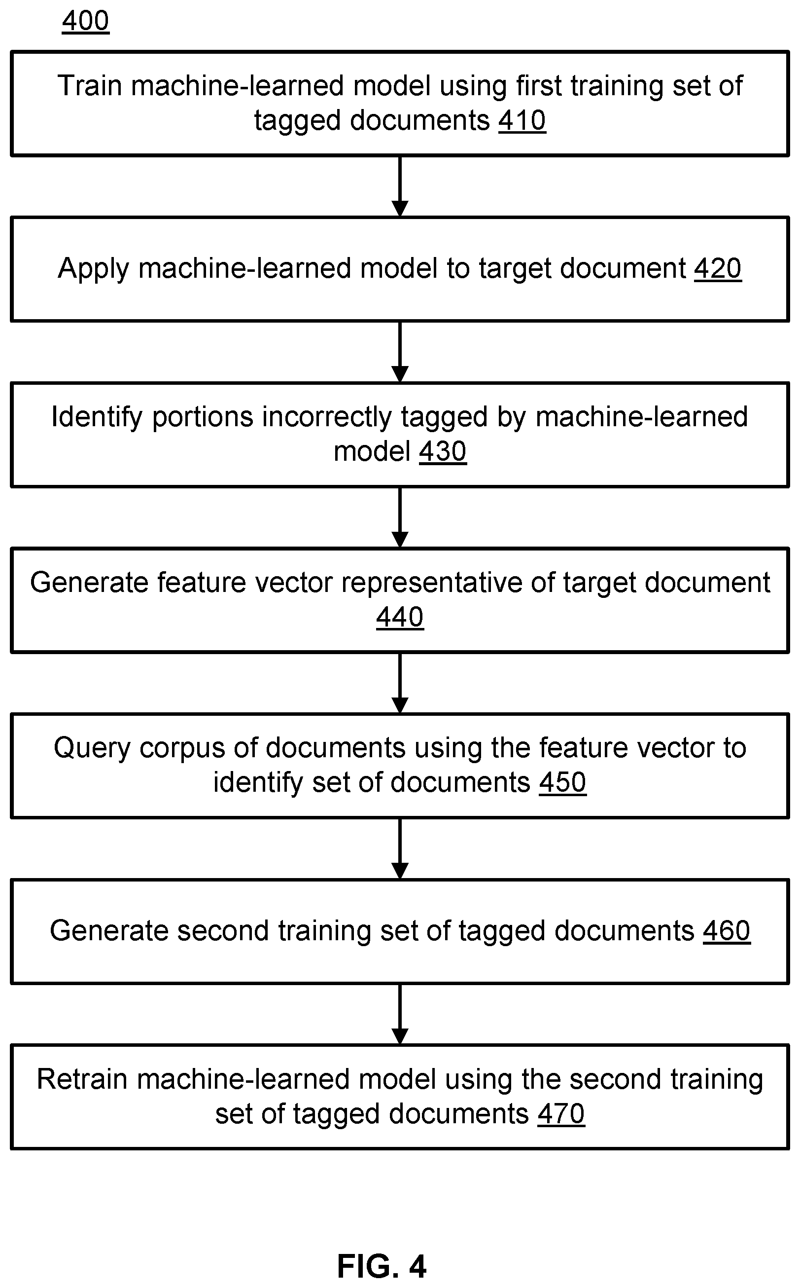 applying, by a document management system, a machine-learned model configured to tag one or more document portions to a target document; in response to one or more document portions of the target document being incorrectly tagged, generating, by the document management system, a feature vector representative of characteristics of the target document; identifying, by the document management system, a set of documents within a threshold similarity to the target document by querying a corpus of documents with the feature vector; and retraining, by the document management system, the machine-learned model using the identified set of documents. 18. The method of 19. The method of 20. The method of