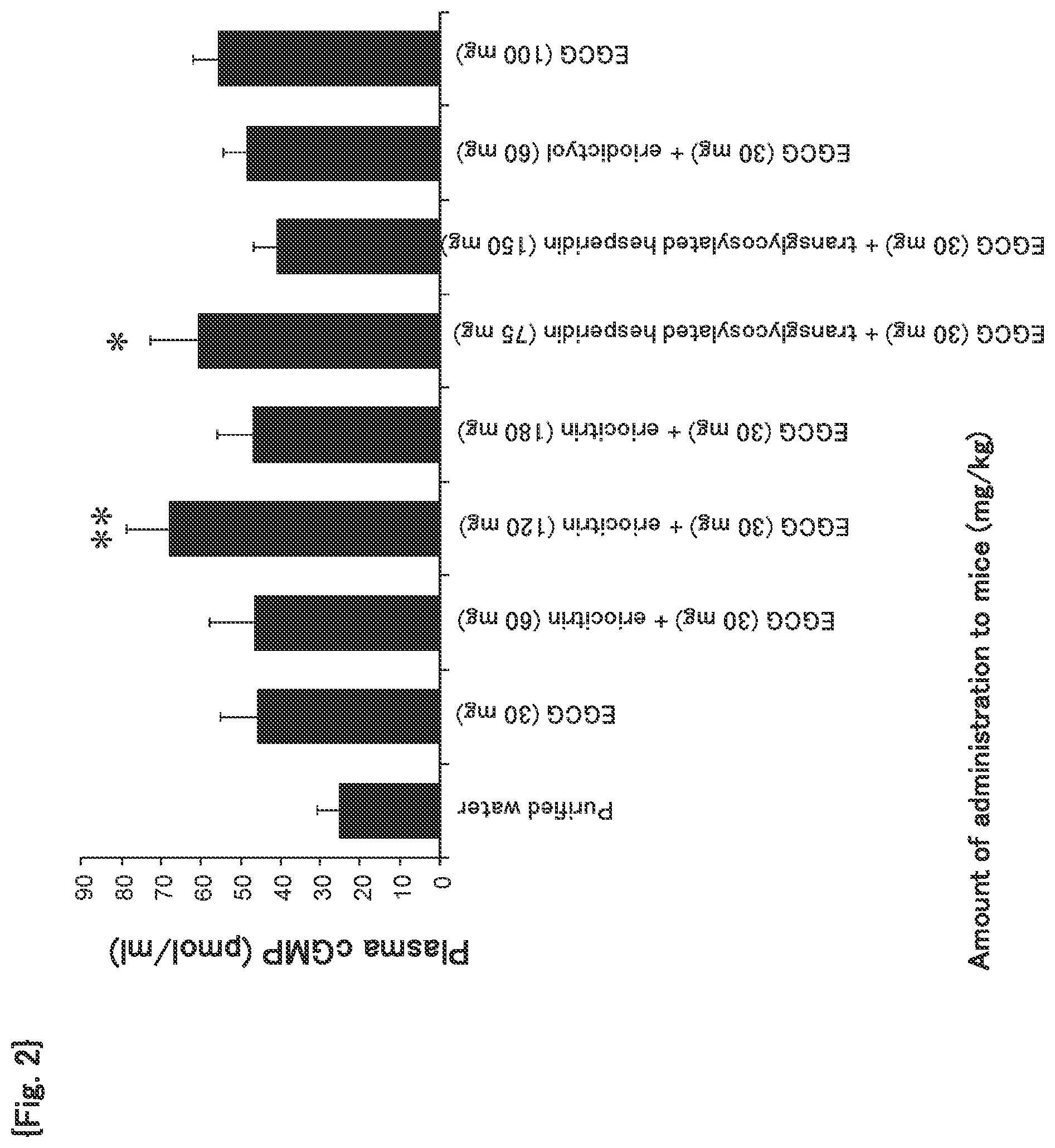As shown in FIGS. 1 to 3 and Table 1, when the ratio (B/A) of epigallocatechin gallate (A) contained in the green tea extract and flavanone glycoside (B) contained in the citrus extract is 0.2<B/A<1.6, or the ratio (C/A) of epigallocatechin gallate (A) and eriocitrin (C) contained in the citrus extract is 0.2<C/A<0.5, the plasma cGMP concentration is increased to a significant extent. The results demonstrate that a composition comprising a green tea extract and a citrus fruit extract in which the ratio (B/A) of epigallocatechin gallate (A) contained in the green tea extract and flavanone glycoside (B) contained in the citrus extract is 0.2<B/A<1.6, or the ratio (C/A) of epigallocatechin gallate (A) and eriocitrin (C) contained in the citrus extract is 0.2<C/A<0.5 can enhance various effects of epigallocatechin gallate, such as an anti-cancer effect, to a significant extent.