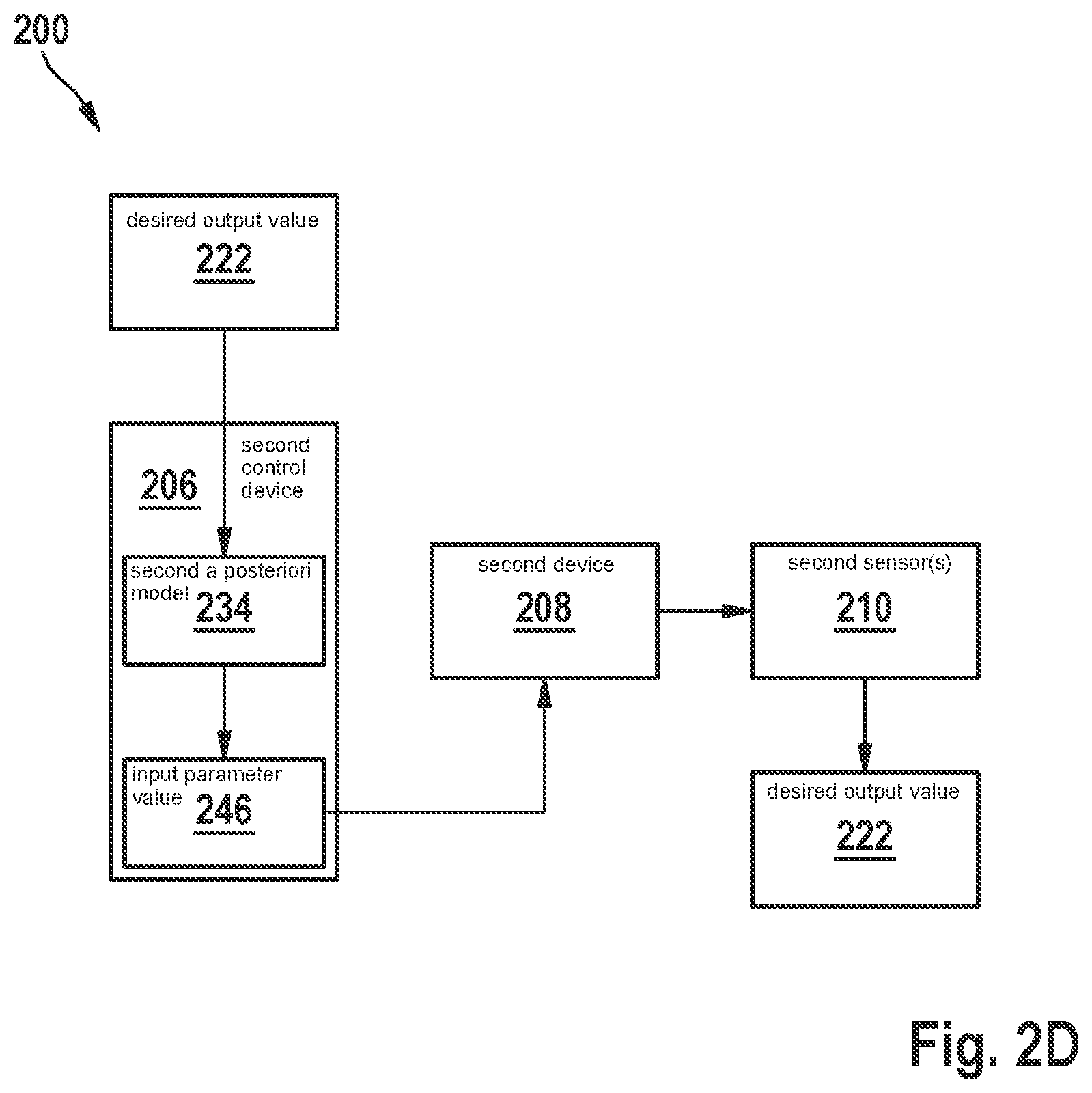In this case, the second a priori model (in 3. in algorithm 1) can be defined by determining the second a priori model, ƒt, as a mean value of the plurality of Gaussian process, GP(({tilde over (f)}s|Ds),kt) as described above. As described above, the hyperparameters of the first kernel function, ks, can remain unchanged. Illustratively, the second a posteriori model 214 can be learned by means of Bayesian optimization by only carrying out point 4 of the algorithm 1 for new measurement points. The transmission of the uncertainty (also referred to as propagation of the uncertainty) of the first a posteriori model 114 to the second a priori model and also to the second a posteriori model increases both the data efficiency and the optimization efficiency because the amount of measurement data required can be reduced and, as a result, an expenditure (e.g., time expenditure and/or outlay) for learning of the model can be reduced. II) Second concept for determining the second a posteriori model 214 (also referred to as an amplified hierarchical Gaussian process): Analogously to the first concept, in the second concept the plurality of Gaussian processes having the common covariance function, kt, can be determined in accordance with GP(({tilde over (f)}s|Ds),kt) Differences in the expected value functions, {tilde over (f)}s, of the plurality of Gaussian processes, GP(({tilde over (f)}s|Ds),kt), can characterize the uncertainty of the first a posteriori model. In contrast to the first concept, in the second concept each Gaussian process of the plurality of Gaussian processes, GP(({tilde over (f)}s|Ds),kt), can in each case be conditioned on the known second measurement points, Dt, in accordance with equations (3) and (4). According to various embodiments, the second a posteriori model can be determined as a mean value of the conditioned plurality of Gaussian processes. The differences between the expected value functions, {tilde over (f)}s, and the plurality of Gaussian processes, GP(({tilde over (f)}s|Ds),kt) in this case directly influence the covariance function of the second a posteriori model such that the covariance function of the second a posteriori model also takes into account the uncertainty of the first a posteriori model. The common kernel function of both models can be described on the basis of the first kernel function, ks, of the first a posteriori model and the second kernel function, kt, in accordance with equation (6): where “*” denotes the evaluation points and where Σ*boost. is an additional covariance term that describes the uncertainty boost transferred from the first a posteriori model Σ*boost. can be described in accordance with equation (7): where α*,t=kt(x*,Xt)(kt(Xt,Xt)+σt2 The second a posteriori model 214 can be learned in accordance with algorithm 2. Algorithm 2: Learning the second a posteriori model in accordance with the second concept Input: Ds, Dt, ks, kt. Output: p(ƒt| where D is all allowed values of the at least one input variable. Illustratively, the input parameter value, XN For example, the control device 206 can select an input parameter value 216 of a new second measurement point 232 by means of the acquisition function. The control device 206 can control the second device 208 according to the determined input parameter value 216, and the one or more second sensors 210 can detect the associated output value 218 of the new second measurement point 232. According to various embodiments, the second a posteriori model 214 can additionally be conditioned on the new second measurement point 232. Said adapted second a posteriori model 234 can describe the relationship between the at least one input variable and the at least one output variable at the previously known second measurement points, Dt, and the new second measurement point 232. Illustratively, the known second measurement points, Dt, can also have the new second measurement point 232. In this way, new second measurement points can be determined as often as desired, and the respective second a posteriori model can be conditioned in each iteration on the new known second measurement points. In this case too, the hyperparameters of the first kernel function, ks, can remain unchanged in the first and in the second concept. This can increase the efficiency of Bayesian optimization. It is understood that explicitly determining the plurality of Gaussian processes is not required, but that the effective formula that describes the limit of infinitely many such Gaussian processes can be evaluated. Said effective formula can be evaluated, for example, if the hyperparameters of the second a posteriori model are again optimized on the basis of new measurement points. The determination of a new second measurement point and the adaptation of the second a posteriori model can be described in accordance with algorithm 3: Algorithm 3: Bayesian optimization of the second a posteriori model 214 for i←1, 2, . . . do the following:
