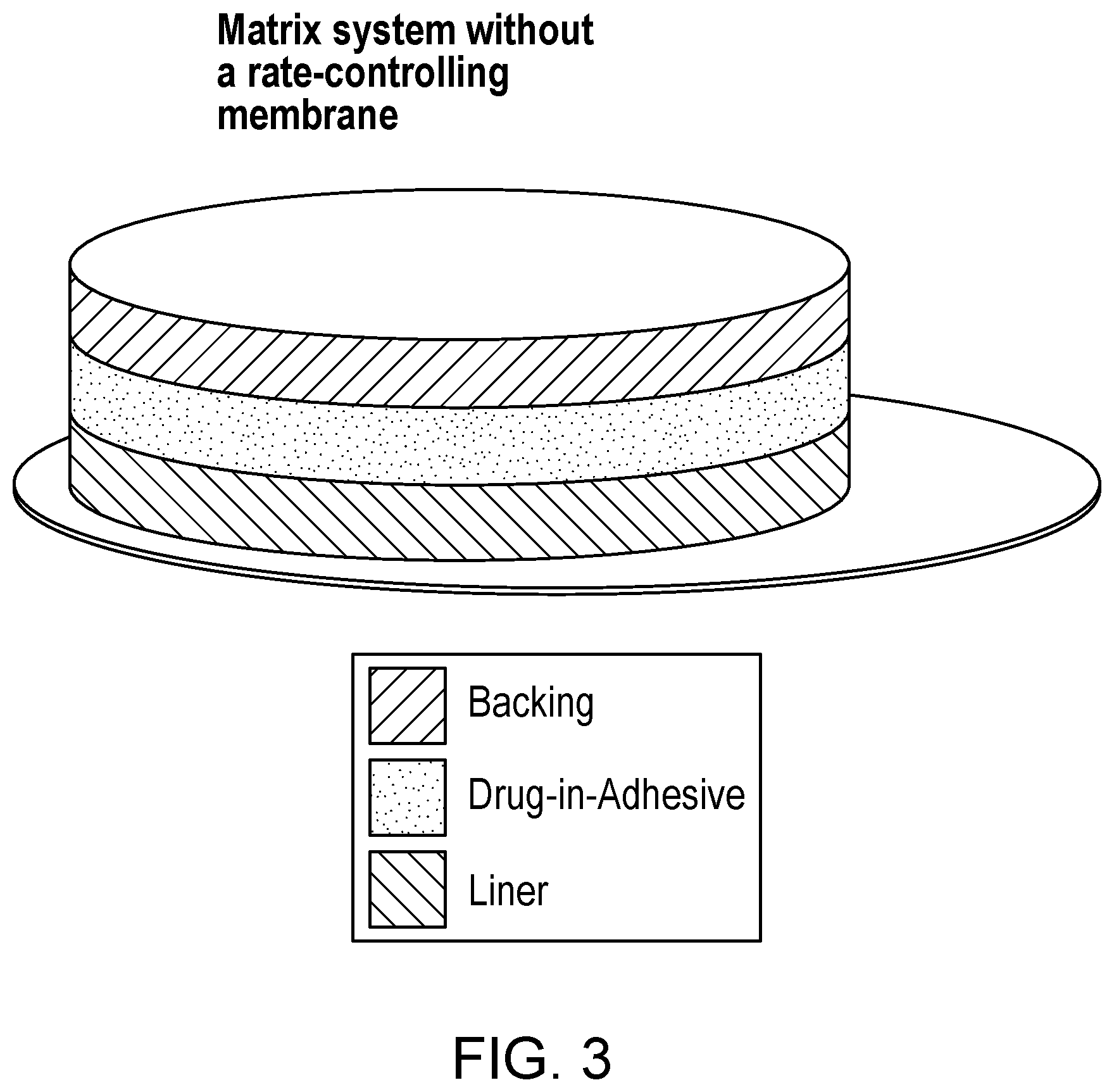 FIG. 3 shows a drug-adhesive patch comprising a matrix system without a rate-controlling membrane.