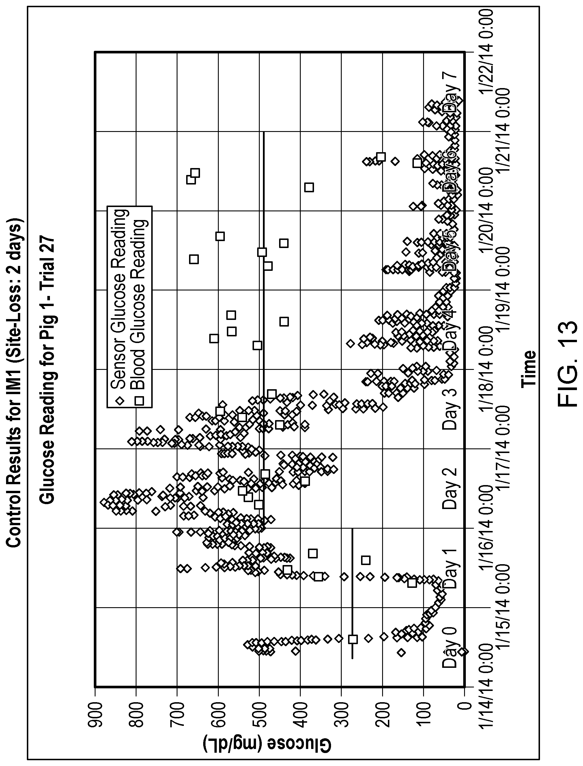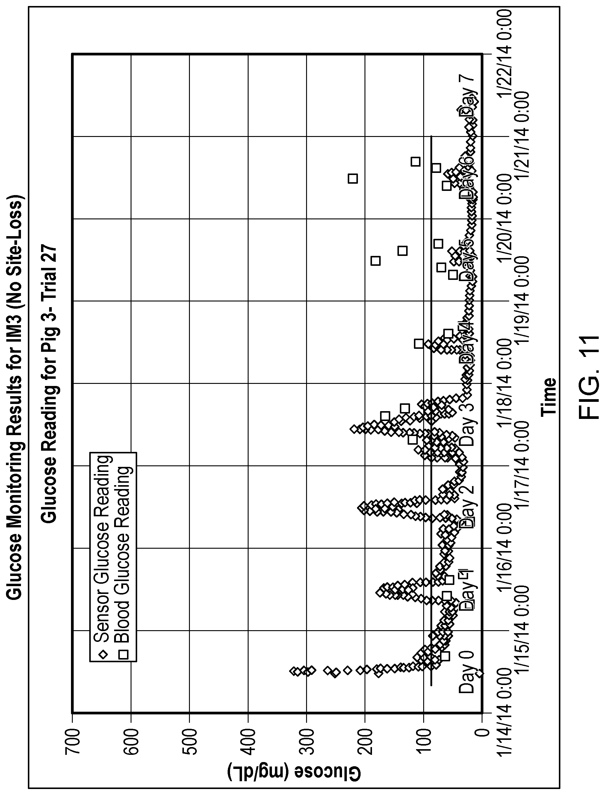 FIG. 6 is a graph of blood glucose (BG) vs. time for normal site-loss. Based on the glucose reading for pig 2, the infusion site was lost after glucose level increased.