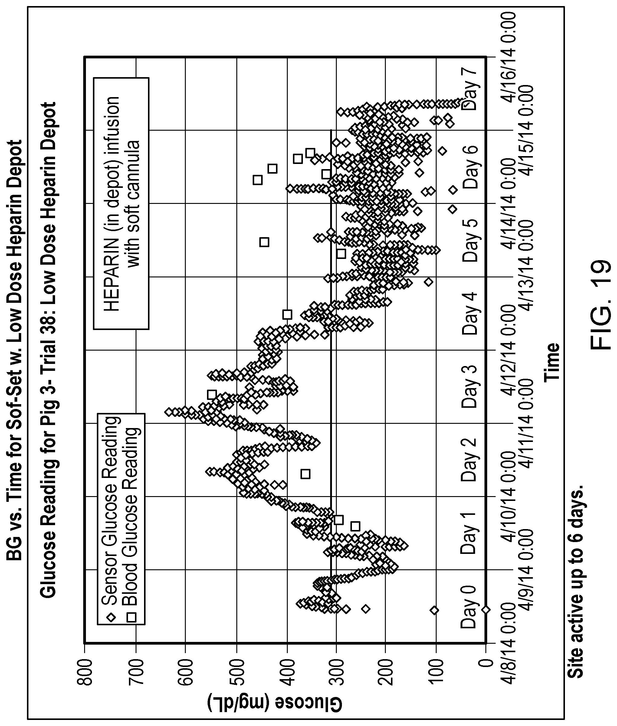 In another embodiment, an in-line heparin depot is provided for continuous heparin delivery, which can be attached to specific components (e.g. reservoir or each portion of the infusion set). The depot may be attached to various sections of the pumping fluid path in various forms. The attachment may be a filter, plug, sponge, etc. FIGS. 16B-D provide various examples of depots. In accordance with one aspect of the invention, FIG. 20 provides a detailed structure for a heparin depot. The function of the filter membrane is the provide structure support for heparin/matrix loading and to provide a filter to eliminate particulate matters (microbes or aggregates) in the insulin formulation. The function of the matrix is to control heparin release in the infused insulin solution. An initial heparin depot with 100-400 U/device demonstrated the efficacy in extending infusion set wear in diabetic porcine model from around 3 days (control) to 6 days. Table 12 below shows various heparin dosing attempted in this illustrative experiment. In certain embodiments, heparin dosing is 50 U-2000 U per device, 1 U-2000 U per day. A higher dose with different release profiles may also be used. FIG. 19 is a graph of blood glucose (BG) vs. time for Sof-Set™ with a low dose heparin depot, which shows that the infusion site was active up to 6 days. FIG. 21 is a graph of blood glucose (BG) vs. time for Sof-Set™ with a high dose heparin depot, which shows that the infusion site was active up to 6 days.