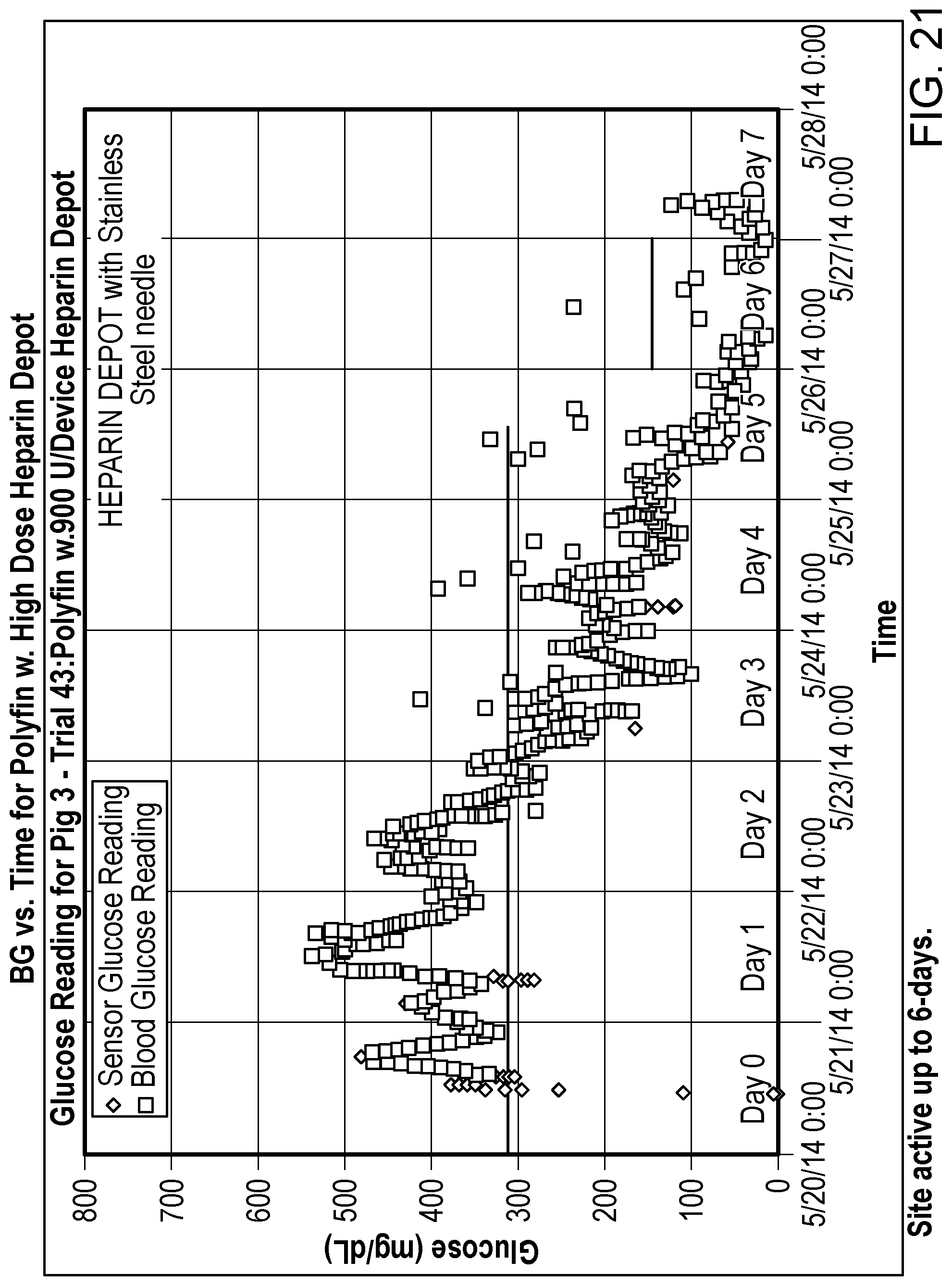 Illustrative experiments demonstrate the efficacy of dextran in extending infusion set wear in a diabetic porcine model. FIG. 22 is a graph of blood glucose (BG) vs. time for Sof-Set™ with dextran dosed insulin, which shows that the infusion site is active up to 6 days.