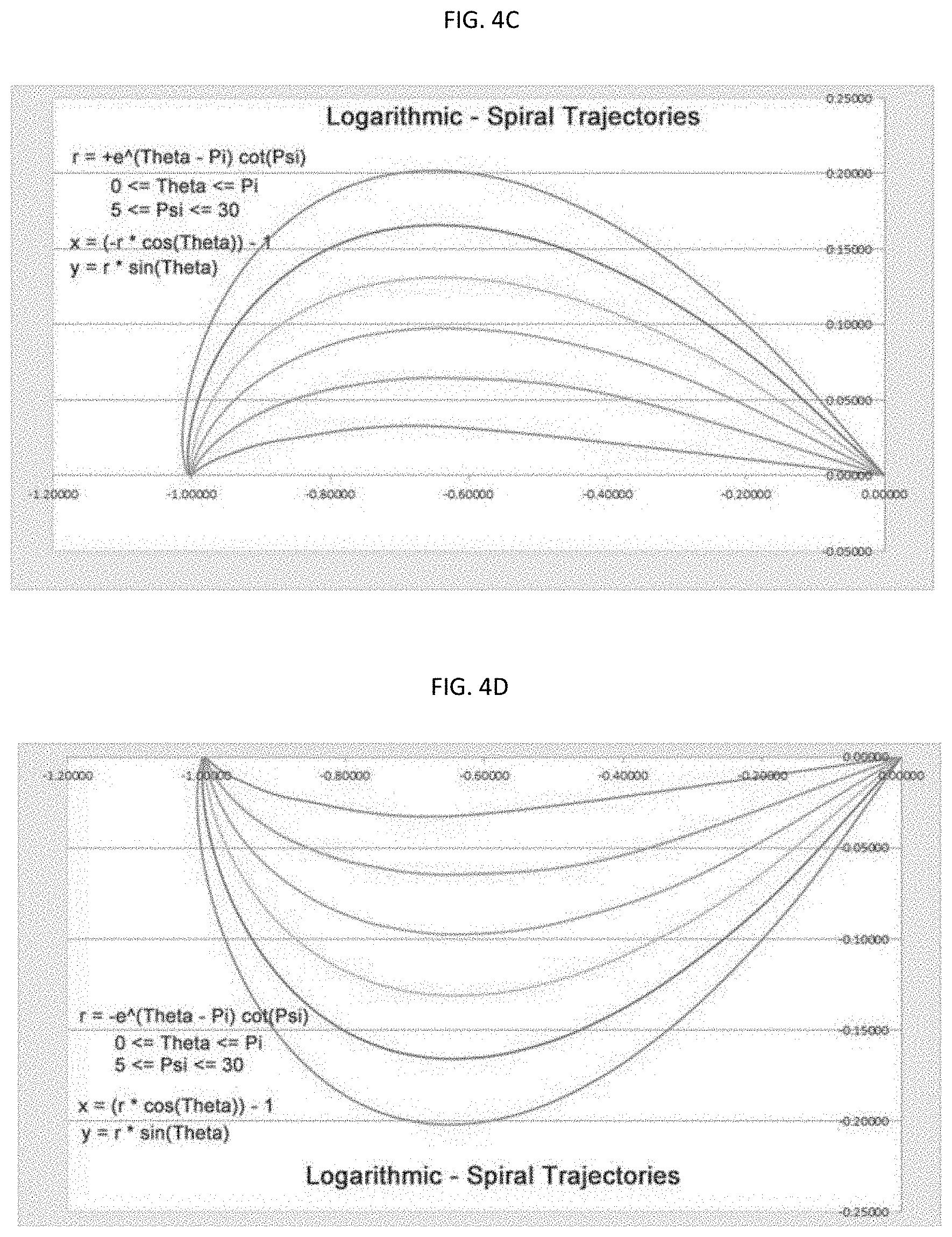 The present application claims priority from U.S. Provisional Application No. 62/648,094, filed Mar. 26, 2018. The contents of that application are hereby incorporated by reference in their entirety. The present disclosure relates generally to digital image data capture; and more specifically, it is directed toward determining camera placement paths derived from logarithmic spiral trajectories for capturing images. Digital imaging has been a tool used in numerous fields. With recent developments in digital imaging technology, and more recently with the proliferation of aerial drones, digital imaging use is expanding rapidly. Image collection, specifically focused on structure from motion (SfM) processing techniques, is performed widely using platforms such as an aerial drone equipped with consumer grade digital cameras. An important aspect of the current state of Structure from Motion (SfM) image collection can be characterized in terms of the impact that camera placement trajectories have on the delivered results. Current UAV data collection strategies for rotor-wing quad-copters, and particularly those for fixed-wing platforms are largely based on the tried and tested flight plan styles developed for traditional aerial photography (e.g., orthophotography which are built up from sequential overlapping stereo pairs). With traditional orthophotography, the image data is acquired using regular parallel linear patterns, with overlapping images taken along a flight line forming an “image strip.” The parallel overlapping image strips used to survey areas form an “image block.” Based on current research literature: “High resolution digital elevation models are increasingly produced from photographs acquired with consumer cameras, both from the ground and from manned aircraft as well as unmanned aerial vehicles (UAVs). However, although such digital elevation models may achieve centrimetric detail, they can also display systematic broad-scale error that restricts their wider use. Such errors, which in typical UAV data are expressed as a vertical “doming” of the digital elevation model (DEM) surface, result from a combination of near-parallel imaging directions and inaccurate correction of radial lens distortion. Using simulations of multi-image networks with near-parallel viewing directions, enabling camera self-calibration as part of the bundle adjustment process inherently leads to erroneous radial distortion estimates and associated digital elevation model error. This effect is relevant whether a traditional photogrammetric or newer structure-from-motion (SfM) approach is used; but errors are expected to be more pronounced in SfM-based digital elevation models, for which the use of control and check point measurements are typically more limited.” Again, from current literature: “Specifically, a regular (often rectangular and evenly spaced) pattern of traditional linear, straight, parallel trajectories covering an area, corridor, or point of interest is used when capturing the necessary photographs. In particular, the traditional, regular, linear, parallel flight lines (used to collect UAV imagery in the recent times) contribute particularly to the well-established and studied systematic (doming) errors in the 3D point clouds derived from the SfM processing workflow—even when alternate flight lines are flown in opposing directions. Such flight paths for collecting images result in the production and propagation of systematic errors within the SfM workflow processes. These errors are termed the “dome” effect. This effect occurs even though emphasis has been placed on maintaining 60% to 90% axial (forward) overlap and 20% to 40% lateral (side-to-side) overlap for placement of images on-the-ground within the target area.” A generally accepted consensus among researchers is that “convergent image capture along gently curved trajectories (e.g., circles) clearly mitigates SfM surface deformation in self-calibrating multi-image blocks.” However, such circular trajectories are neither efficient nor effective enough to cover every potential area or shape. The traditional (straight-linear-parallel) trajectory scenario (a logical carryover from the longstanding traditional aerial photography industry) is generally applied for all types of SfM projects—for point and linear targets (landmark features), agricultural (rural and urban areas), and corridors (highways, pipelines, electric power transmission corridors, railroads, waterways, etc.). An exception to this heuristic holdover practice might relate to a) cityscape areas with tall buildings or b) isolated tall towers where circular trajectories might be used. Of course, emphasis is always placed on capturing all available data in the shortest possible time frame—leaving the SfM software/workflow with the bulk of the production (problem solving) effort, particularly in the instance of using either manned or unmanned aircraft to collect the photographs where duration of flight is a major concern. Thus, current methods of deploying cameras (on the ground or in the air) for capturing digital imagery (overlapping digital photographs) for the construction of SfM 3D topographical models and associated orthophotography generally use more traditional, straight, linear, parallel trajectories as shown in Thus, there is a need for a method to produce trajectories for image gathering that avoids the doming deformation effect. There is a need for a system that allows the generation of flight paths to maximize efficient errorless gathering of images over areas and corridors. One disclosed example is a method of developing a path for taking images from a geographic area of interest. A series of trajectories is determined. Each trajectory is determined based on a logarithmic spiral curve derived from a predetermined range of basis angles and selecting a constant tangent angle between a radial line from the location of an image sensor t