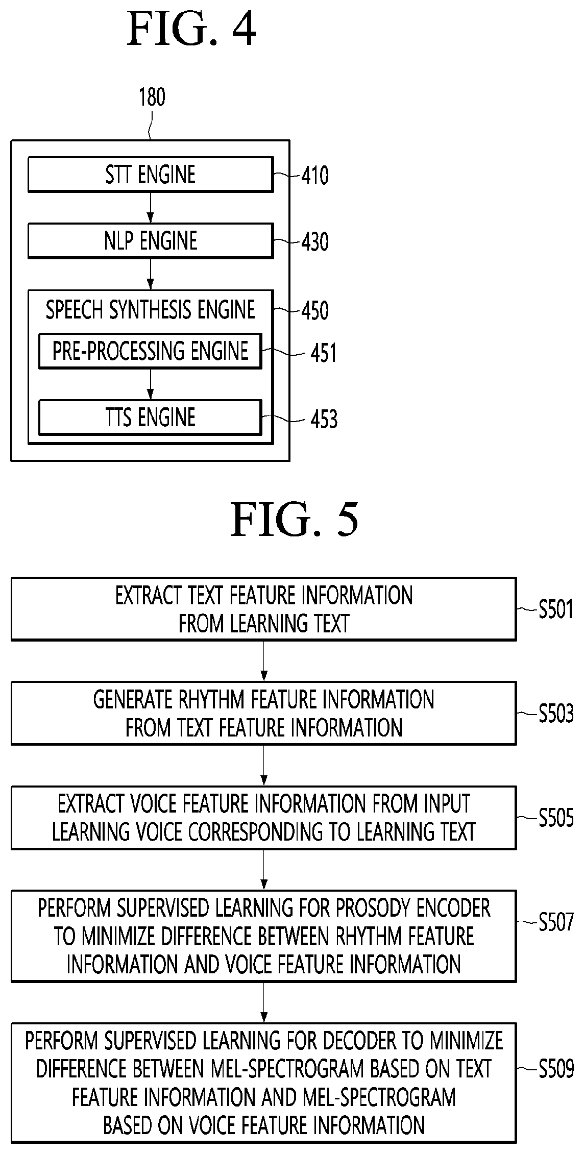 According to another embodiment, when the voice feature information is not received, the processor 180 may generate the Mel spectrogram by receiving, as inputs, the rhythm feature information output from the prosody encoder 820 and text feature information corresponding to the text.