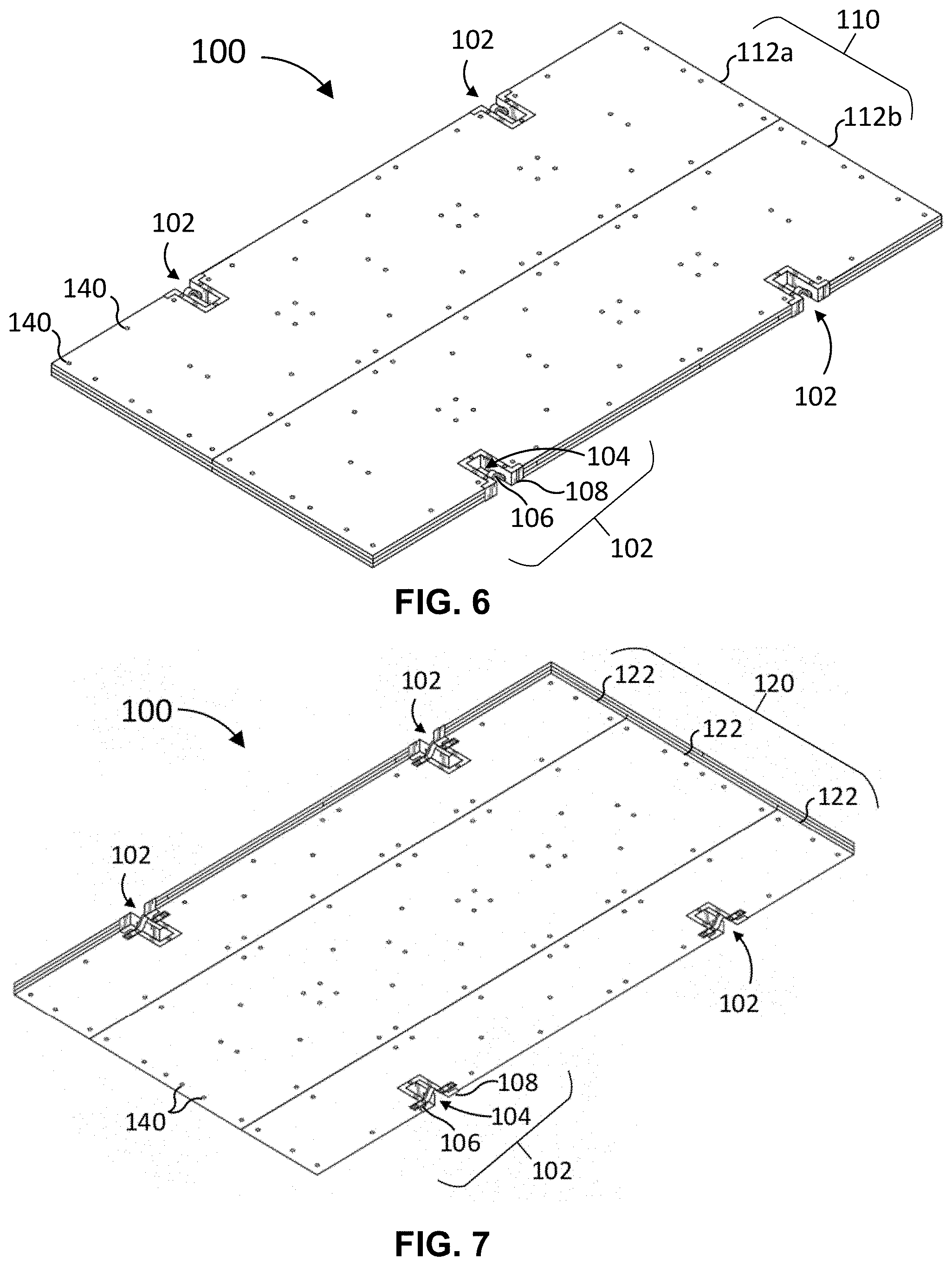 For example, referring to The conventional industrial mat 10 shown in Some embodiments of the present disclosure generally relate to interlocking elongate composite bamboo industrial mats comprising two or three laminated, secured together layers. Other embodiments relate to methods of making elongate composite bamboo panels that may be assembled to form the interlocking elongate composite bamboo industrial mats. An embodiment disclosed herein, relates to a method of making an example interlocking elongate composite bamboo industrial mat from elongate bamboo poles. The method includes the steps of splitting harvested elongate bamboo poles into elongate linear bamboo strips and crushing the elongate linear bamboo strips to form elongate linear fractured bamboo strips. Once formed, the elongate linear fractured bamboo strips are steamed for a selected period of time and then dried to a moisture content of less than 10%. The dried elongate linear fractured bamboo strips are dipped into a glue tank, then suspended above the tank to allow excess glue to drain from the elongate fractured bamboo strips back into the tank. The glue-dipped elongate linear fractured bamboo strips are kiln dried at a temperature of about 120° C. to a moisture content of about 10% or less by wt. A plurality of kiln-dried glue-dipped elongate fractured bamboo strips are spread across the bottom surface of a hydraulic press to a selected thickness, and then compressed with a pressure selected from a range of 8 bars to 13 bars (800 kPa to 1,300 kPa) for about 1 hour while the temperature is maintained at about 120° C. to thereby form a compressed composite bamboo panel comprising glued elongate linear fractured bamboo strips. The compressed composite bamboo panel is cooled while remaining in the press for at least 24 hours after which, it may be cut into selected sizes of panels and boards. According to an example of an embodiment disclosed herein, an interlocking composite bamboo industrial mat comprises a bottom layer, a top layer, and a sandwiched layer between the top and bottom layers. The top and bottom layers comprise a plurality of elongate composite bamboo panels arranged in parallel while the sandwiched layer comprises a plurality of elongate composite bamboo panels arranged perpendicular to the top and bottom layers. The industrial mat also comprises a plurality of fasteners for securing tightly securing together the bottom layer, the top layer, and the sandwiched layer wherein each fastener comprises a sleeve nut, a convex washer, and a bolt. According to one aspect, one end of the elongate interlocking composite bamboo industrial mat is provided with a plurality of spaced-apart fingers while the opposite end is provided with a plurality of matching spaced-apart receptacles configured to receive therein a plurality of spaced-apart fingers of another matching interlocking composite bamboo industrial mat. According to another aspect, the interlocking composite bamboo industrial mat may have a plurality of fingers extending outward from an elongate side edge while the opposite elongate side edge may have a matching plurality of receptacles configured to receive therein a plurality of spaced-apart fingers of another matching interlocking composite bamboo industrial mat. According to another aspect, the interlocking composite bamboo industrial mat is provided with two pairs of spaced-apart lifting assemblies along the opposing elongate sides of the mat. The bottom layer generally comprises seven elongate boards cut from a compressed composite panel wherein the first board and the seventh board define the outside elongate sides of the bottom layer while the second, fourth, and sixth boards have the same widths and are positioned with their first ends protruding a selected distance beyond the first, third, fifth, and seventh boards to thereby form fingers while their opposite ends form receptacles that have a matching depth to the outward extending fingers. The second layer, also referred to as the sandwiched layer, comprises three to five panels or boards cut from compressed composite panels that have a length about equal to the width of the assembled bottom layer, and are laid on top of the bottom layer perpendicular to the elongate boards comprising the bottom layer. The top layer generally comprises two or three elongate panels that, when placed side-by-side on top of the middle layer, provide the same width as the bottom panel. The three layers are then securely engaged by a plurality of spaced apart 3-piece fasteners, wherein each fastener comprises a sleeve nut, a convex washer (also known in the art as a “dome washer”), and a bolt. The plurality of bolts are inserted into and through plurality of holes drilled through the three layers in a selected repeating patter. A convex outward-facing washer is slipped over each bolt which is then threadably and securely engaged by a sleeve nut. Two pairs of matching spaced-apart slots are cut into the elongate sides of the three-layered mats for installation thereinto of matching lifting assemblies. The embodiments of the present disclosure will be described with reference to the following drawings in which: The embodiments of the present disclosure generally relate to interlocking elongate industrial mats incorporating laminated composite bamboo panels therein and methods of making such interlocking elongate industrial mats. Bamboo has numerous properties that make it well suited for use as a structural component for industrial mats. For example, unlike hardwood, bamboo is a type of grass that takes about three to about six years to mature. In contrast, it typically takes hardwood trees about 50 years to mature. As a result, after harvesting, bamboo plants may be replenished much more quickly than hardwood trees which, in turn, makes bamboo a considerably less expensive and more sustainable resource than hardwood. Further, bamboo is also substantially more res