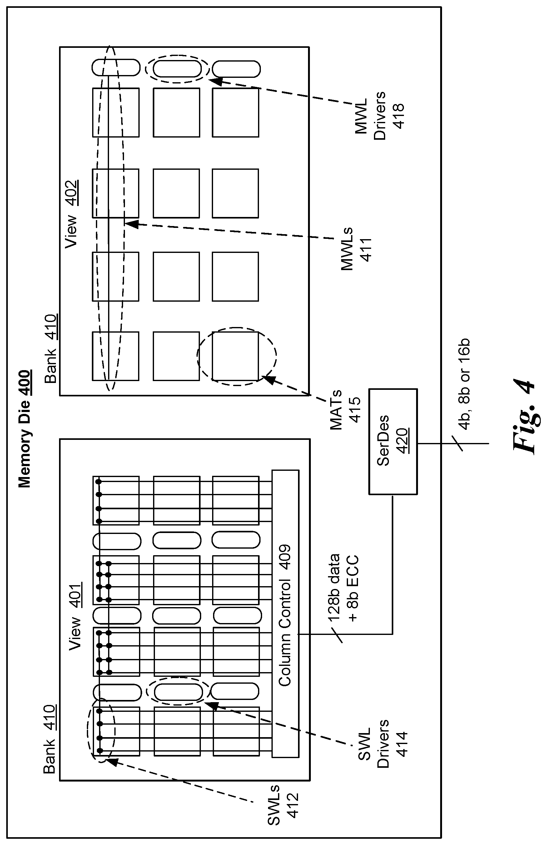 operating a DRAM die in a first mode, the DRAM die comprising a plurality of bank groups, each bank group comprising multiple memory banks, each memory bank including an array of memory cells arranged in rows and columns, where during the first mode an error correction code (ECC) engine employs selected bits in the arrays of memory cells as ECC bits to perform ECC operations; and operating the DRAM die in a second mode under which the ECC bits are not employed for ECC operations by the ECC engine and are made available for external use. 14. The method of receiving a read request from the host, and in response to a read request,