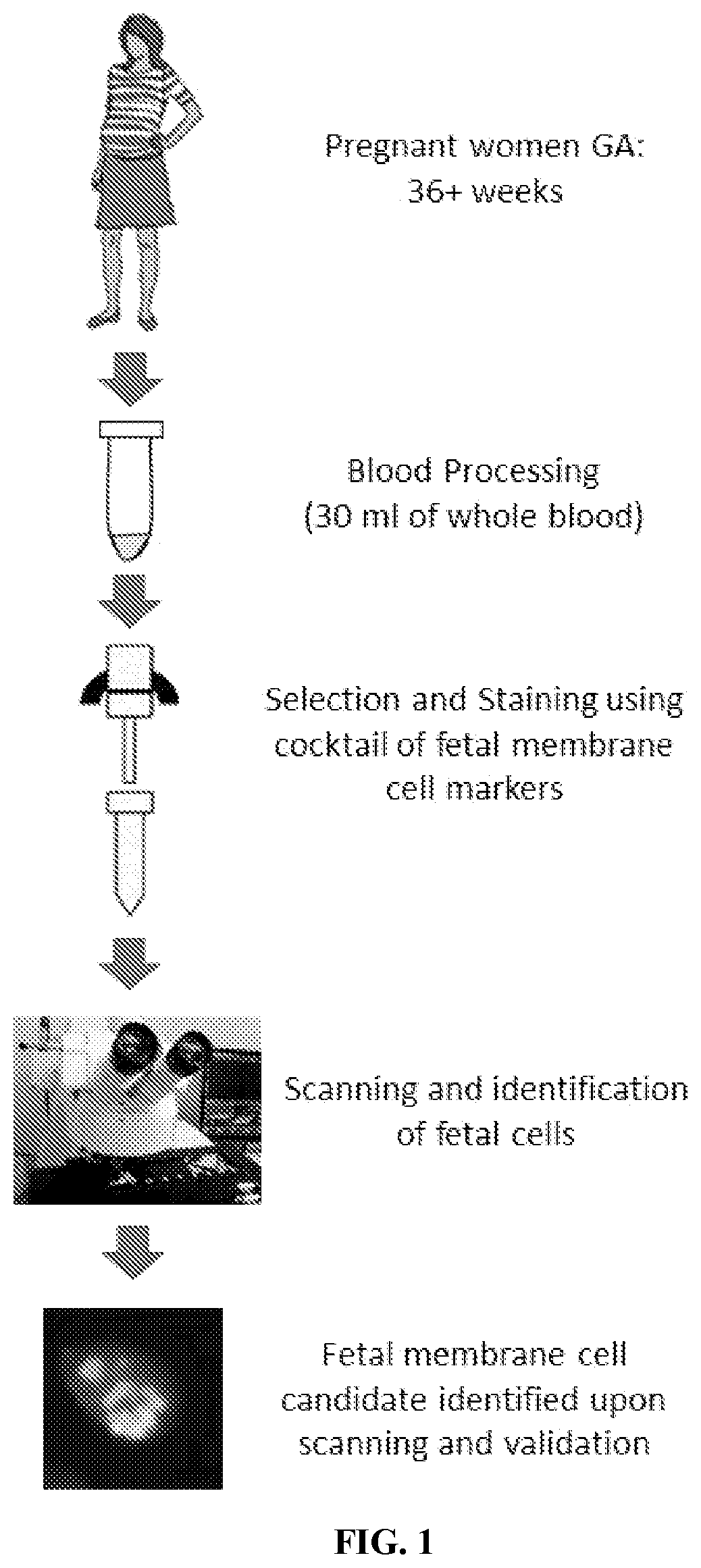 fetal membrane cell identified in pregnant woman at 36+ weeks of gestation. Fetal Fetal Extra Membrane Membrane FMCCs FMCCs FMCs Candidate Cells (FMCs) with no lost found Sample Cells confirmed XY-FISH during after No (FMCCs) by XY-FISH signals# XY-FISH Y-scan PTB-1 7 5 2 0 3 PTB-2 18 0 15 3 —* PTB-3 11 11 0 0 —* #XY-FISH failed on these cells. *No Y-scan performed. fetal membrane cell enrichment from pregnant woman at 10-14 weeks of gestation. Membrane Candidate Sample No Cells (FMCCs) 2529 0 2530 0 Example 3. Rare Circulating Fetal Cells for PTB Identification