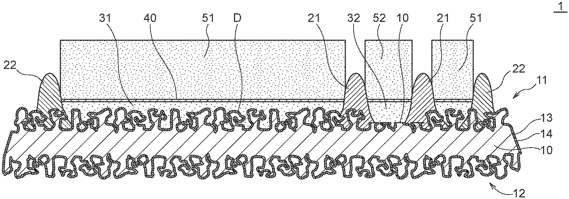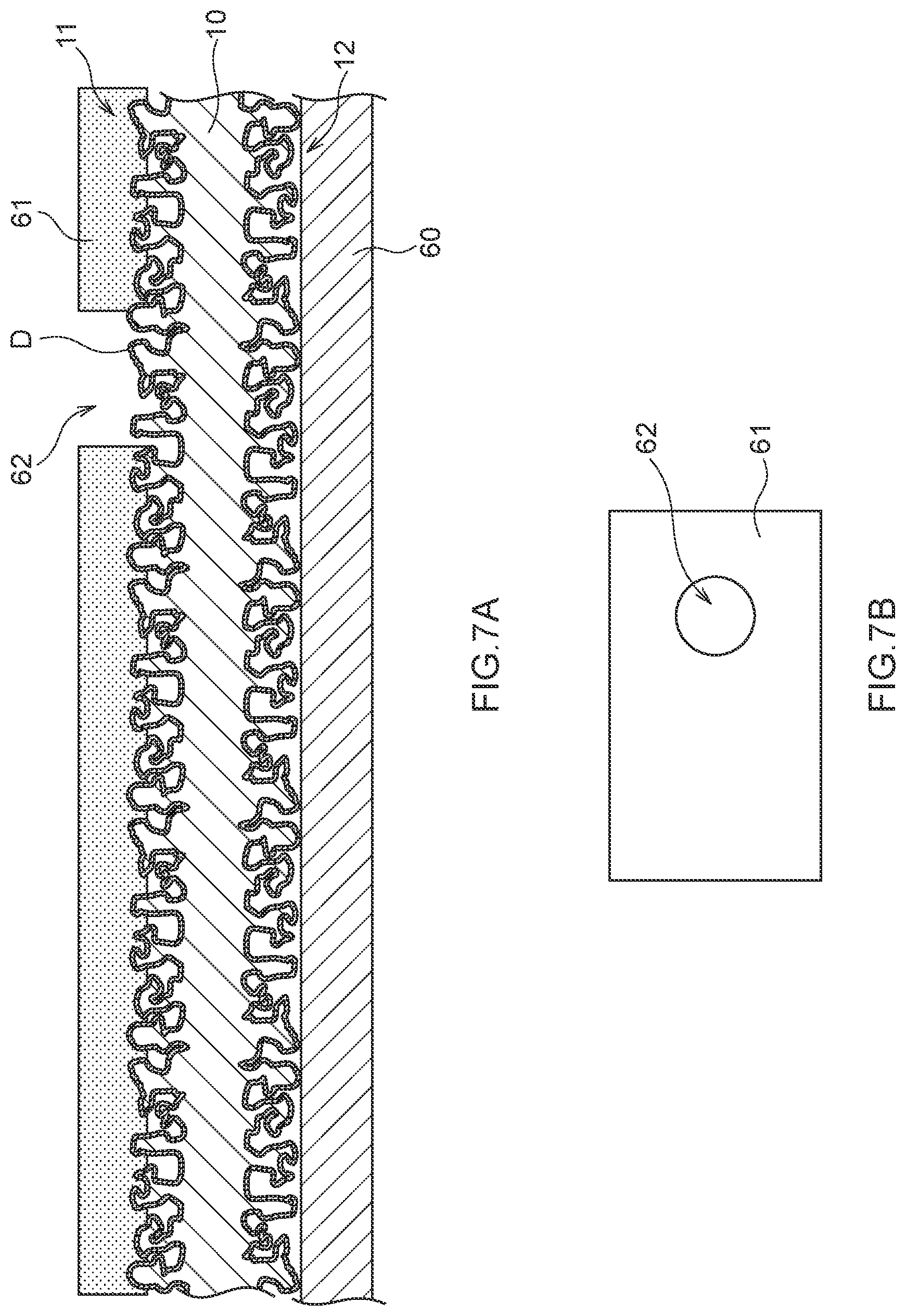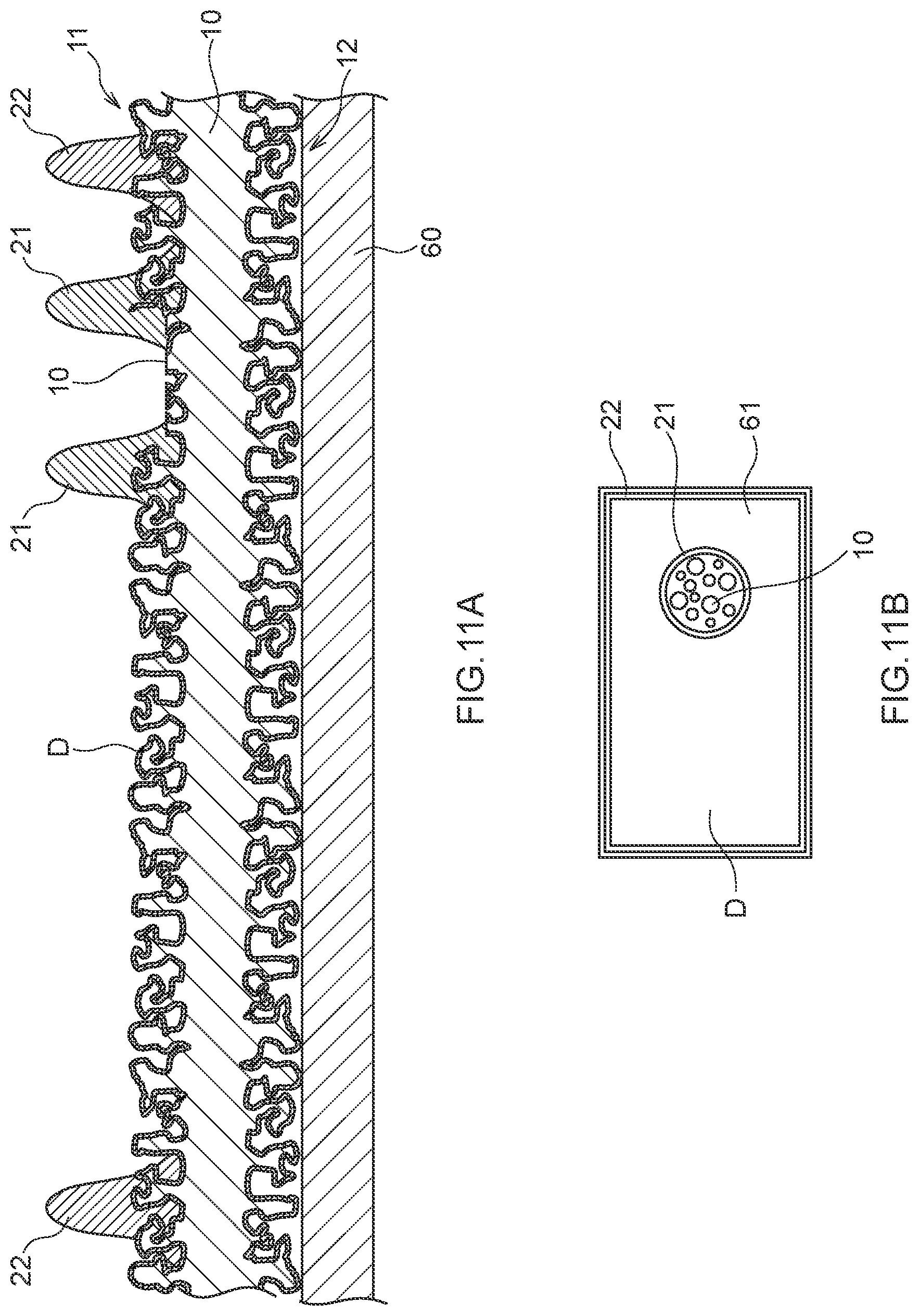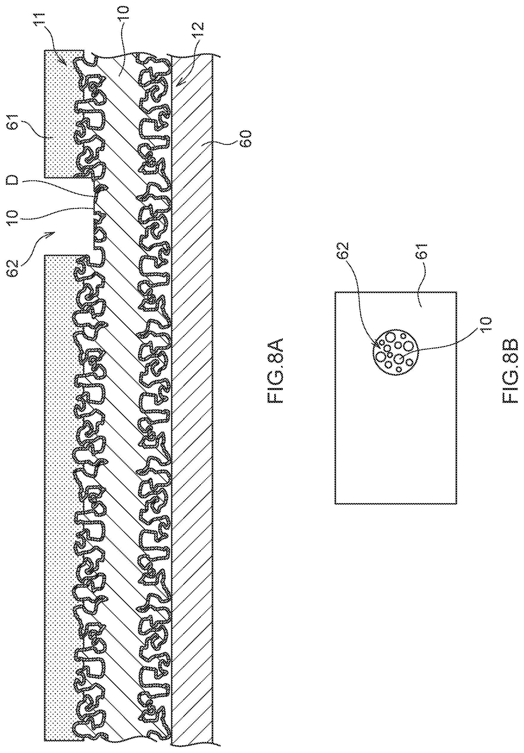 [0074]Then, a part of or the entire dielectric film D is removed with the resist 61 used as a mask to expose the metal foil 10 through the opening 62 (FIGS. 8A and 8B). The dielectric film D can be removed using a reverse sputtering method, an ion milling method, a RIE method, a wet etching method, or the like. At this stage, the upper surface 11 of the metal foil 10 has already been roughened, so that by using the reverse sputtering method, ion milling method, RIE method or the like, it is possible to prevent spread of an etchant due to a capillary phenomenon. However, a liquid etchant may be used in this process. Although the surface of the exposed metal foil 10 and the dielectric film D constitute substantially the same plane in the example illustrated in FIG. 8A, the roughened metal foil can protrude from the dielectric film D in some etching condition as illustrated in FIG. 9.