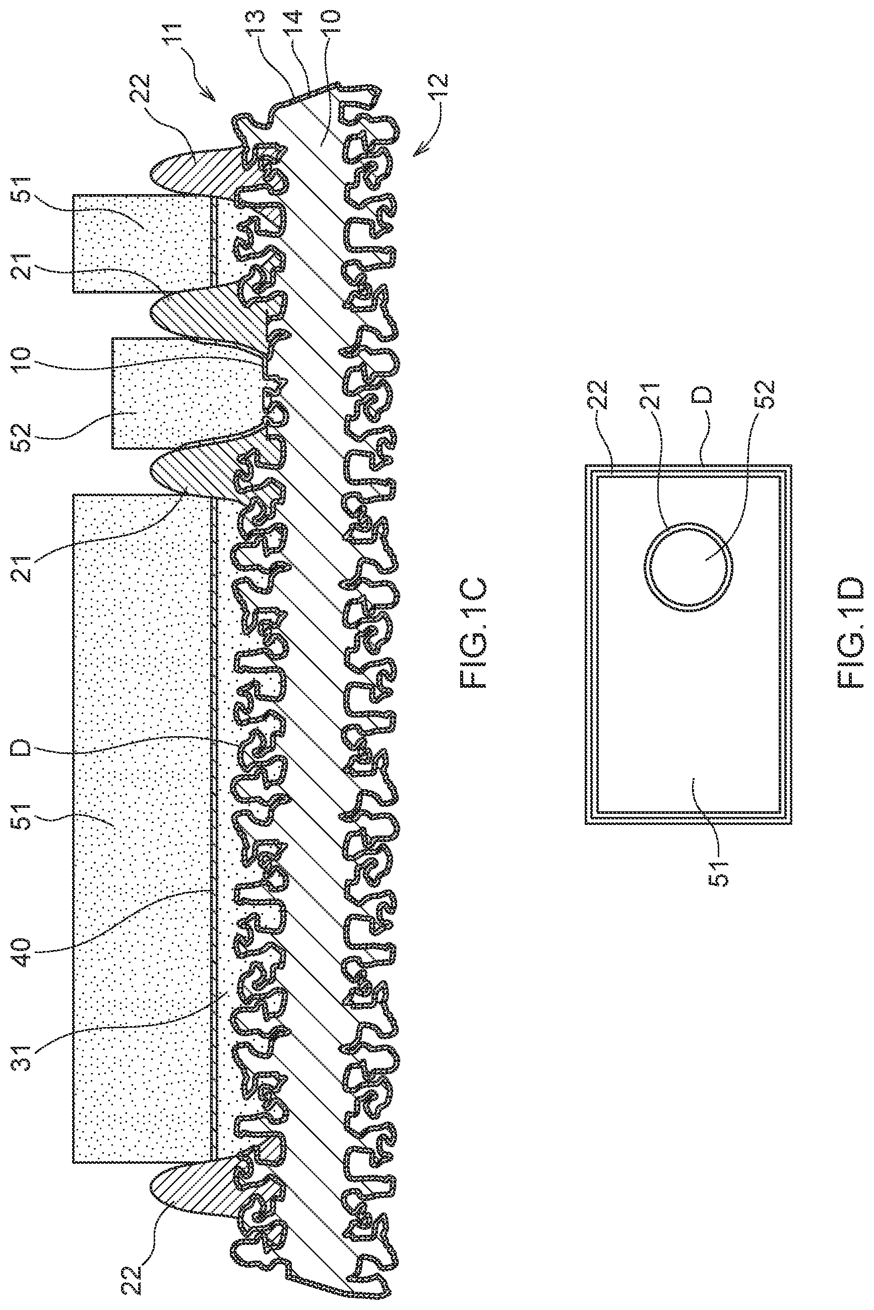[0065]The ring-shaped or polygonal annular insulating member 21 is provided in a slit that electrically isolating an electrode layer including the terminal electrode 51 and conductive member 31 from an electrode layer including the terminal electrode 52 and conductive member 32. The terminal electrode 52 and conductive member 32 are positioned within an area surrounded by the insulating member 21, and the terminal electrode 51 and conductive member 31 are positioned outside the area surrounded by the insulating member 21 and within an area surrounded by the insulating member 22. In the area surrounded by the insulating member 21, a part of or the entire dielectric film D formed on the upper surface 11 of the metal foil 10 is removed, and thus an opening is formed in the dielectric film D. As a result, the terminal electrode 52 is electrically connected to the metal foil 10 through the conductive member 32. Alternatively, as illustrated in FIGS. 1C and 1D, the conductive member 32 may be omitted to connect the metal foil 10 and terminal electrode 52 directly or through the seed layer 40. On the other hand, at the outside of the area surrounded by the insulating member 21, the dielectric film D formed on the upper surface 11 of the metal foil 10 is not removed. That is, the conductive member 31 contacts the dielectric film D without contacting the metal foil 10, so that the terminal electrode 51 and metal foil 10 are electrically isolated from each other. Thus, the terminal electrodes 51 and 52 function as a pair of capacitance electrodes opposite to each other through the dielectric film D. The dielectric film D is formed on the roughened upper surface 11 of the metal foil 10, that is, the surface area of the upper surface 11 is increased, allowing a large capacitance to be obtained.