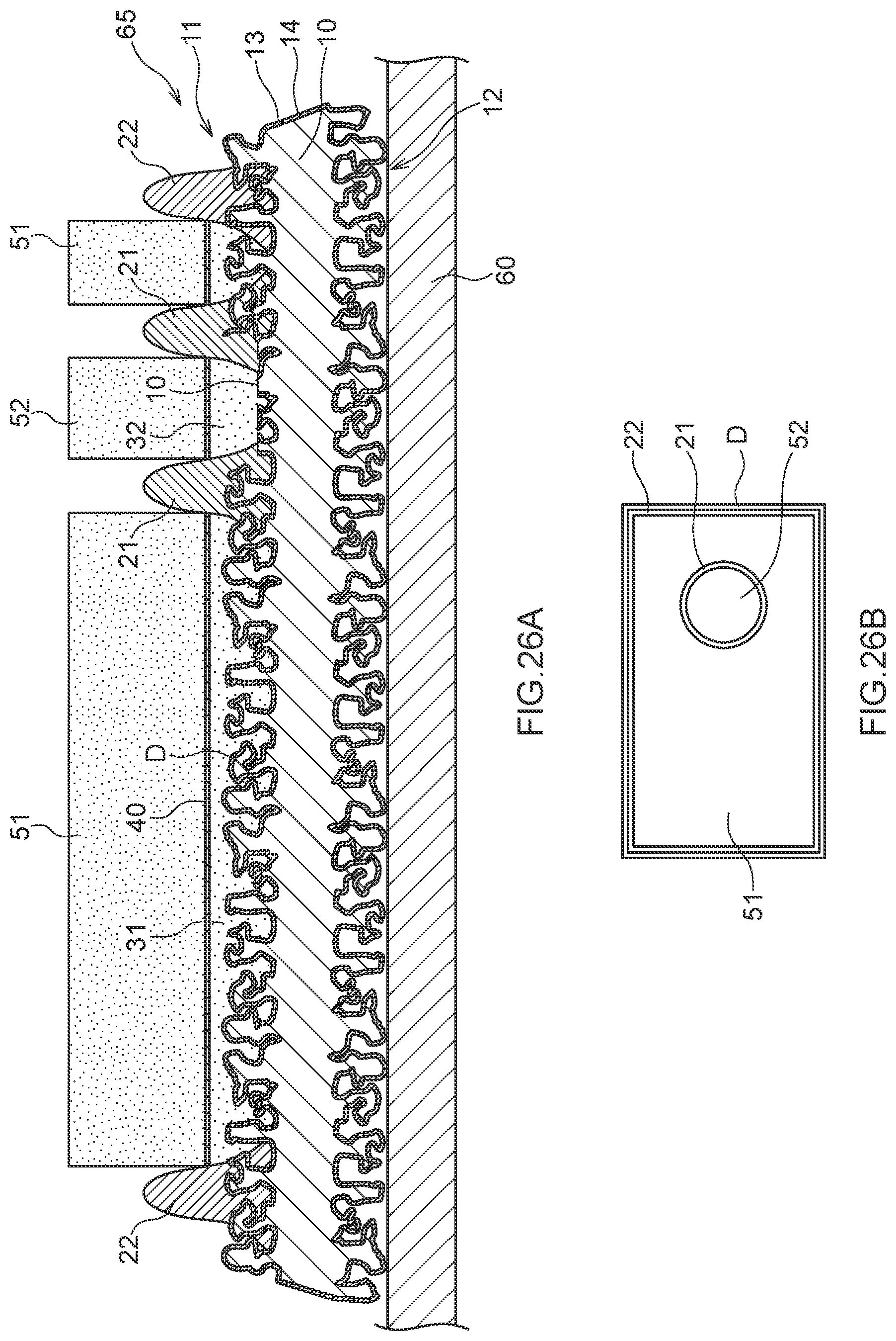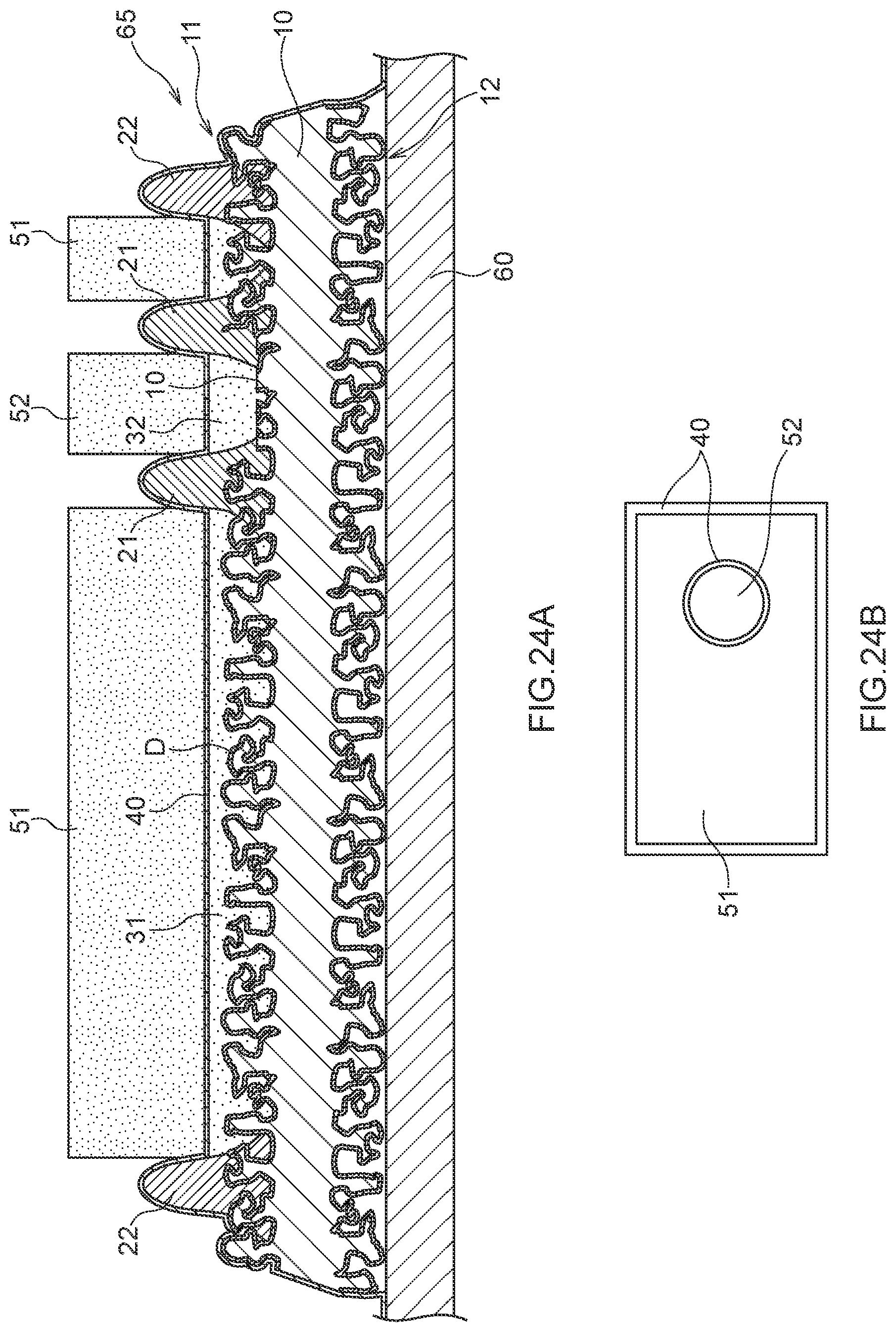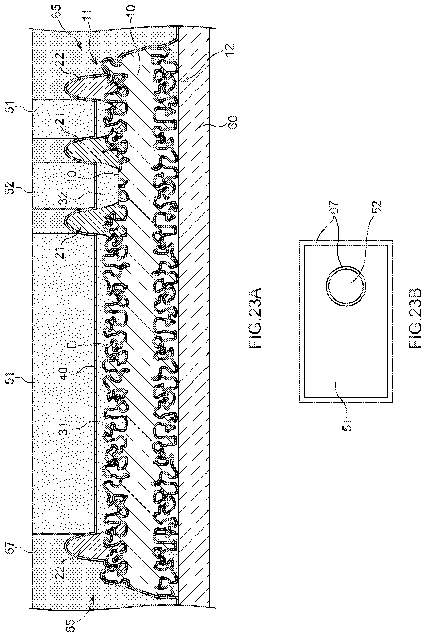 [0080]Then, after removal of the resist 64 (FIGS. 18 and 19), the conductive members 31 and 32 in a paste or liquid form each made of a conductive polymer material are formed in an area surrounded by the insulating member 22 (FIGS. 20A and 20B). Specifically, the conductive member 32 is positioned within an area surrounded by the insulating member 21, and the conductive member 31 is positioned outside the area surrounded by the insulating member 21 and within an area surrounded by the insulating member 22. The conductive members 31 and 32 are in a paste or liquid form and are thus filled up to the bottom of the porous layer 11a due to capillary action. As a result, the conductive member 31 contacts the dielectric film D without contacting the metal foil 10, while the conductive member 32 contacts the metal foil 10. Note that the terminal electrode 52 may be directly formed without forming the conductive member 32.