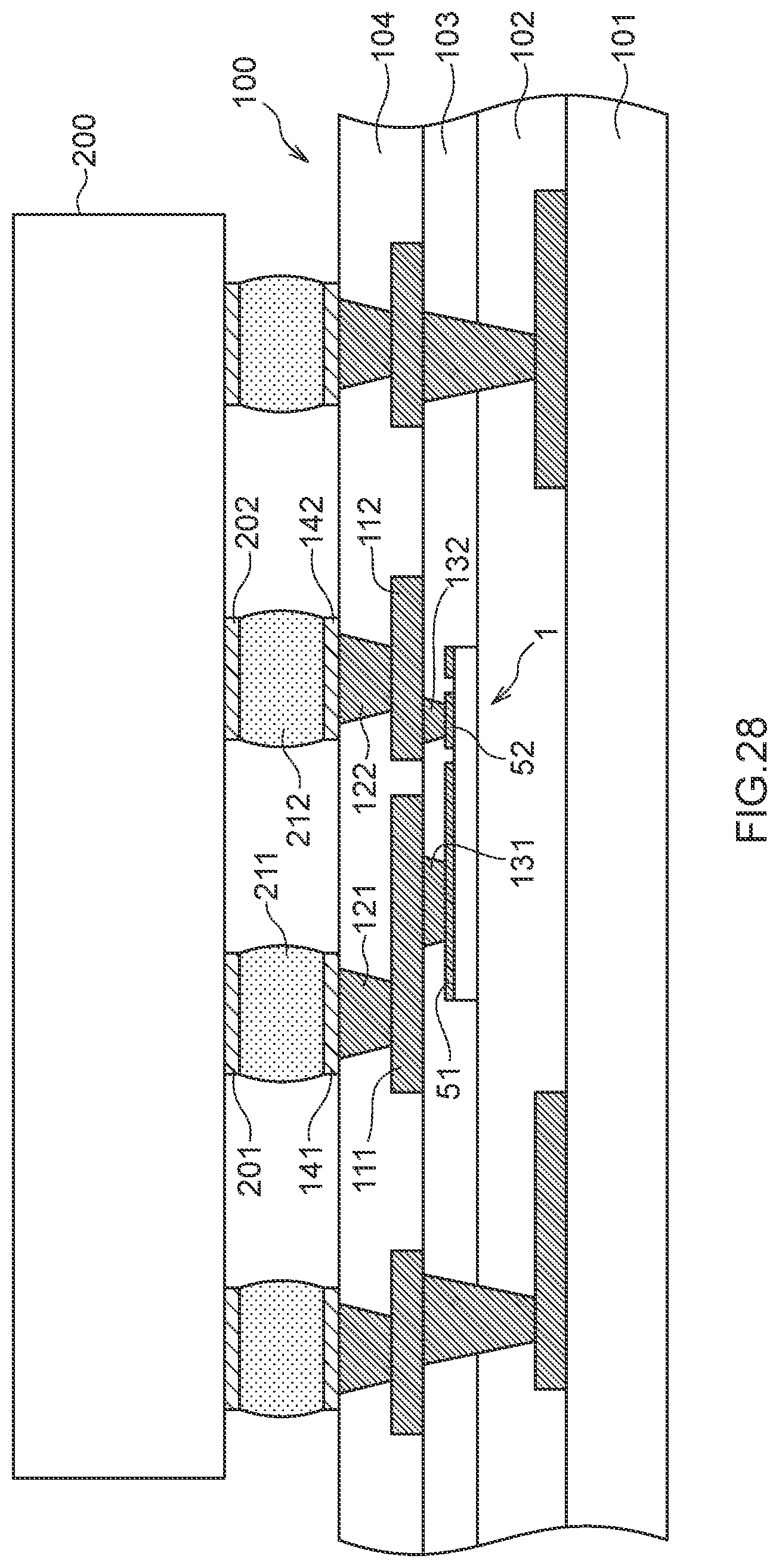 [0084]An electric circuit substrate illustrated in FIG. 28 has a configuration in which a semiconductor IC 200 is mounted on the multilayer substrate 100. The multilayer substrate 100 includes a plurality of insulating layers including insulating layers 101 to 104 and a plurality of wiring patterns including wiring patterns 111 and 112. The number of insulating layers is not particularly limited. In the example illustrated in FIG. 28, the thin film capacitor 1 is embedded between the insulating layers 102 and 103. There are provided on the surface of the multilayer substrate 100 a plurality of land patterns including land patterns 141 and 142. The semiconductor IC 200 has a plurality of pad electrodes including pad electrodes 201 and 202. For example, one of the pad electrodes 201 and 202 is a power supply terminal, and the other one thereof is a ground terminal. The pad electrode 201 and land pattern 141 are connected to each other through a solder 211, and the pad electrode 202 and the land pattern 142 are connected to each other through a solder 212. The land pattern 141 is connected to the terminal electrode 51 of the thin film capacitor 1 through a via conductor 121, the wiring pattern 111, and a via conductor 131. The land pattern 142 is connected to the terminal electrode 52 of the thin film capacitor 1 through a via conductor 122, the wiring pattern 112, and a via conductor 132. With this configuration, the thin film capacitor 1 functions as a decoupling capacitor for the semiconductor IC 200.