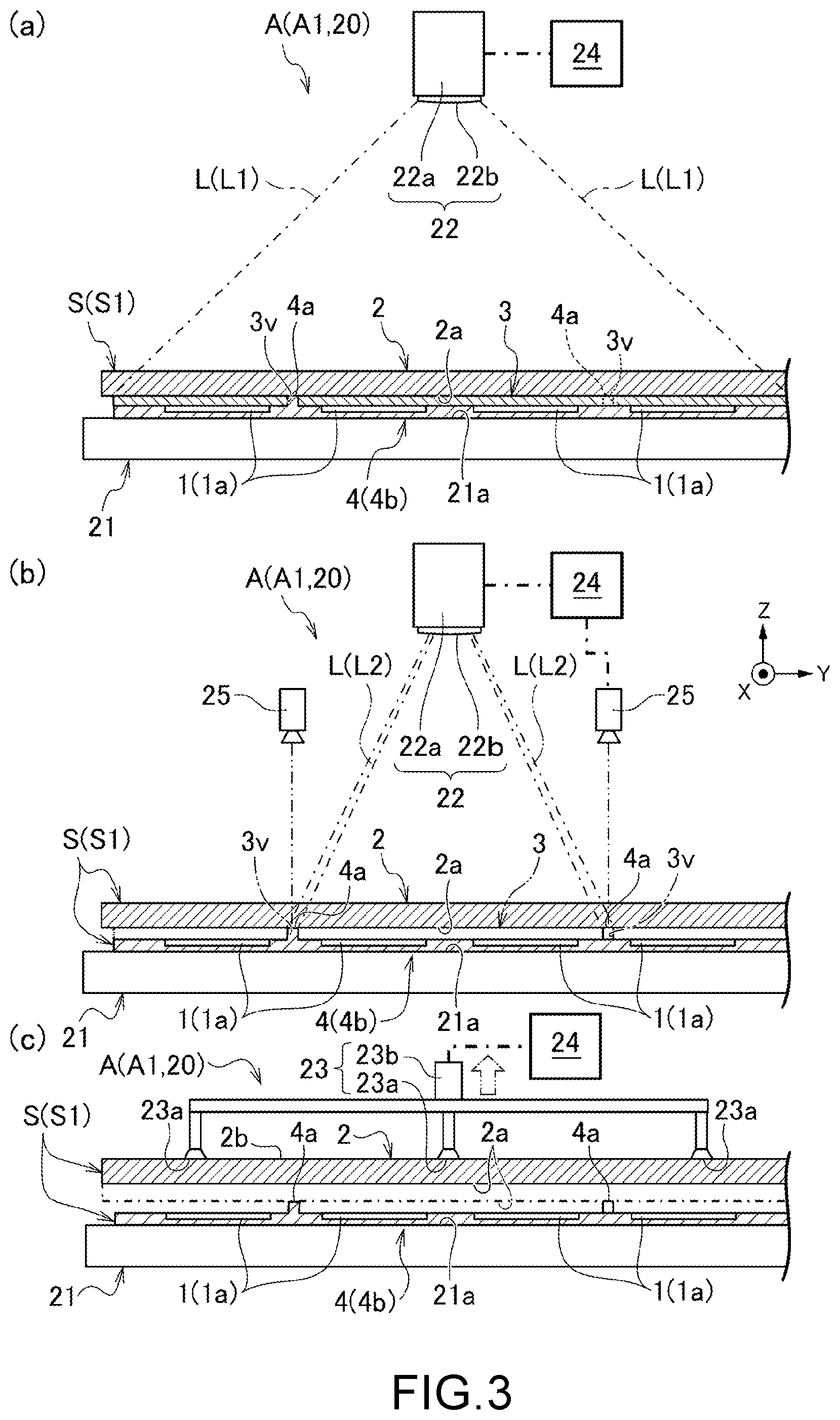 In the case of the first laminated body S1 shown in FIG. 3 at (c), the supporting body 2 is isolated and moved away in the Z direction from the workpieces 1 and the sealing layer 4b of the first laminated body S1 held by the peeling holding member 21.