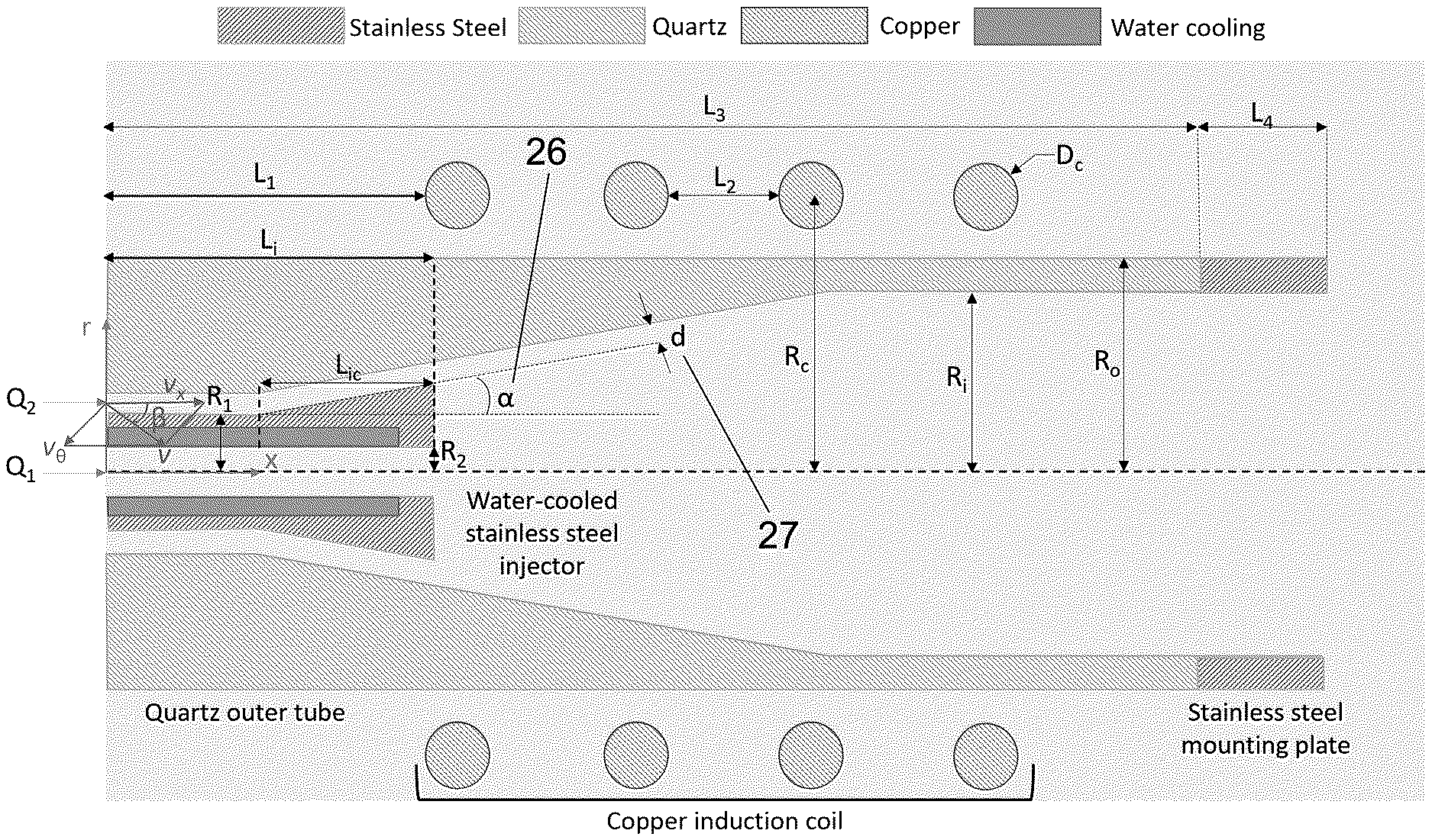 a) generating an inductively coupled plasma discharge by means of a conical torch; b) injecting the said material into the plasma discharge, by way of suspending the said material in particle form in a liquid carrier; c) evaporating the carrier liquid and desolvating the said suspension by means of said plasma discharge and agglomerating the material particles into at least partially or fully molten drops, or injecting the said material into the plasma discharge in the form of powder, rod, or wire, and d) turning the injected powder, rod, or wire material into at least partially or fully molten drops by means of the plasma discharge, whereby said higher power density of the plasma discharge due to the conical geometry melts a greater portion of the injected material and leads to a denser, more uniform coating with improved mechanical properties. 22. The plasma spray method of 23. A powder production process by atomization and melting of a given material, comprising: