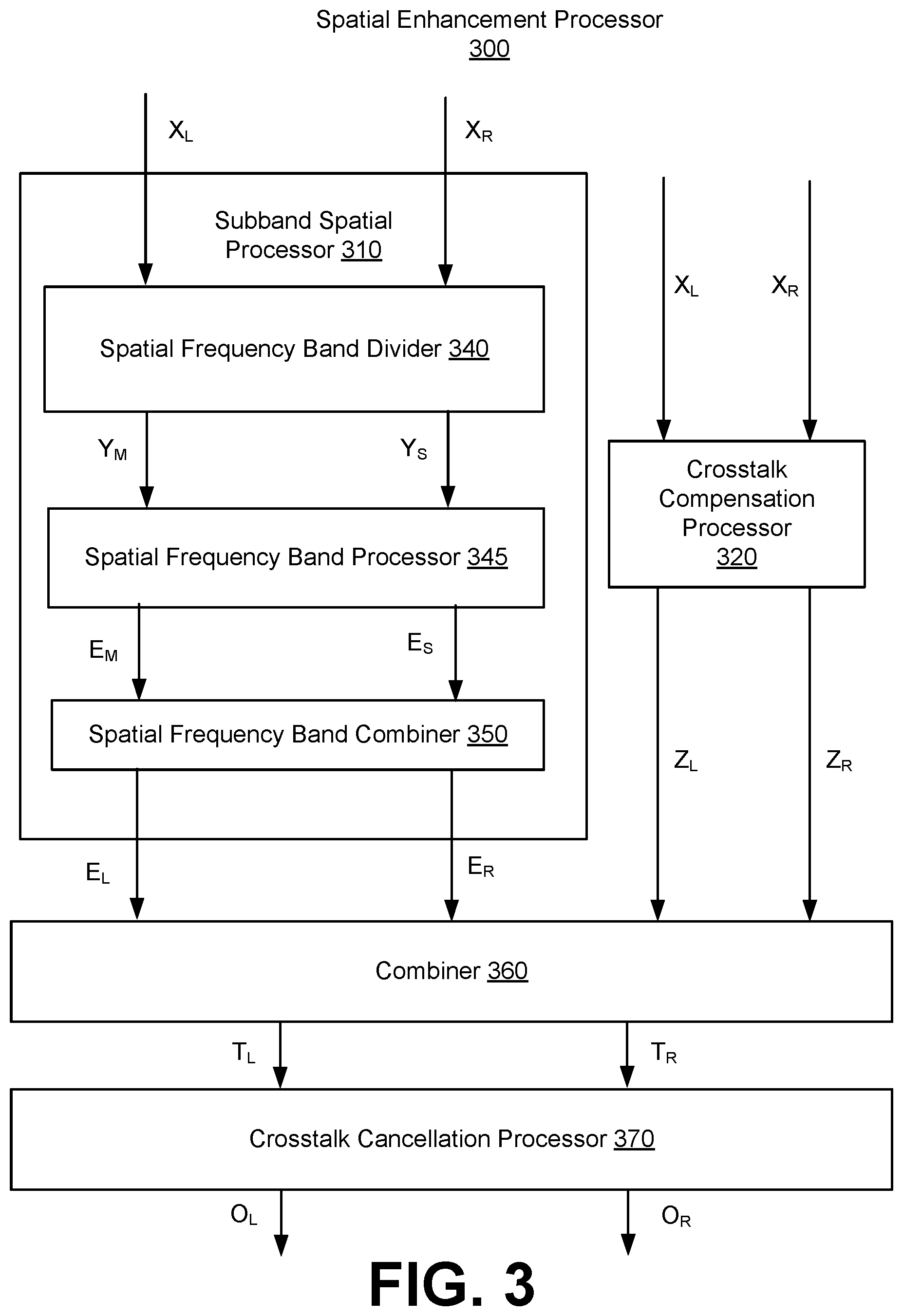 The spatial enhancement processor 700 includes the subband spatial processor 310, a crosstalk compensation processor 720, a crosstalk simulation processor 780, and a combiner 760. The crosstalk compensation processor 720 receives the input channels XLand XR, and performs a processing to compensate for artifacts in a subsequent combination of a crosstalk simulation signal W, including left crosstalk simulation signal WL and right crosstalk simulation signal WR, generated by the crosstalk simulation processor 780 and the enhanced signal E, including the left enhanced channel ELand the right enhanced channel ER, generated by the subband spatial processor 310. The crosstalk compensation processor 720 generates a crosstalk compensation signal Z, including a left crosstalk compensation channel ZLand a right crosstalk compensation channel ZR. The crosstalk simulation processor 780 generates the left crosstalk simulation channel WLand the right crosstalk simulation channel WR. The subband spatial processor 310 generates the left enhanced channel ELand the right enhanced channel ER. Additional details regarding the crosstalk simulation processor 780 are discussed below in connection with FIG. 8.