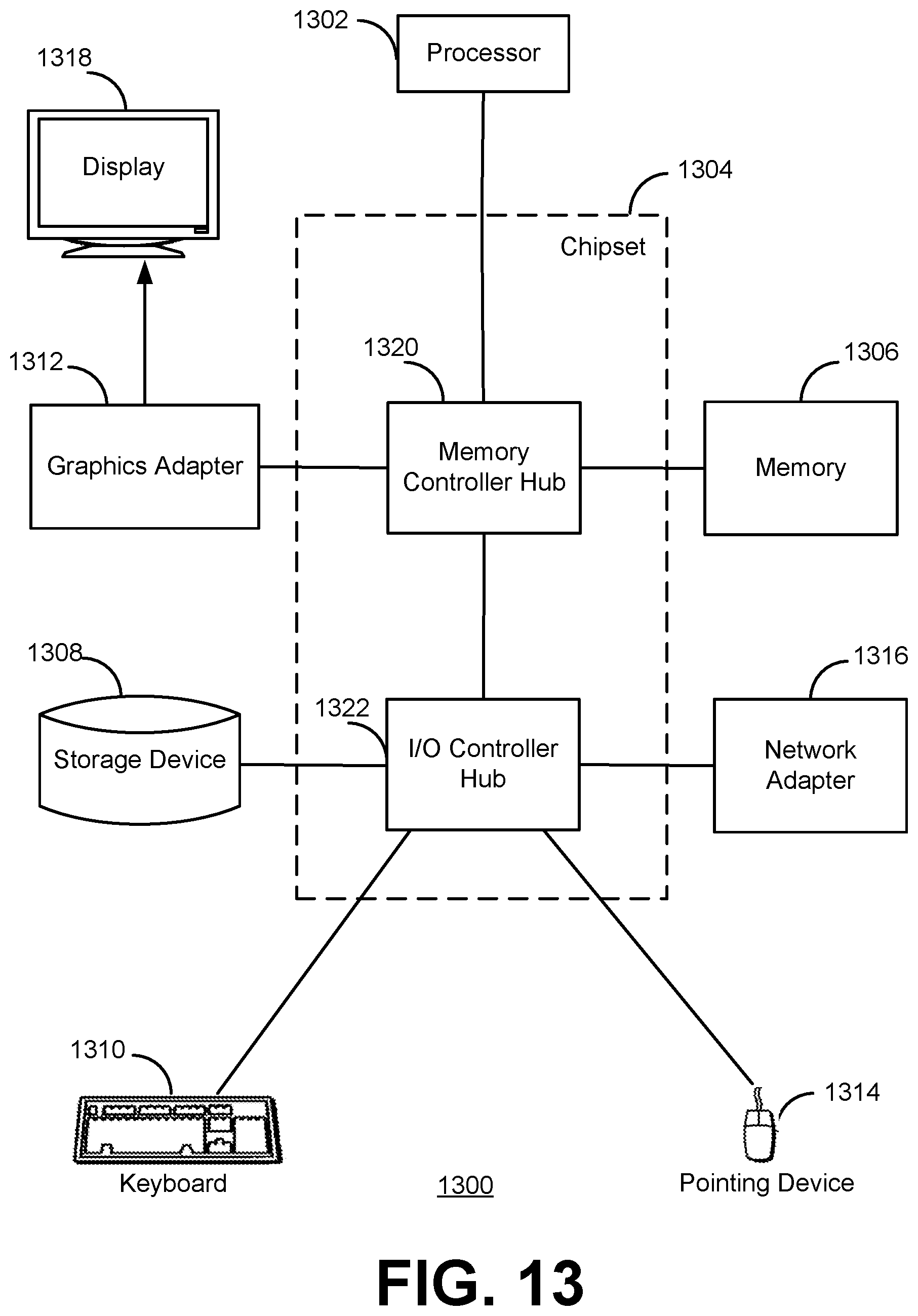 The pointing device 1314 is used in combination with the keyboard 1310 to input data into the computer system 1300. The graphics adapter 1312 displays images and other information on the display device 1318. In some embodiments, the display device 1318 includes a touch screen capability for receiving user input and selections. The network adapter 1316 couples the computer system 1300 to a network. Some embodiments of the computer 1300 have different and/or other components than those shown in FIG. 13.