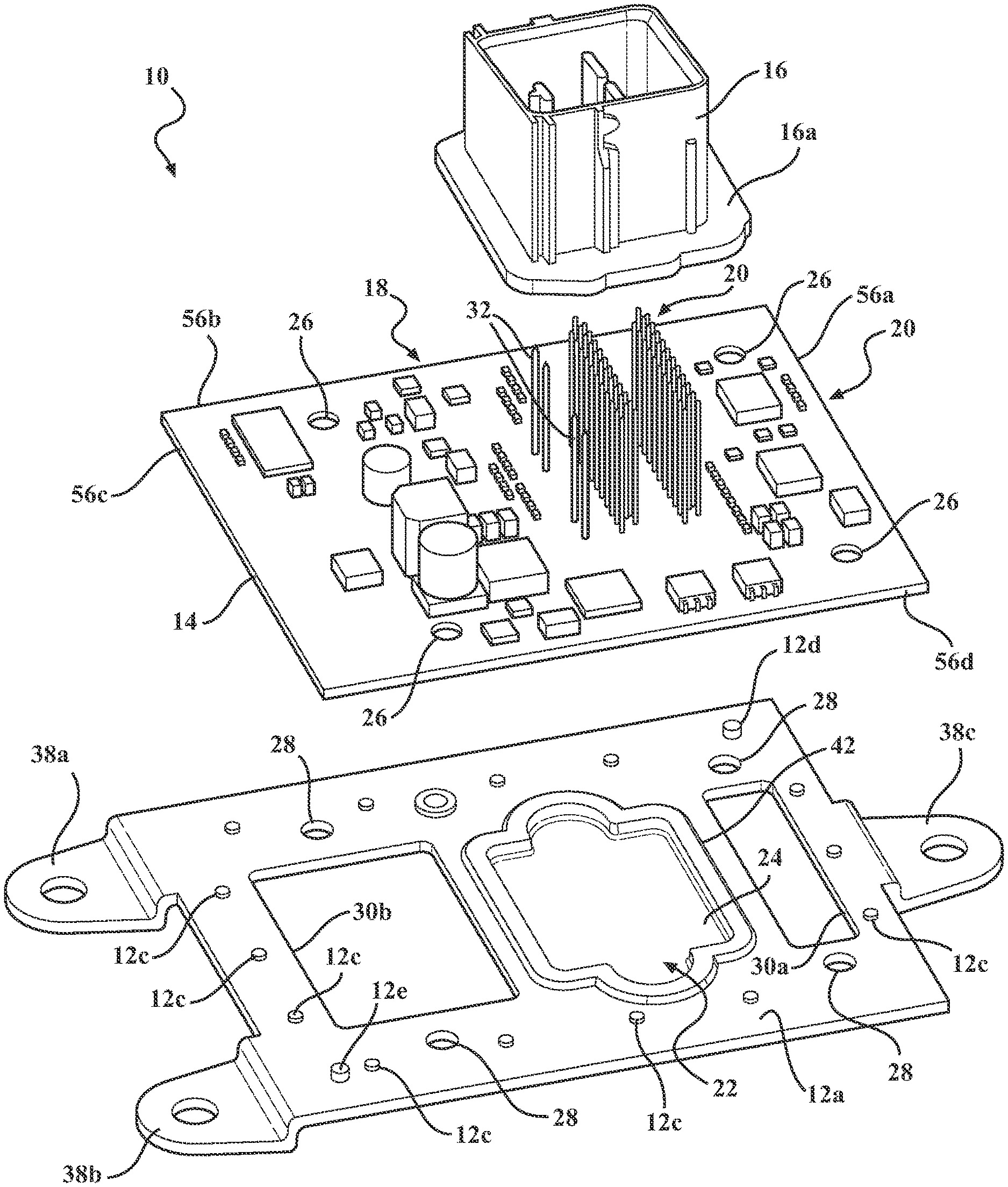 providing a base plate; and providing a printed circuit board (PCB); and providing circuitry mounted to the PCB; placing the PCB in contact with the base plate; overmolding an epoxy around portions of the base plate, portions of the circuitry, and portions of the PCB to form an encapsulation housing which connects the base plate to the PCB. 12. The method of 13. The method of providing at least one flow aperture integrally formed as part of the base plate; overmolding the epoxy around portions of the base plate and the PCB such that at least a portion of the encapsulation housing is disposed in the at least one flow aperture, in between the first layer and the second layer. 14. The method of 15. The method of providing a first plurality of assembly apertures integrally formed as part of the PCB; and providing a second plurality of assembly apertures integrally formed as part of the base plate; aligning each of the first plurality of assembly apertures with a corresponding one of the second plurality of assembly apertures as the PCB is placed in contact with the base plate, such that a portion of the encapsulation housing extends through each of the first plurality of assembly apertures and the second plurality of assembly apertures once the epoxy is overmoled around portions of the base plate and the PCB. 16. The method of providing a connector shroud; and providing at least one circumferential flange being part of the connector shroud; mounting the connector shroud to the PCB in an area unoccupied by the encapsulation housing such that the at least one circumferential flange is in contact with the PCB, and a portion of the circuitry is surrounded by the connector shroud; over molding the epoxy is around portions of the base plate and the PCB such that the at least one circumferential flange is disposed between a portion of the encapsulation housing and the PCB, securing the connector shroud to the PCB. 17. The method of providing a cover integrally formed as part of the base plate; and providing a cavity integrally formed as part of the cover, such that a portion of the encapsulation housing is adjacent the cover as the epoxy is overmolded around portions of the base plate and the PCB. 18. The method of providing at least one groove integrally formed as part of the encapsulation housing; overmolding the epoxy around portions of the base plate and the PCB to form the encapsulation housing such that a portion of the base plate is disposed in the at least one groove.