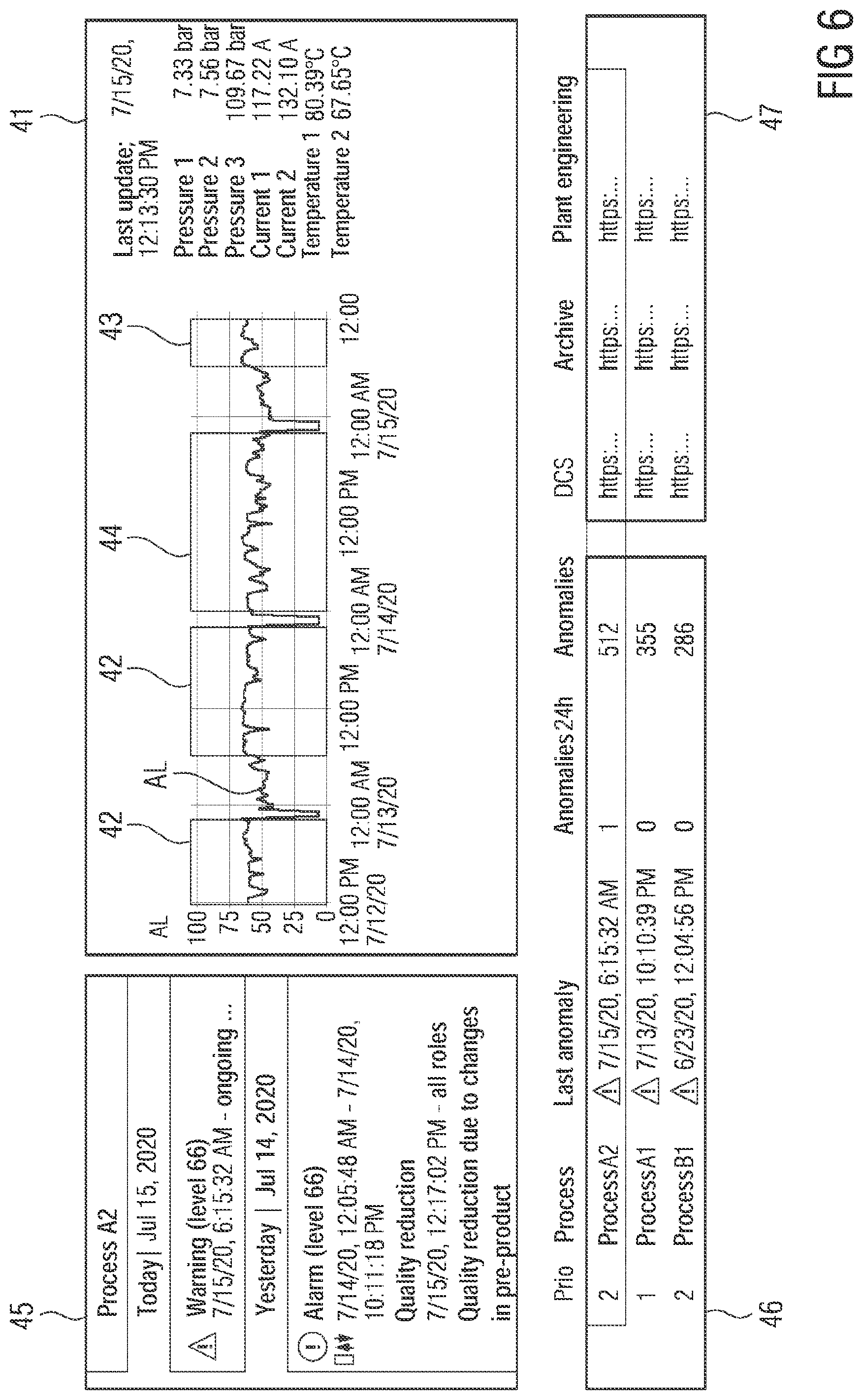 The apparatus 15 is connected to the plant network 11 and via the network accesses current and historical measured data M (as well as where necessary additional data of the automation system 2), which is provided by the process data archive server 14 and the server 5. The automation system furthermore comprises a simulator (or digital twin) 9 for the production process 3. The simulator 9 simulates the production process 3, for example, based on physical and/or chemical models. The simulator 9 is likewise connected to the plant network 11. The apparatus 15 can access simulation data S of the simulator 9 or can receive it from the simulator 9 via the network. As shown more precisely in The apparatus 15 is configured to provide the plant personnel, in particular its management level, with the different performance indicators La, Lb, Lc, Ld for selection via the user interface 17 and to detect a subsequent input of selection information W about a selection of one of the performance indicators La, Lb, Lc, Ld, here for example of the performance indicator La. Then, as a function of the detected selection information W, the apparatus 15 activates the anomaly detector unit 16 The anomaly detector units 16 The anomaly detector 16 or its trained artificial intelligence 18 can however also (as shown in The apparatus 15 is furthermore configured to provide the plant personnel, in particular its management level, via the user interface 17 with different operational or business objectives Z for selection and to detect a subsequent input of selection information Y via a selection of one or more of the operational or business objectives Z. The apparatus 15 furthermore comprises a configuration facility 19, which is configured to configure the anomaly detector 16, in particular the artificial intelligence 18 or 18 Preferably, the current and historical measured data M is available as a time series of measured data and, upon detection and prediction of the anomalies by the artificial intelligence 18, a temporal sequence of the measured data (current and historical measured data) or temporal relationships between this measured data are taken into account. In other words, a time series analysis is undertaken by the artificial intelligence. Thus, changes in the time series of measured data can be detected and future time series of performance indicators predicted. In the case of To this end, There can still be firewalls 32, 33 arranged between the connection server 31 and the apparatus 15 and also between the apparatus 15 and the user interface 37. As an alternative, the simulator 9 can likewise be installed in the cloud 30 instead of in the plant 1. In an area 41 over the course of time for a performance indicator, here for example the quality of a product created, a probability AL (AL=Anomaly Level) of an anomaly is shown. 42 in this case designates time areas in which an anomaly is present with only relatively low probability. 43 designates a time area in which an anomaly is already present with higher probability and therefore a warning has been generated. 44 designates a time area in which an anomaly is present with comparatively high probability. Therefore, an alarm message has been generated. Furthermore, in the area 41 measured data from a few sensors is also output, such as pressures (Pressure 1, Pressure 2, Pressure 3), electrical currents (Current 1, Current 2) and temperatures (Temperature 1, Temperature 2). In an area 45, the most recent alarms (Alarm (level 66)) and warnings (Warning (level 66)) of all monitored production processes or of a selected production process (here process A2) are output. In conjunction with the alarm, the monitored performance indicator (here the quality), the effect of the anomaly (here a reduction in quality) as well as a cause (here quality reduction due to change in immediate product) are also output. In an area 46, the production process with the most recent detected or predicted anomalies at the topmost position of a list of the production processes (here process A2, process A1, process B1) together with respective information about the last anomaly, the number of the anomalies in the last 24 hours and the overall number of anomalies is output. In an area 47, additional information about the selected production process, such as from the process control system, is incorporated with the aid of links. In an area 53, a rating of the alarm, a classification or effect with regard to the performance indicator (classification) and a cause analysis (Note) are output. In a first step 61, input training data, which represents historical measured data M of the sensors 7, is received. Preferably, this involves time series of measured data. In a second step 62, output training data, which represents anomalies in the historical measured data M, is received, where the output training data comprises assignments to at least one of a number of different performance indicators La, Lb, Lc, Ld of the production process 3. The performance indicators La, Lb, Lc, Ld each relate to the overall production process 3. In a third step 63, the artificial intelligence is trained based on the input training data and the output training data such that these anomalies are detected and predicted at the same time for a number of different performance indicators in the production process 3. The artificial intelligence can in this case be trained by an algorithm from the field of machine learning or with the aid of rule-based or mathematical (for example, statistical) methods. Especially advantageous algorithms or methods are neural networks, autoencoders, Gaussian mixture model, boosted Gaussian mixture ensemble and isolation forest, as well as combinations of all these methods. Backpropagation with gradient-based optimization can be used as a training method in the case of neural networks, for example. Preferably, the artificial intelligence is configured and trained upon detection and prediction o
