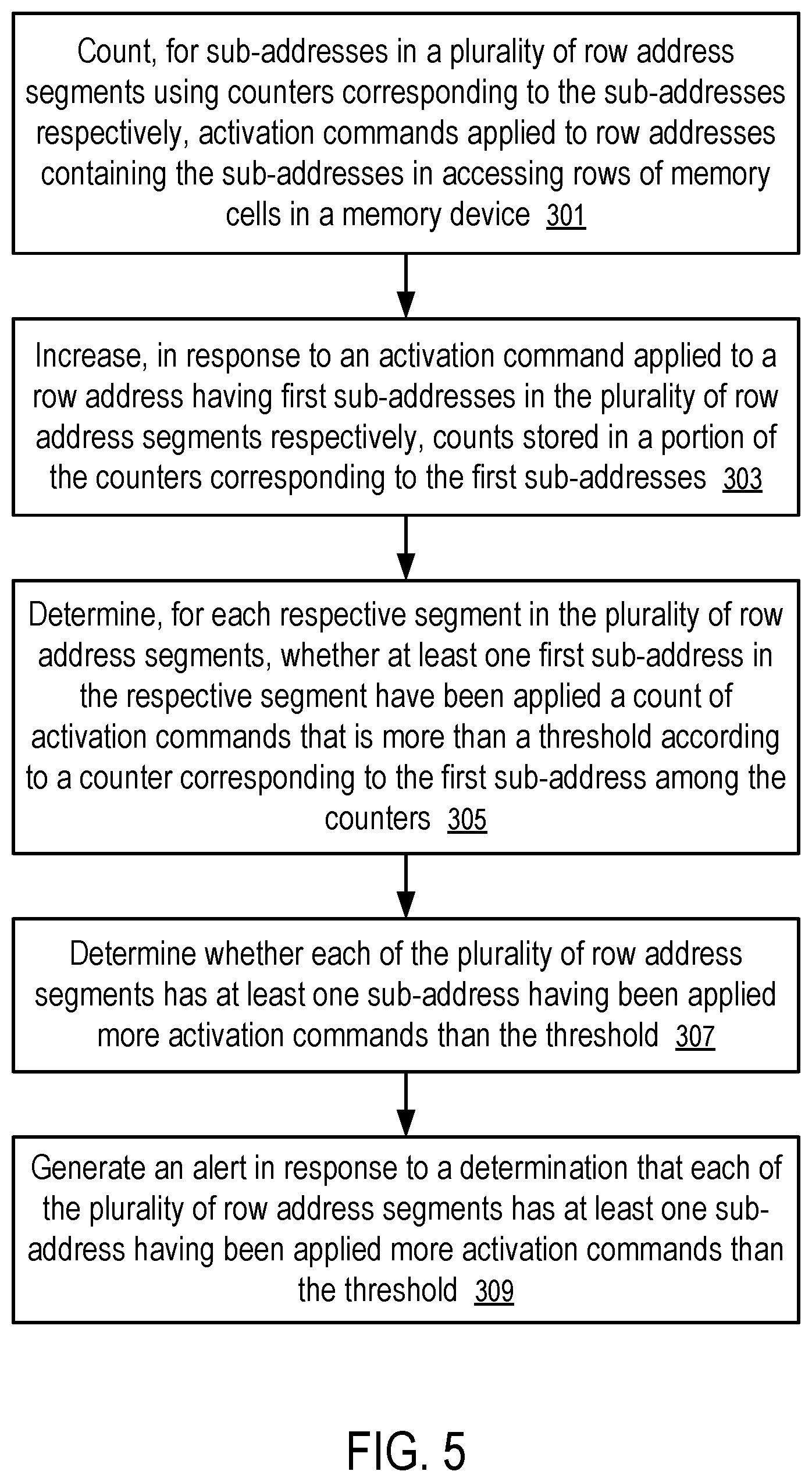 determine, for each respective segment in the plurality of segments, whether at least one first sub-address in the respective segment have been applied a count of activation commands that is more than a threshold according to a counter corresponding to the first sub-address among the counters; determine whether each of the plurality of row address segments has at least one sub-address having been applied more activation commands than the threshold; and generate an alert in response to a determination that each of the plurality of row address segments has at least one sub-address having been applied more activation commands than the threshold. 17. The system of and the respective segment represents a predetermined subset of the bits. 18. The system of start a memory refresh operation in the rows of memory cells; adjust a frequency of memory refresh operations in the rows of memory cells; throttle memory access towards row addresses related to sub-addresses having been applied excessive activation commands; reload data in the rows of memory cells; or start multiple redundant threads of computation based on redundant copies of data in the rows of memory cells; or any combination thereof. 19. The system of determine a maximum count among counts stored in counters corresponding to sub-addresses in a first segment among the plurality of row address segments; and compare the maximum count with the threshold to determine whether the first segment has at least one sub-address having been applied more activation commands than the threshold. 20. The system of compare the threshold with each of counts stored in counters corresponding to sub-addresses in a first segment among the plurality of row address segments; and determine, from results of the comparing, whether the first segment has at least one sub-address having been applied more activation commands than the threshold.