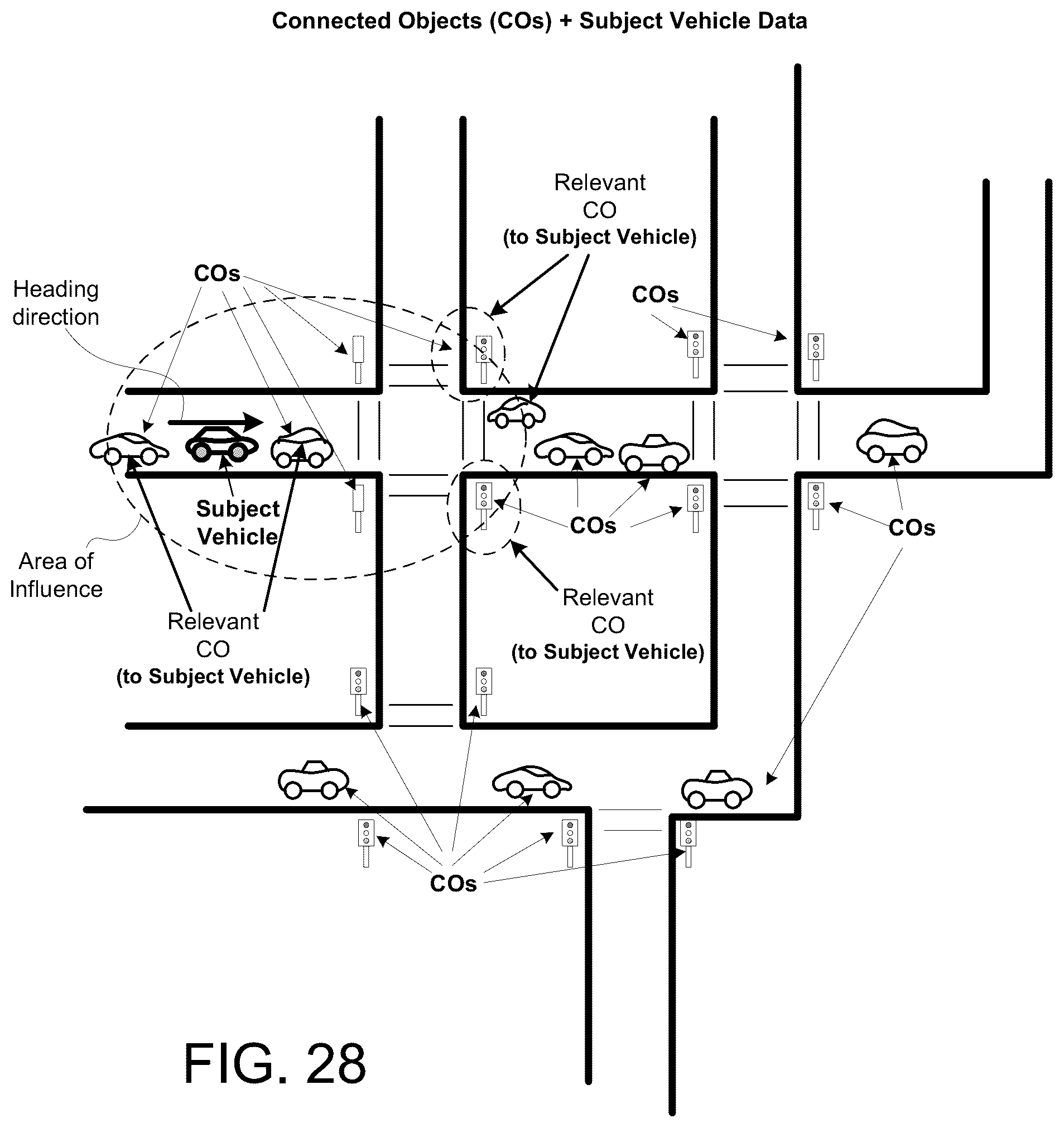 In some embodiments, said connected objects include a second vehicle that is within an area of influence of the vehicle.