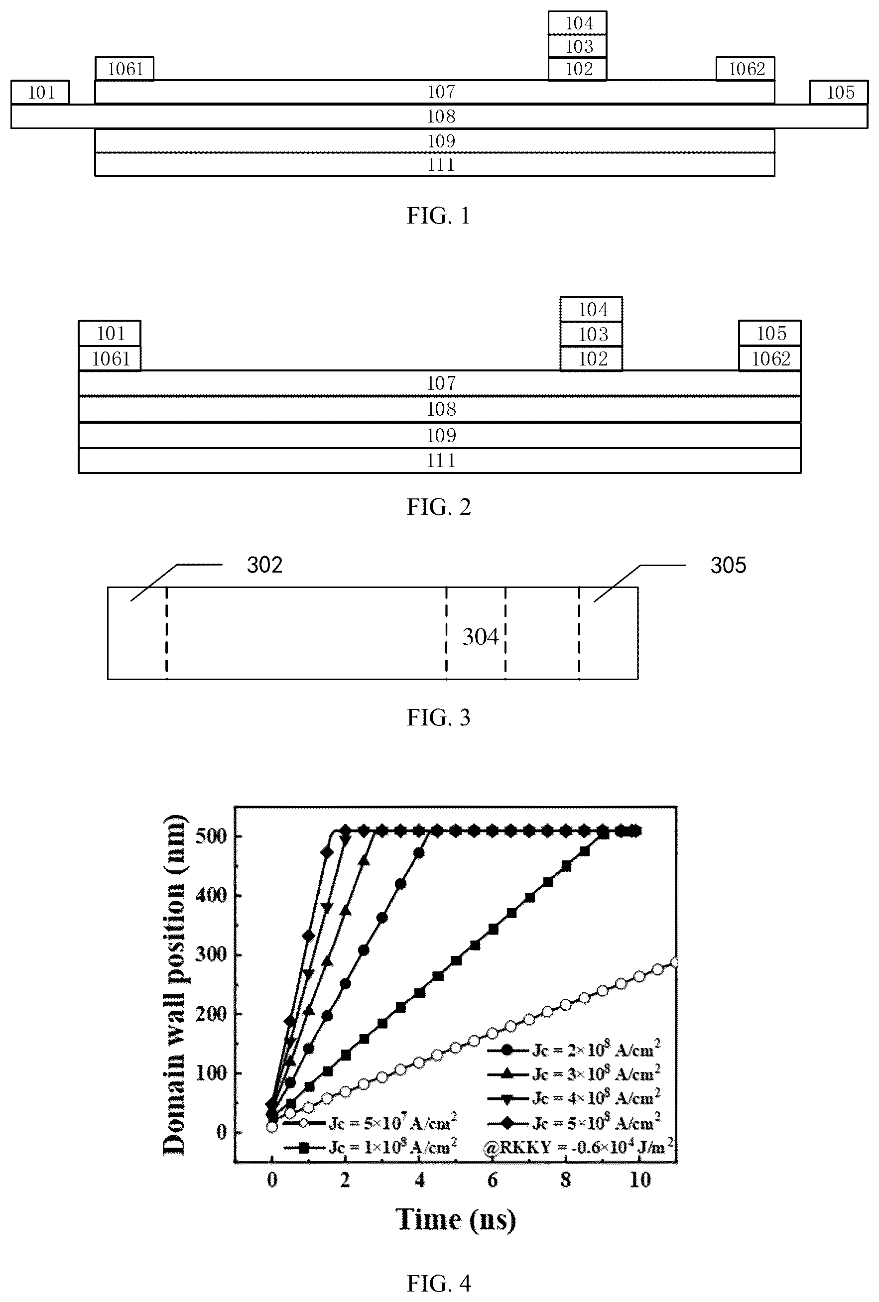 A position of the magnetic domain wall may represent a distance between the magnetic domain wall and the first pinning region. As shown in FIG. 4, with an increase of a current density, the time required for the magnetic domain wall to move from the first pinning region to the second pinning region is significantly reduced. Similarly, FIG. 5 schematically shows a curve diagram of a magnetic domain wall position changing with time under different current amplitudes when RKKY intensity is −1.0×104J/m2in an integrate process of an all-electrically-controlled spintronic neuron device provided in embodiments of the present disclosure. A position of the magnetic domain wall may represent a distance between the magnetic domain wall and the first pinning region. Comparing FIG. 4 with FIG. 5, in the integrate process of the neuron, an intensity of larger RKKY may inhibit the movement of magnetic domain wall to a certain extent, that is, an integrate velocity of the neuron may be adjusted by modulating the injected current density and RKKY intensity.