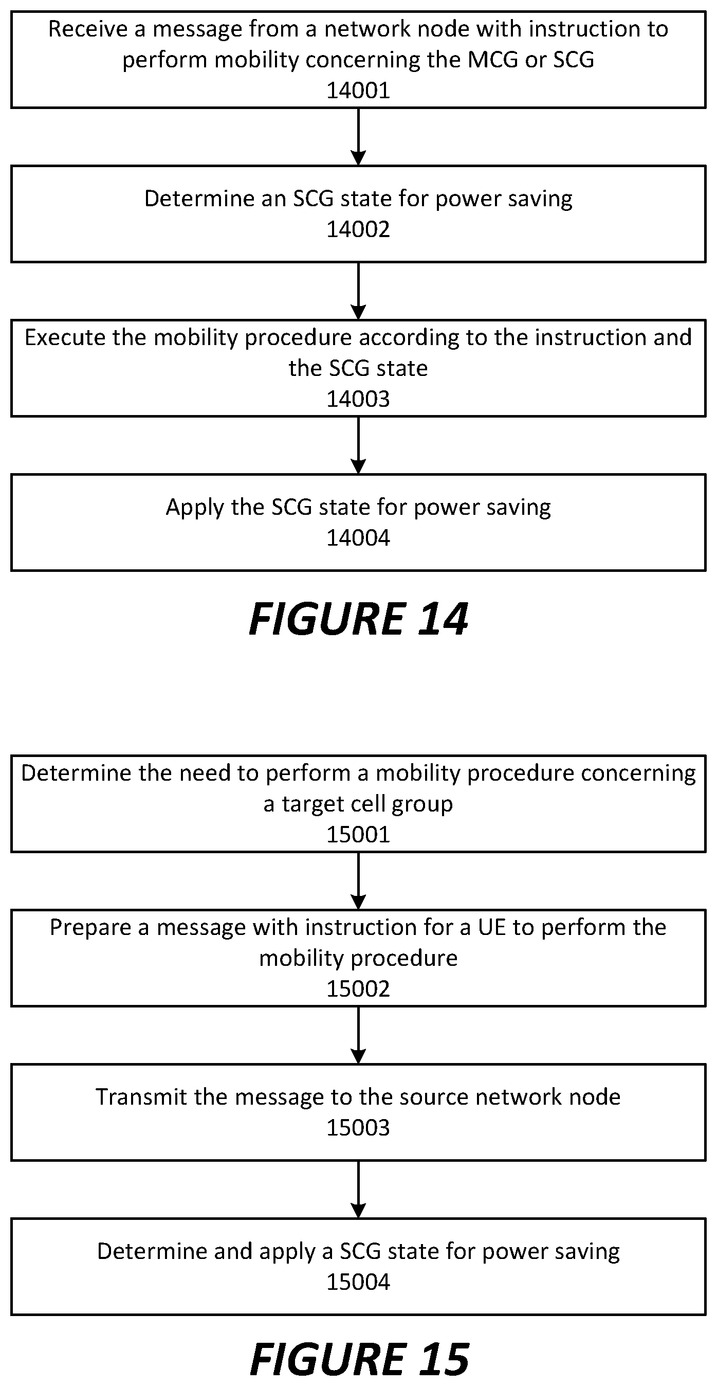 26. The method according to embodiments 24-25, wherein determining the SCG state comprises determining the SCG state for power saving in response to receiving the message from the network node during the mobility procedure concerning the MCG. 27. The method according to embodiment 26, wherein the network node comprises one of a source master node (MN) or a target MN. 28. The method according to any one of embodiments 24-27, wherein the mobility procedure comprises MCG mobility from a source MCG controlled by a source master node (MN), to a target MCG controlled by a target master node (MN). 29. The method according to any one of embodiments 24-28, wherein the message includes an indication of a SCG power state for power saving. 30. The method according to any one of embodiments 24-29, wherein determining the SCG state for power saving comprises determining the SCG state based on the indication of the message. 31. The method according to any of embodiments 24-28, wherein determining the SCG state for power saving comprises determining an SCG activated state. 32. The method according to embodiment 24, further comprising: