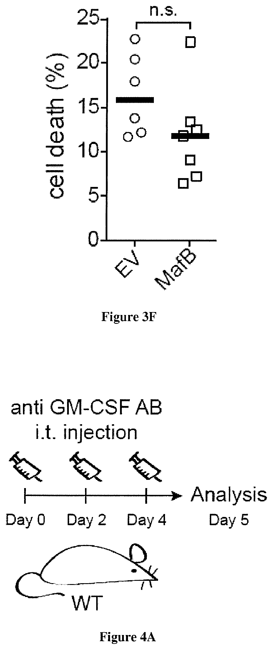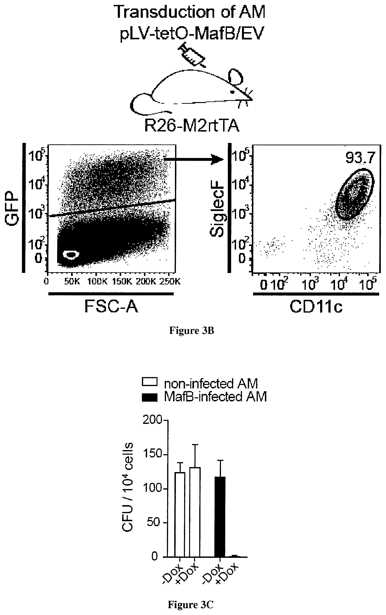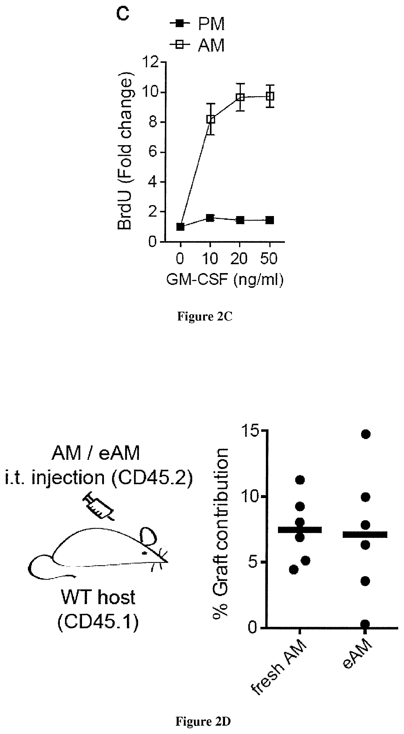 The present invention relates to methods for expanding a population of alveolar macrophages in a long term culture. In many tissues of the body, differentiated cells are frequently replaced as part of homeostatic maintenance or in response to injury. Whereas in most cases this depends on tissue-specific stem cells, tissue macrophages can be maintained by local proliferation independently of hematopoietic stem cells (1-4), possibly by self-renewal mechanisms activated in mature macrophages (5). Unlike the few examples of differentiated normal cells that can transiently re-enter the cell cycle, such as hepatocytes, macrophages can also be expanded and maintained in long-term culture without transformation or loss of differentiation. This has been observed in macrophages with deletions of two core macrophage transcription factors (6), MafB and c-Maf (Maf-DKO macrophages) (7), or in cultures derived from fetal progenitors (8). The present invention relates to methods for expanding a population of alveolar macrophages in a long term culture. In particular, the present invention is defined by the claims. An object of the present invention relates to a method of expanding a population of alveolar macrophages in a long term culture comprising culturing the population of alveolar macrophages in a culture medium supplemented with an amount of GM-CSF. As used herein, the term “alveolar macrophage” has its general meaning in the art and refers to a specific subset of macrophages that is present in the lung alveoli of a mammal. Typically, the mammal is selected from the group consisting of rodents (e.g. mice or rats), dogs, pigs, cats, horses, cows, sheep, camels or primates and humans. Methods for obtaining a population of alveolar macrophages from a mammal are conventional and typically include bronchial lavage. According to the present invention, the alveolar macrophages are self-renewing. As used herein, the term “self-renewing” has its general meaning in the art and refers to the ability the alveolar macrophages to go through numerous cycles of cell division giving rise to more alveolar macrophages of the same or highly similar differentiated cellular phenotype. Typically, the self-renewing alveolar macrophages maintain their ability to divide for an unlimited amount or extended period of time. As used herein, the term “expanding” has its general meaning in the art and refers to a multiplication of cells, thus resulting in an increase in the total number of alvelolar macrophages. For example, the alveolar macrophages can be expanded to at least 100 times their original number, such as at least 1.000 times their original number, preferably at least times their original number, such as at least 100.000 times their original number etc. According to the present invention, the method of the present invention thus not only allows the expansion of the alveolar macrophages but also allows the alveolar macrophages to maintain their phenotype in a long term manner. Such phenotype includes, without being limiting, the biological function or and specific marker expression profile. Non-limiting examples of the biological functions include their function as phagocytes, the ability for killing of microorganisms, the ability to produce inflammatory mediators such as cytokines, chemokines, growth factors and immunological mediators such as interferons and to upregulate the expression of surface markers (CD69, CD14) important in the activation of innate immune cells in response to stimulation. The specific marker expression profile includes the presence of e.g. GM-CSF receptor, M-CSF receptor, CD11c, TLRs, F4/80, CD16, CD11b, CD14 and/or Marco and/or a lack of expression of MHC-II, B220, Gr1, IgE receptor, T-cell receptor and/or B-cell receptor, as defined herein below. Typically, the culture medium of the present invention corresponds to any culture medium that is conventional for culturing the population of alveolar macrophages of the present invention. For example, the culture medium can be a medium selected from the group consisting of RPMI 1640, Iscove's, F12, OPTI-MEM, DMEM, etc. . . . . In some embodiments, the medium is supplemented with serum, including non-human or human serum. Serum such as for example FCS may be obtained from e.g. GIBCO, Sigma or PAA. According to the present invention the culture medium is thus supplemented with an amount of GM-CSF. As used herein the term “GM-CSF” has its general meaning in the art and refers to granulocyte-macrophage colony-stimulating factor. GM-CSF is a cytokine that acts as a growth factor for leukocytes. An exemplary human amino acid sequence is represented by the GenBank data base entry AAA52578.1. Typically, the GM-CSF is a recombinantly produced and various commercial sources are available. The method of the invention is carried out under suitable cell culture conditions. General cell culture conditions as well as suitable cell culture media are well known in the art. Typically, the cell culture conditions comprise conditions of about 2 to 10% CO2, preferably about 5% CO2 and a temperature of about 32 to 38° C., typically about 37° C. The population of alveolar macrophages as prepared by the method of the present invention may find various applications. In particular, the population of the alveolar macrophages may be used for the treatment of various diseases. For therapeutic application, the skilled artisan could imagine that the method of the present invention is suitable for preparing huge amounts of alveolar macrophages obtained from a patient that can be re-administered to the patient for the treatment of a disease. In that case the transplantation is autologous. But in some embodiments, the transplantation can also be non-autologous. For non-autologous transplantation, the recipient will be screened for a maximal match of MHC haplotype and/or is preferably given an immunosuppressive drug to reduce the risk of rejection of the transpla