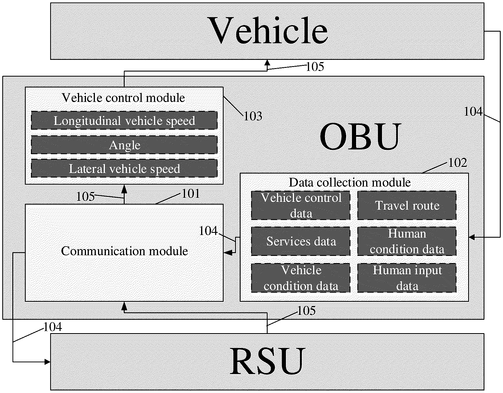 [0171]FIG. 1 shows an exemplary OBU containing a communication module 101, a data collection module 102, and a vehicle control module 103. The data collection module 102 collects data related to a vehicle and a human 104 and then sends it 104 to an RSU through communication module 101. Also, OBU can receive data of RSU 105 through communication module 101. Based on the data of RSU 105, the vehicle control module 103 helps control the vehicle.