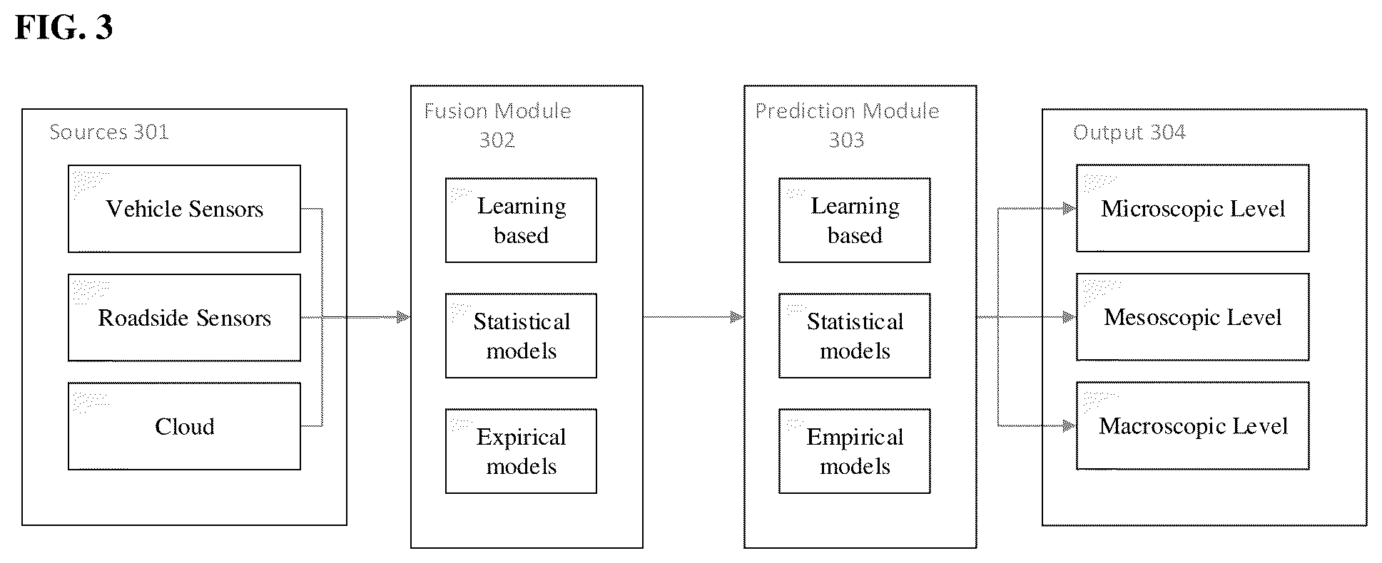 [0174]FIG. 3 illustrates exemplary workflow of a basic prediction process of a lane management sensing system and its data flow. In some embodiments, fused multi-source data collected from vehicle sensors, roadside sensors and the cloud is processed through models including but not limited to learning based models, statistical models, and empirical models. Then predictions are made at different levels including microscopic, mesoscopic, and macroscopic levels using emerging models including learning based, statistic based, and empirical models.