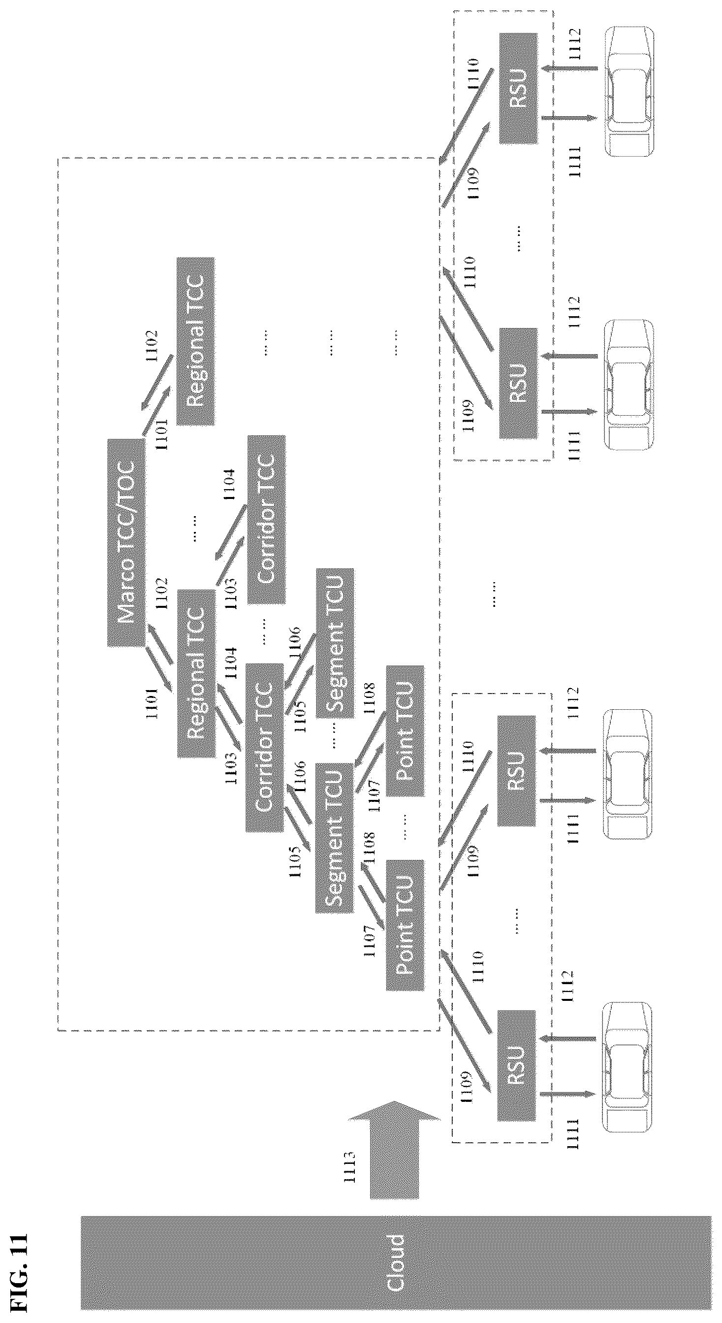 [0182]FIG. 11 show an exemplary structure of a TCC/TCU network. A macroscopic TCC, which may or may not collaborate with an external TOC, manages a certain number of regional TCCs in its coverage area. Similar, a regional TCC manages a certain number of corridor TCCs, a corridor TCC manages a certain number of segment TCUs, a segment TCU manages a certain number of point TCUs, and a point TCUs manages a certain number of RSUs. An RSU sends customized traffic information and control instructions to vehicles and receives information provided by vehicles. The network is supported by the services provided by the cloud.