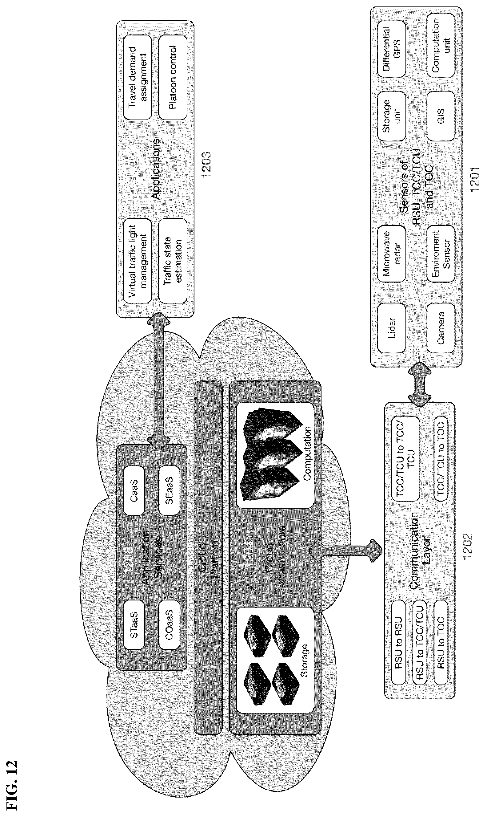 [0183]FIG. 12 shows how an exemplary cloud system communicates with sensors of RSU, TCC/TCU (1201) and TOC through communication layers (1202). The cloud system contains cloud infrastructure (1204), platform (1205), and application service (1206). The application services also support the applications (1203).