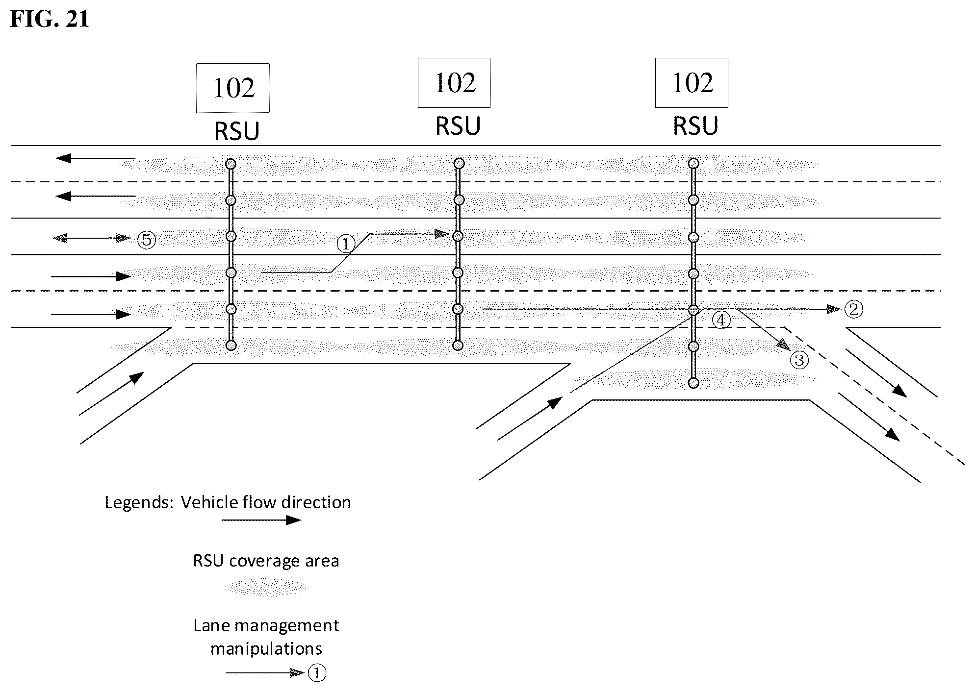 [0232]FIG. 21 shows an exemplary RSU lane management configuration for a freeway segment. The RSU sensing and communication covers each lane of the road segment to fulfill the lane management functions examples (showed in red arrows in figure) including, but not limited to: 1) Lane changing from one lane to another; 2) Merging manipulations from an onramp; 3) Diverging manipulations from highway to offramp; 4) Weaving zone management to ensure safety; and 5) Revisable lane management.