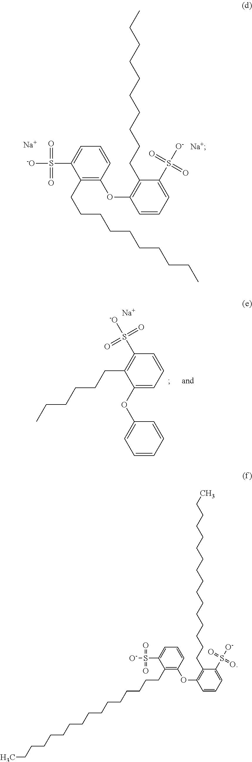 In Table 3, Surfactant 1 was Dowfax® series by Dow Chemical Company. Surfactant 1 were diphenyl disulfonic acid surfactants with different structures.