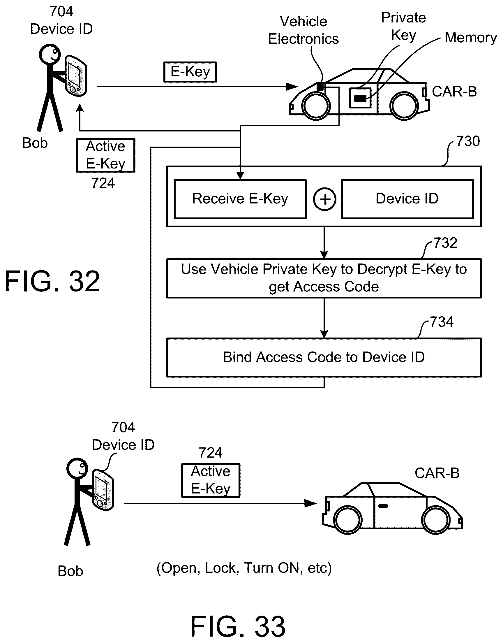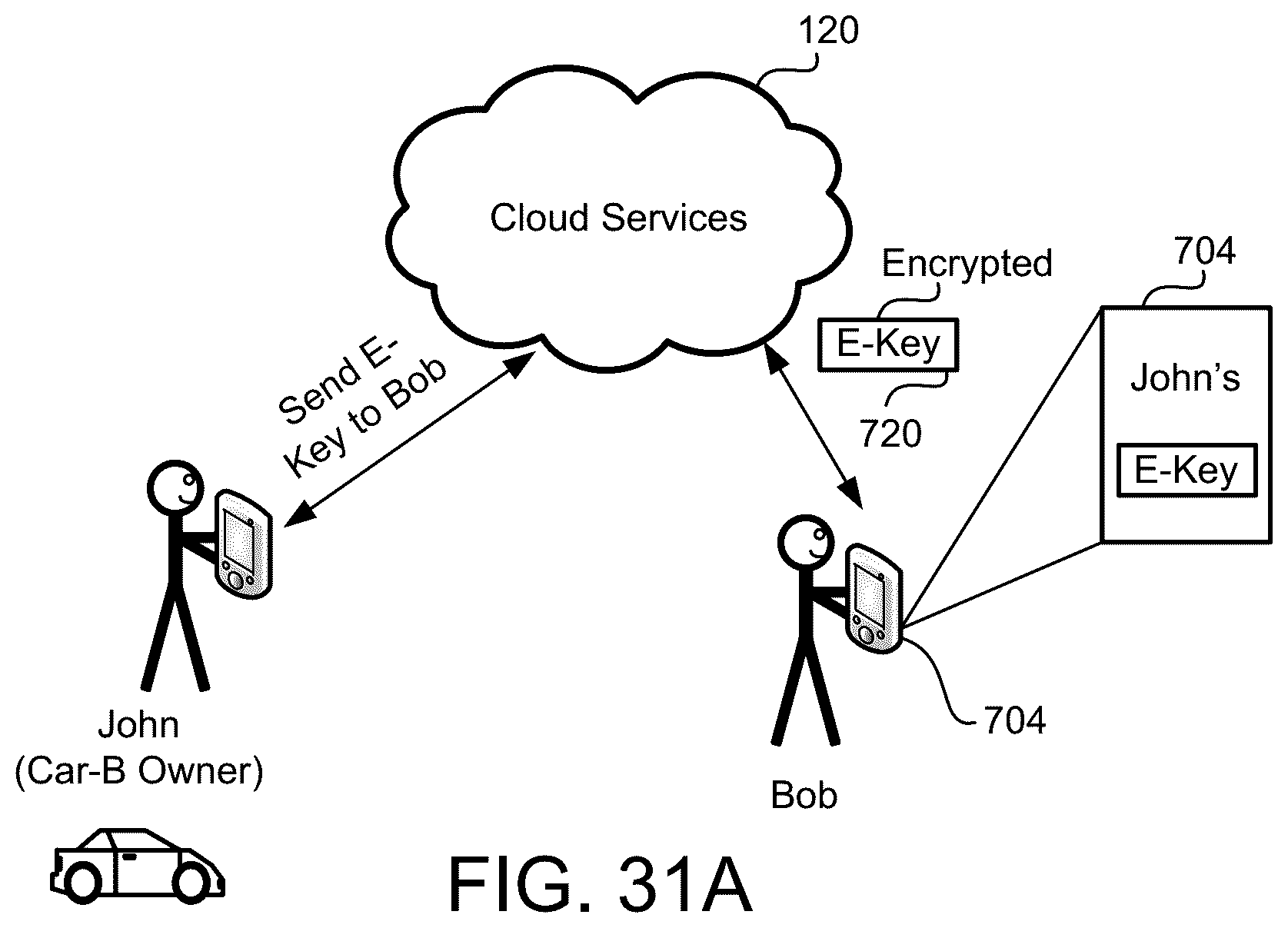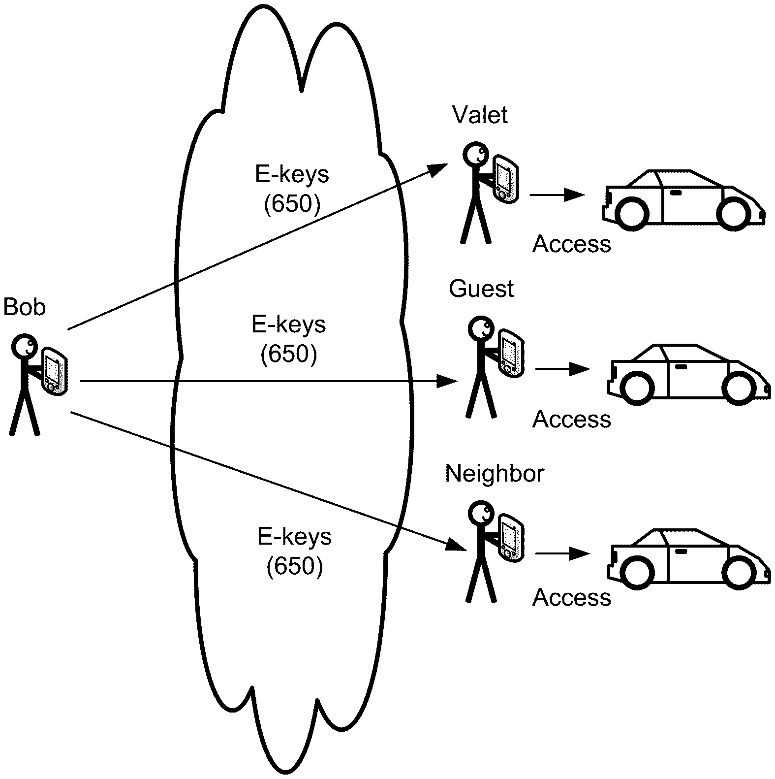 a server associated with a manufacturer of the vehicle, the server is configured to interface with an application provided by the manufacturer of the vehicle, the application provides access to data and logic for enabling sending a request to share the e-key for the vehicle with a recipient device; the request to share is configured to be initiated by a message originating from the recipient device, and responsive to the request, processing the request to securely generate the e-key; the server associated with the manufacturer of the vehicle assisting in enabling the e-key for use on the vehicle by the recipient device. 12. The system of 13. The system of 14. The system of 15. A method for providing access to a vehicle, comprising: