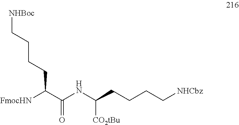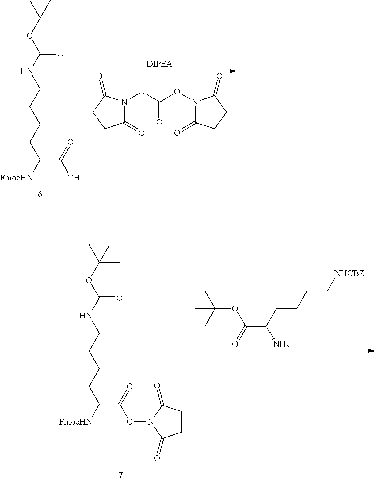 Preparation of tert-Butyl N2-(1-(9H-fluoren-9-yl)-3-oxo-2,7,10,13,16,19,22,25,28-nonaoxa-4-azahentriacontan-31-oyl)-N6-((benzyloxy)carbonyl)-L-lysinate (402). To a stirred mixture of Fmoc-N-amido-PEG-8-acid (663 mg, 1.0 mmol), L-Nε-Z-Lys-OtBu hydrochloride (446 mg, 1.2 mmol) and HATU (456 mg, 1.2 mmol) in DMF (10 mL) was added DIPEA (260 mg, 2.0 mmol), and the reaction was stirred overnight at room temperature under N2. The solvent was removed under reduced pressure and the crude residue was purified by flash chromatography (0-10% MeOH in CH2Cl2) to give compound 2 as a colorless oil (845 mg, 86%). Mass (ESI+): 983.0 [M+H]+. Calc. Mass: 981.5.