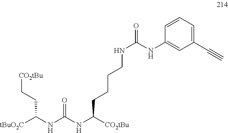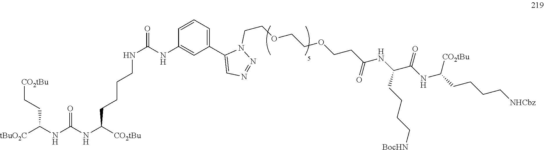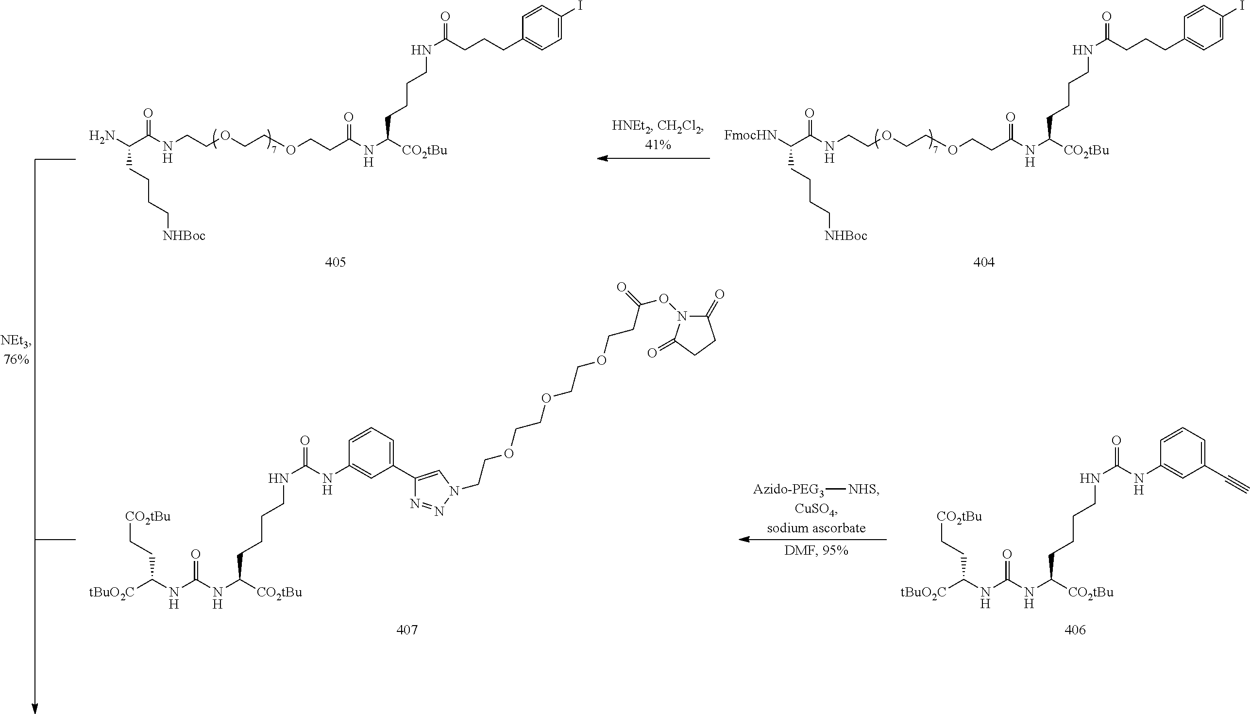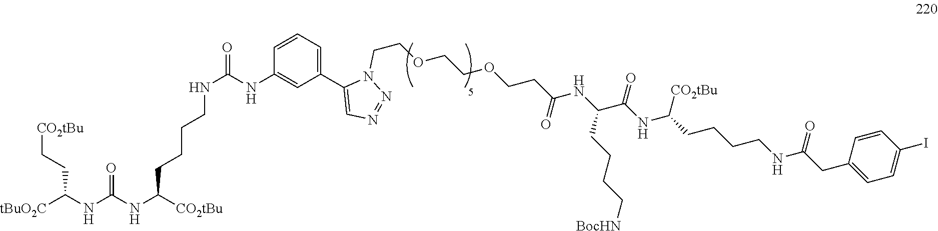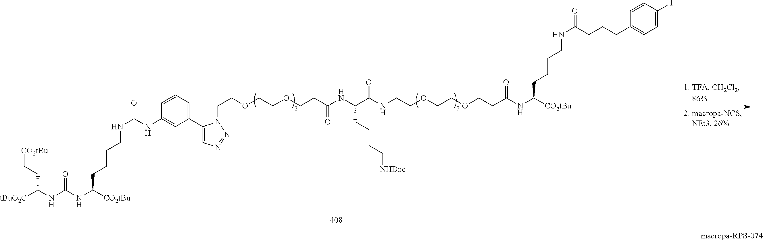 Preparation of di-tert-butyl (((S)-1-(tert-butoxy)-6-(3-(3-(1-((14S,45S)-45-(tert-butoxycarbonyl)-14-(4-((tert-butoxycarbonyl)amino)butyl)-54-(4-iodophenyl)-12,15,43,51-tetraoxo-3,6,9,19,22,25,28,31,34,37,40-undecaoxa-13,16,44,50-tetraazatetrapentacontyl)-1H-1,2,3-triazol-4-yl)phenyl)ureido)-1-oxohexan-2-yl)carbamoyl)-L-glutamate (408). To a solution of amine 405 (25 mg, 22 μmol) in CH2Cl2(4 mL) was added a solution of ester 407 (24 mg, 25 μmol) and TEA (7 μL, 50 μmol) in CH2Cl2(1 mL). The reaction was stirred for 5 h at room temperature under Ar. Then the reaction was concentrated under reduced pressure and the crude residue was dissolved in EtOAc (1 mL) and purified by prep TLC (90% EtOAc in hexanes) to give compound 408 as a pale oil (33 mg, 76%). Mass (ESI+): 994.3 [(M+2H)/2]+. Calc. Mass: 1986.2.