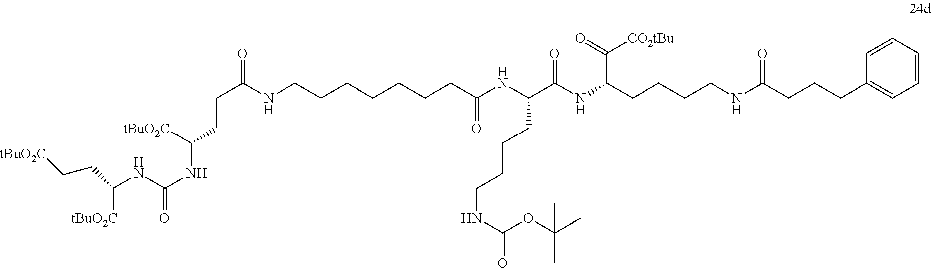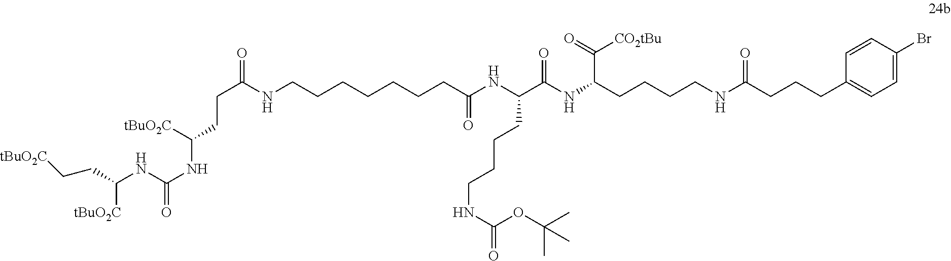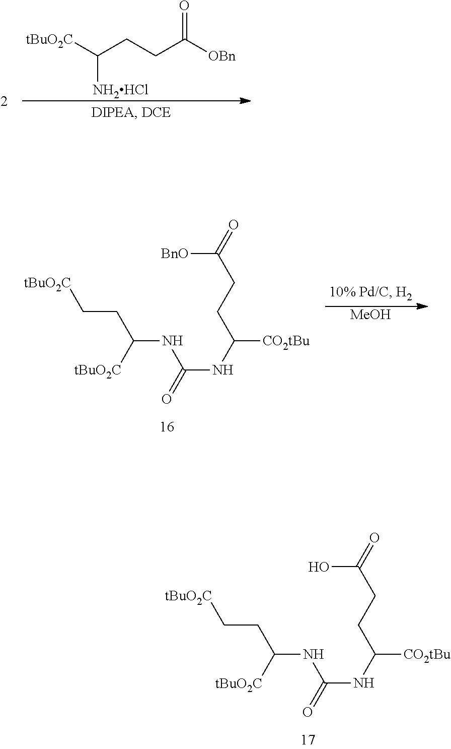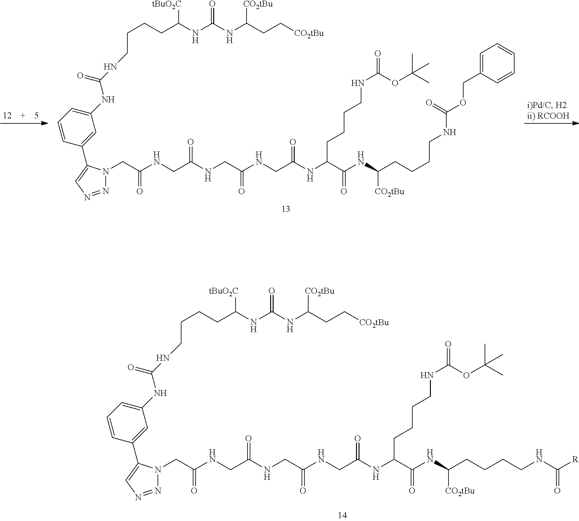 Preparation of di-tert-butyl (((S)-1-(tert-butoxy)-6-(3-(3-(1-((14S,45S)-45-(tert-butoxycarbonyl)-14-(4-((tert-butoxycarbonyl)amino)butyl)-54-(4-iodophenyl)-12,15,43,51-tetraoxo-3,6,9,19,22,25,28,31,34,37,40-undecaoxa-13,16,44,50-tetraazatetrapentacontyl)-1H-1,2,3-triazol-4-yl)phenyl)ureido)-1-oxohexan-2-yl)carbamoyl)-L-glutamate (408). To a solution of amine 405 (25 mg, 22 μmol) in CH2Cl2(4 mL) was added a solution of ester 407 (24 mg, 25 μmol) and TEA (7 μL, 50 μmol) in CH2Cl2(1 mL). The reaction was stirred for 5 h at room temperature under Ar. Then the reaction was concentrated under reduced pressure and the crude residue was dissolved in EtOAc (1 mL) and purified by prep TLC (90% EtOAc in hexanes) to give compound 408 as a pale oil (33 mg, 76%). Mass (ESI+): 994.3 [(M+2H)/2]+. Calc. Mass: 1986.2.