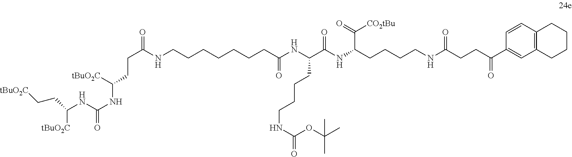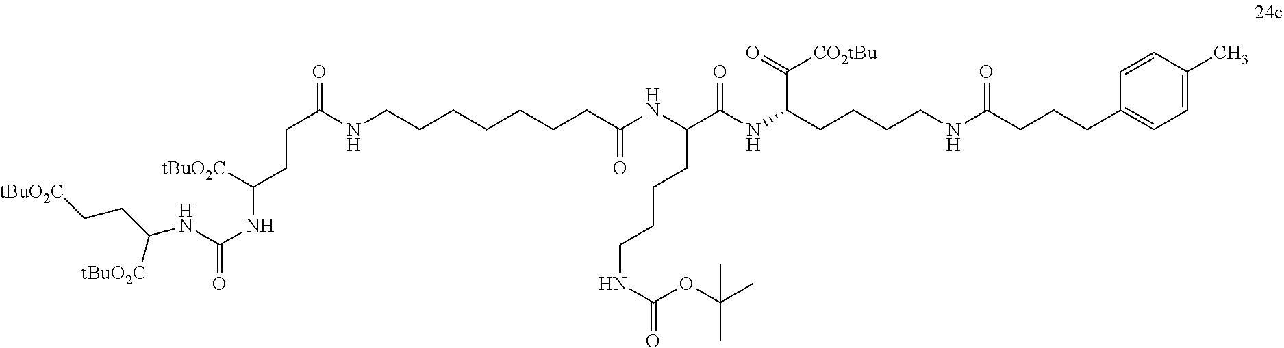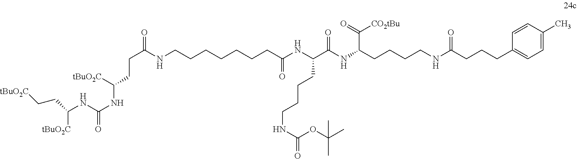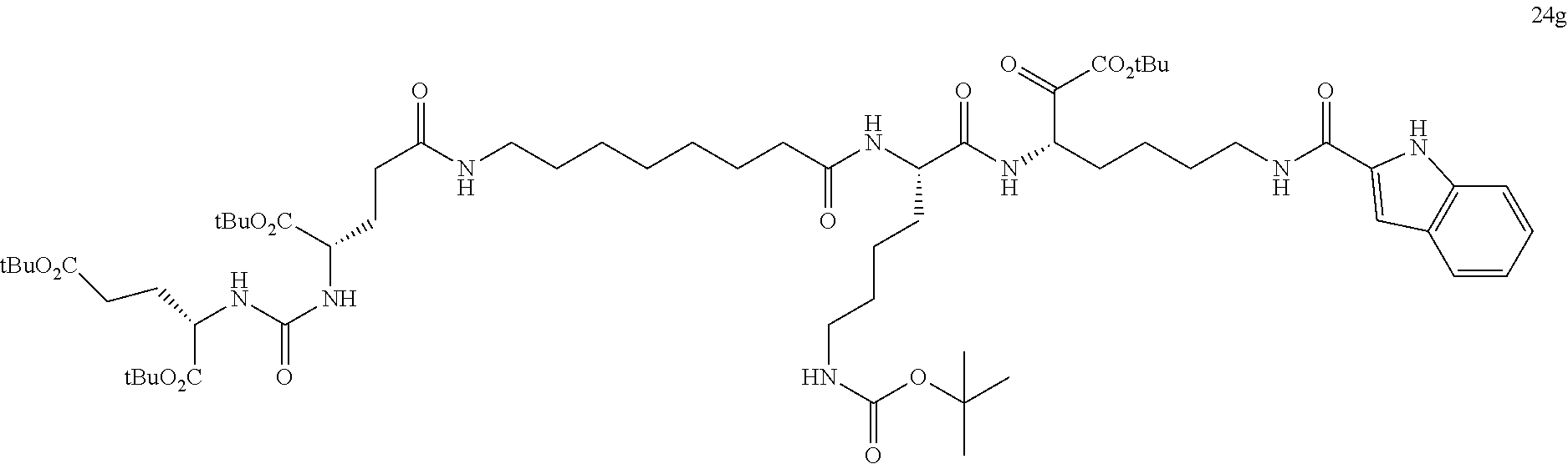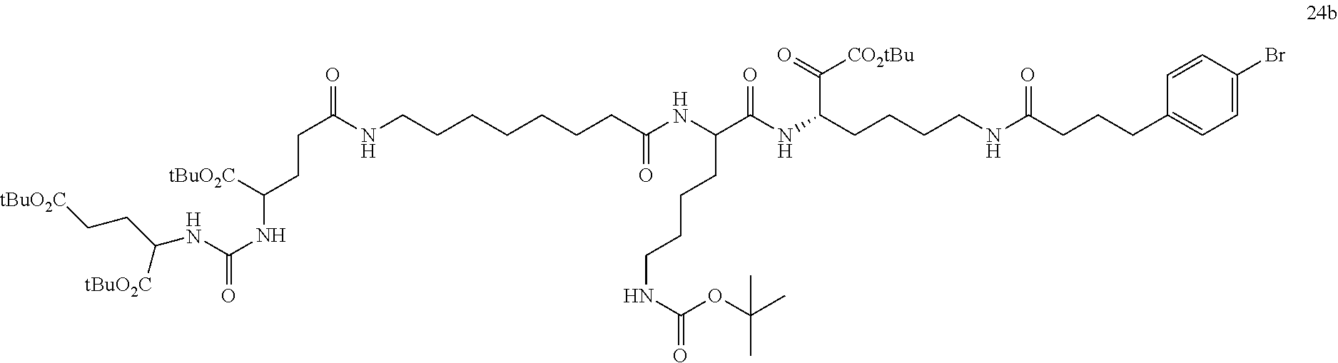 Preparation of di-tert-butyl (((S)-1-(tert-butoxy)-6-(3-(3-(1-((14S,45S)-45-(tert-butoxycarbonyl)-14-(4-((tert-butoxycarbonyl)amino)butyl)-54-(4-iodophenyl)-12,15,43,51-tetraoxo-3,6,9,19,22,25,28,31,34,37,40-undecaoxa-13,16,44,50-tetraazatetrapentacontyl)-1H-1,2,3-triazol-4-yl)phenyl)ureido)-1-oxohexan-2-yl)carbamoyl)-L-glutamate (408). To a solution of amine 405 (25 mg, 22 μmol) in CH2Cl2(4 mL) was added a solution of ester 407 (24 mg, 25 μmol) and TEA (7 μL, 50 μmol) in CH2Cl2(1 mL). The reaction was stirred for 5 h at room temperature under Ar. Then the reaction was concentrated under reduced pressure and the crude residue was dissolved in EtOAc (1 mL) and purified by prep TLC (90% EtOAc in hexanes) to give compound 408 as a pale oil (33 mg, 76%). Mass (ESI+): 994.3 [(M+2H)/2]+. Calc. Mass: 1986.2.