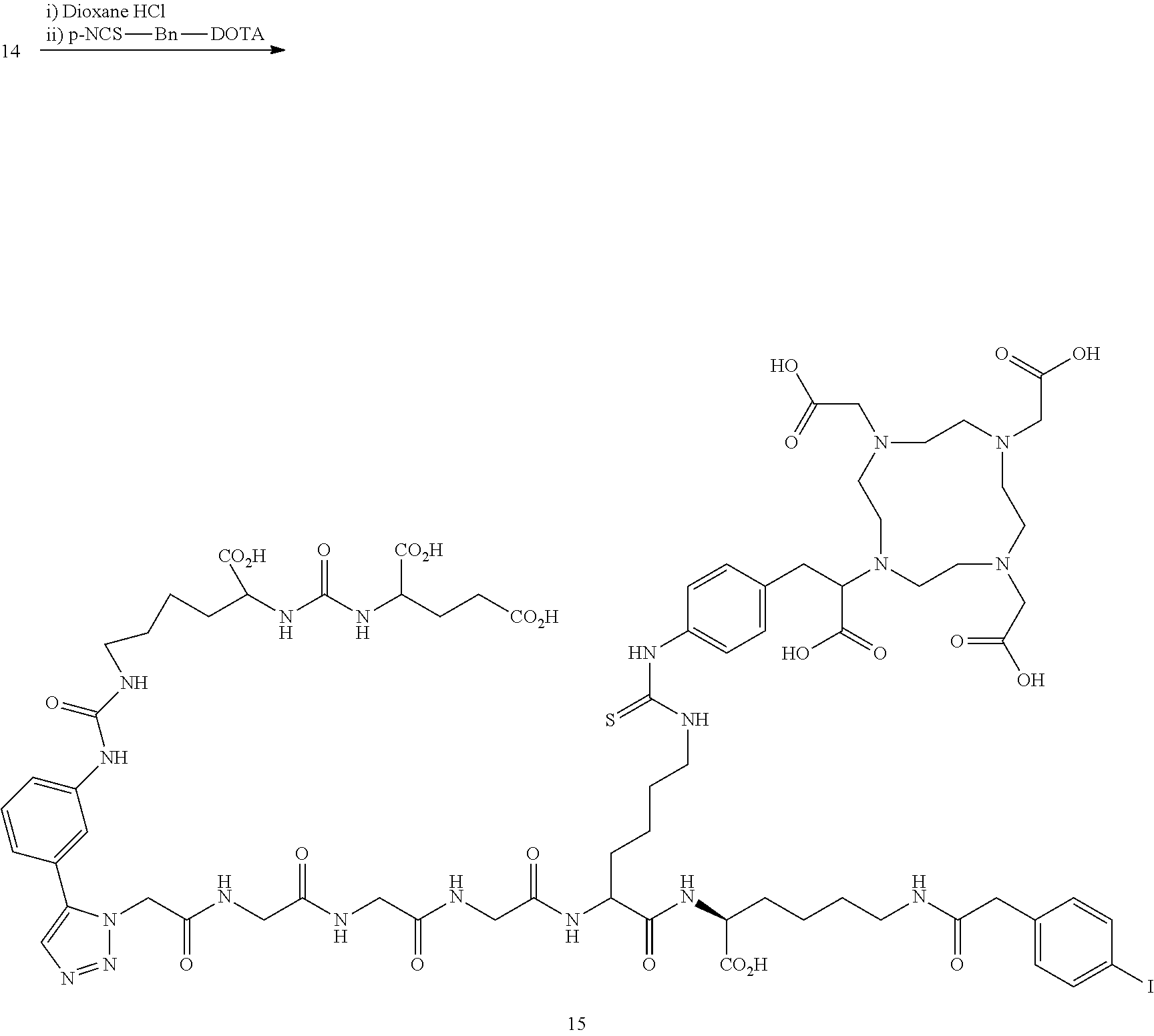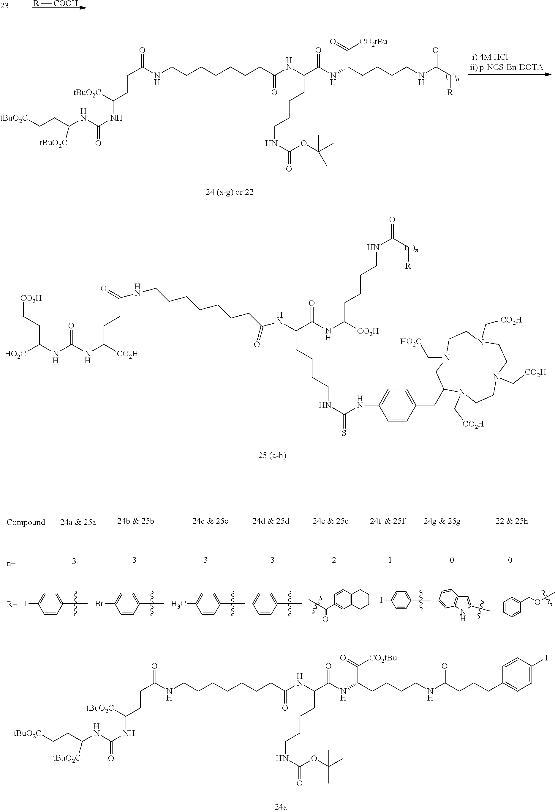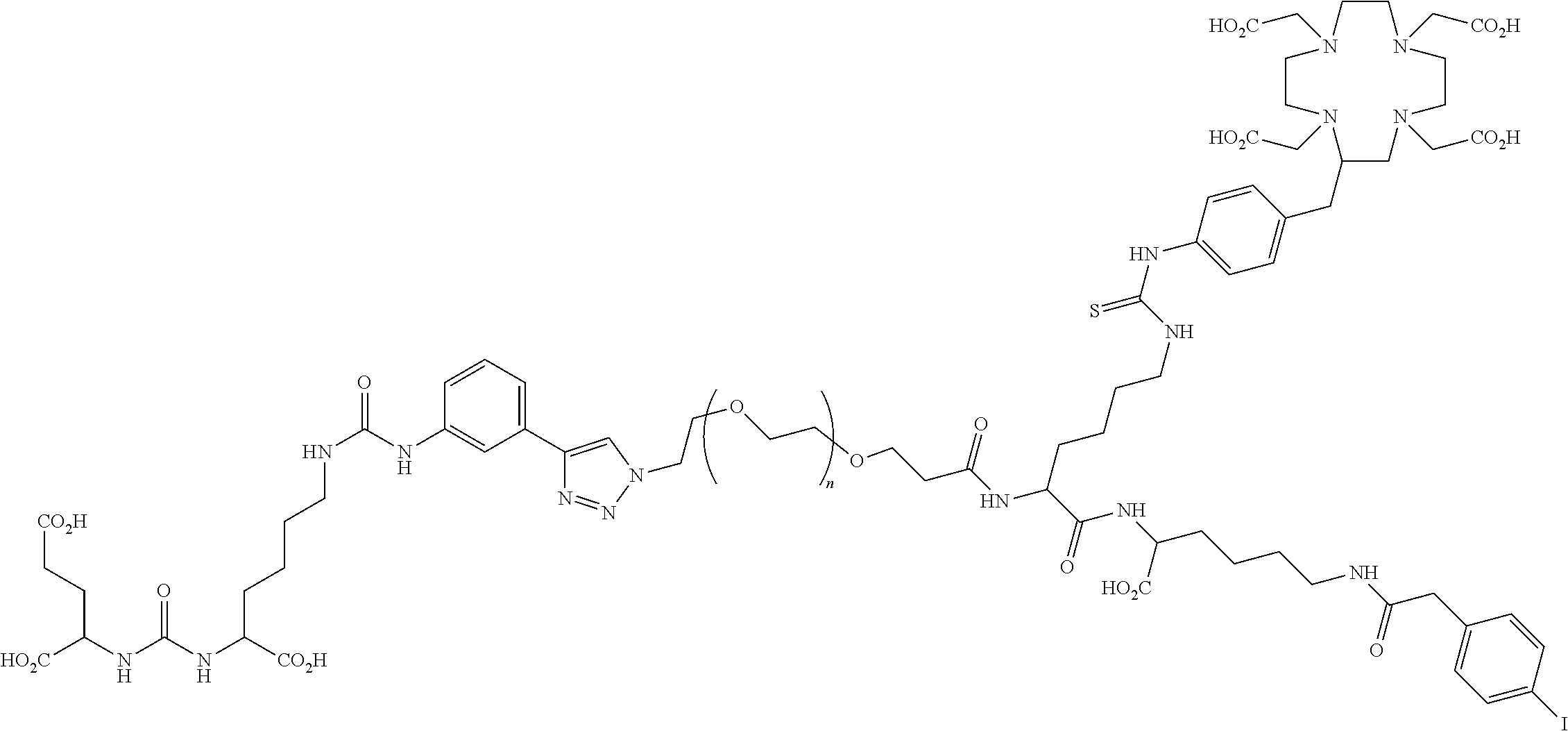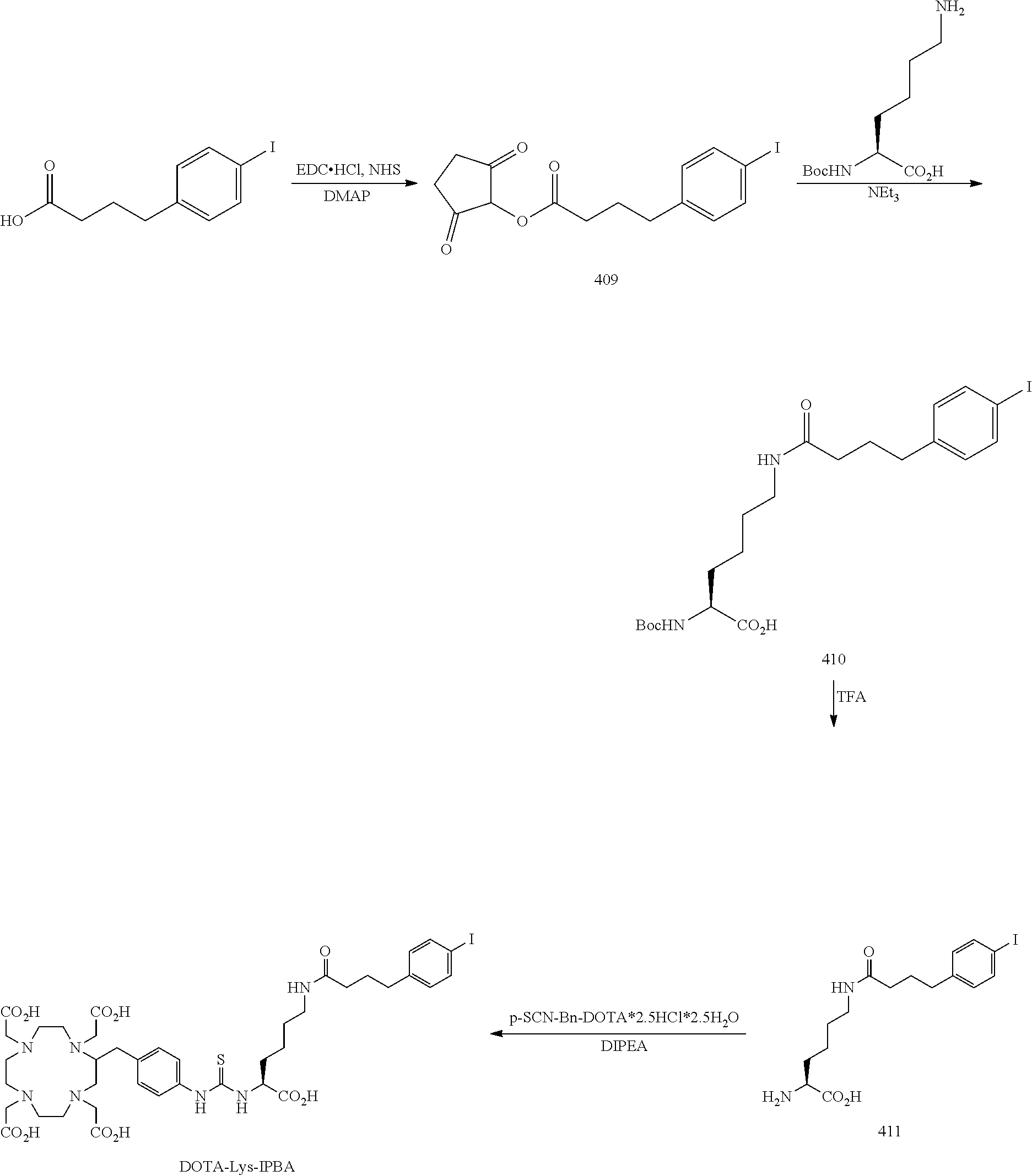 Preparation of 2,2′,2″,2′″-(2-(4-(3-((S)-1-carboxy-5-(4-(4-iodophenyl)butanamido)pentyl)thioureido)benzyl)-1,4,7,10-tetraazacyclododecane-1,4,7,10-tetrayl)tetraacetic acid (DOTA-Lys-IPBA). To a solution of Lys-IPBA (11 mg, 26 μmol) and DIPEA (17 μL, 100 μmol) in DMF (1 mL) was added a solution of p-SCN-Bn-DOTA·2·5Cl·2·5H2O (8 mg, 11.6 μmol) in H2O (1 mL). The reaction was stirred at room temperature for 4 h. The solvent was removed under reduced pressure and the crude residue was purified by prep HPLC. The peak corresponding to the product was collected and lyophilized to give DOTA-Lys-IPBA as a white powder (5 mg, 43%).1H NMR (DMSO, 500 MHz): δ 9.72 (br s, 1H), 7.89 (d, 2H, J=7.6 Hz), 7.77 (m, 1H), 7.61 (d, 2H, J=7.1 Hz), 7.51 (d, 2H, J=7.8 Hz), 7.24 (m, 2H), 6.99 (d, 2H, J=7.8 Hz), 4.84 (m, 1H), 3.70-3.04 (m, 14H), 3.01 (m, 4H), 2.02 (t, 2H, J=7.1 Hz), 1.76 (m, 4H), 1.39 (m, 2H), 1.31 (m, 2H). Mass (ESI+): 971.0 (M+H)+. Calc. Mass: 969.9.