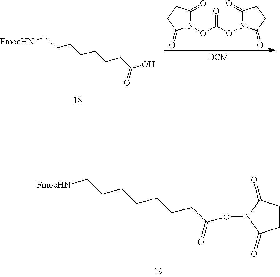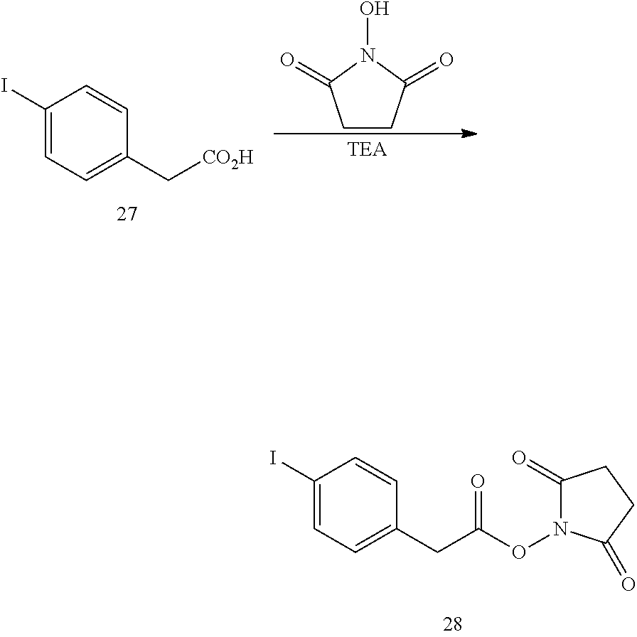 Preparation of 2,5-dioxopyrrolidin-1-yl 4-(4-iodophenyl)butanoate (409). A solution of 4-(4-iodophenyl)butanoic acid (1.16 g, 4.0 mmol), N-hydroxysuccinimide (483 mg, 4.2 mmol), EDC·HCl (768 mg, 4.0 mmol) and 4-DMAP (5.8 mg, 47 μmol) in CH2Cl2(30 mL) was stirred for 20 h. Then the reaction mixture was washed successively with 1M HCl, saturated NaHCO3and brine. The organic layer was dried over MgSO4, filtered and concentrated under reduced pressure to give NHS ester 409 as a white powder (1.29 g, 83%).1H NMR (CDCl3, 500 MHz): δ 7.61 (d, 2H, J=7.2 Hz). 6.95 (d, 2H, J=7.6 Hz), 2.83 (s, 4H), 2.67 (t, 2H, J=7.6 Hz), 2.59 (t, 2H, J=7.3 Hz), 2.03 (quint, 2H, J=7.3 Hz).